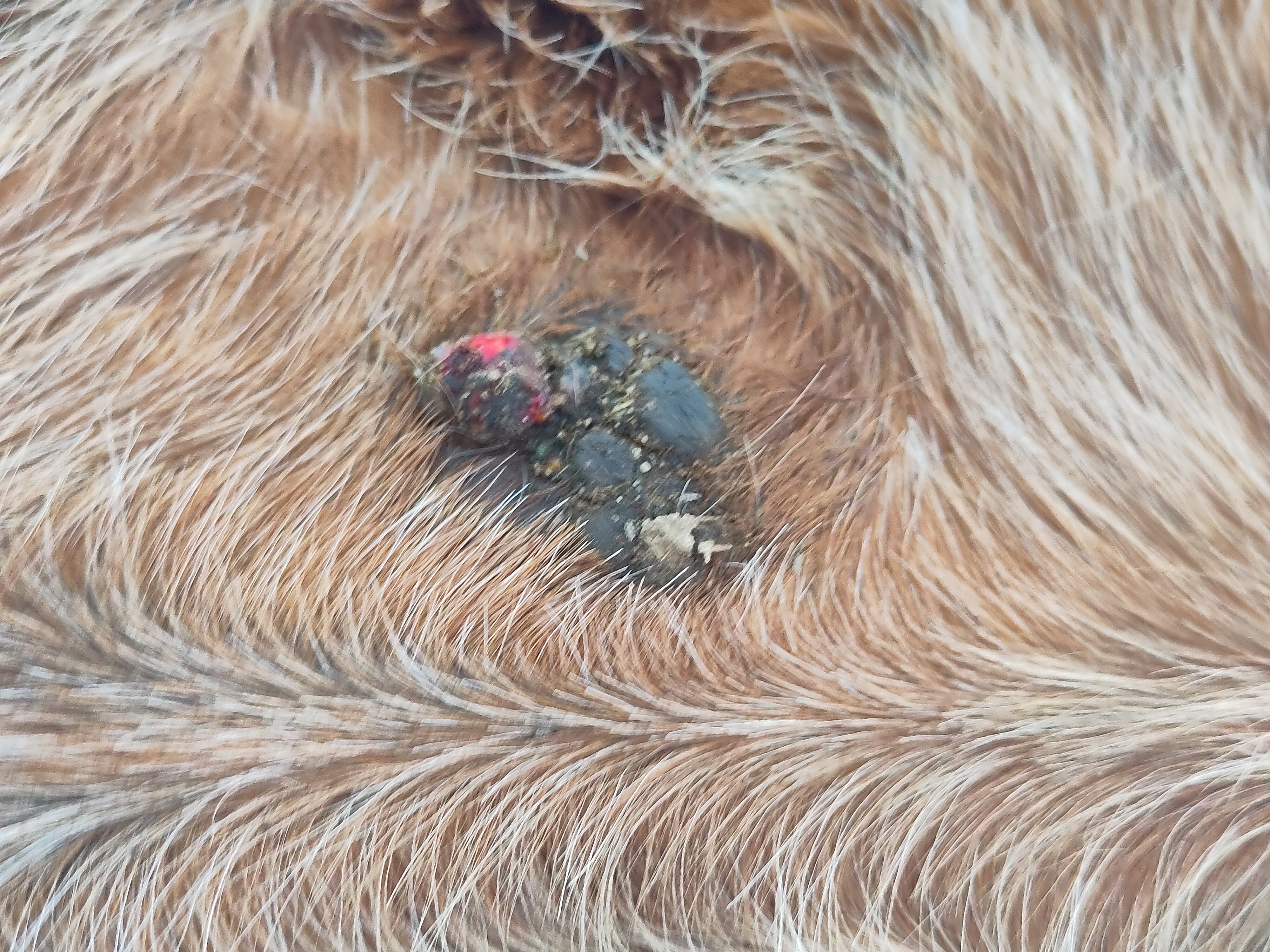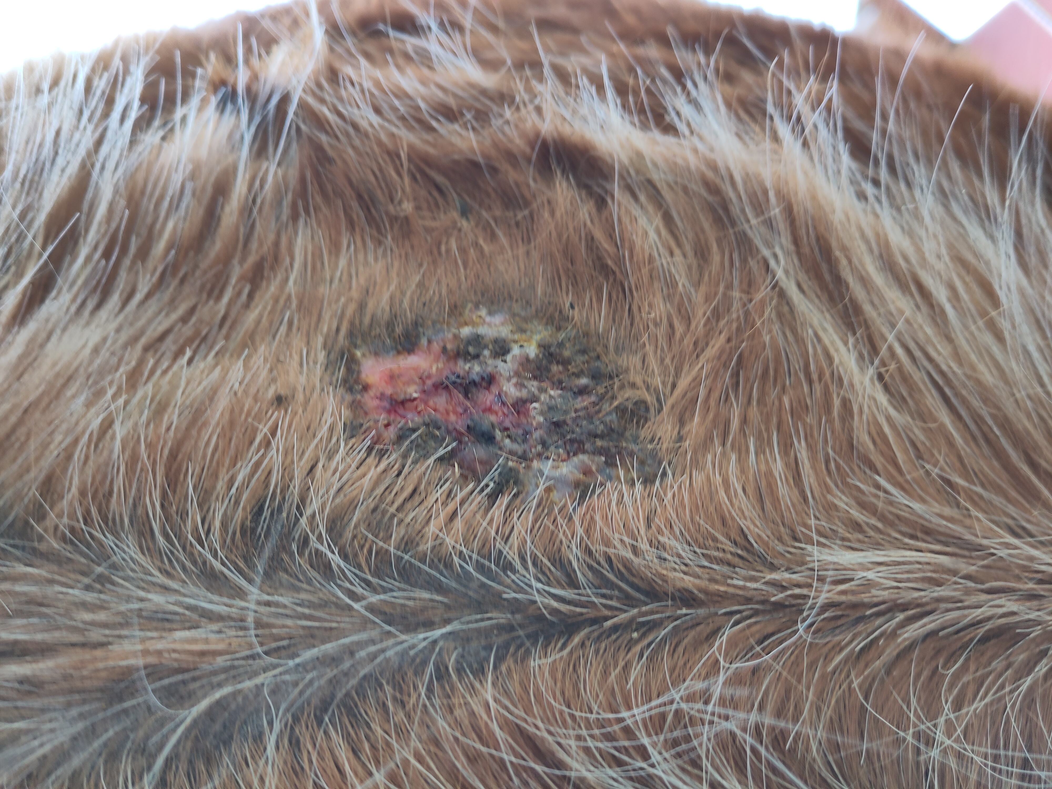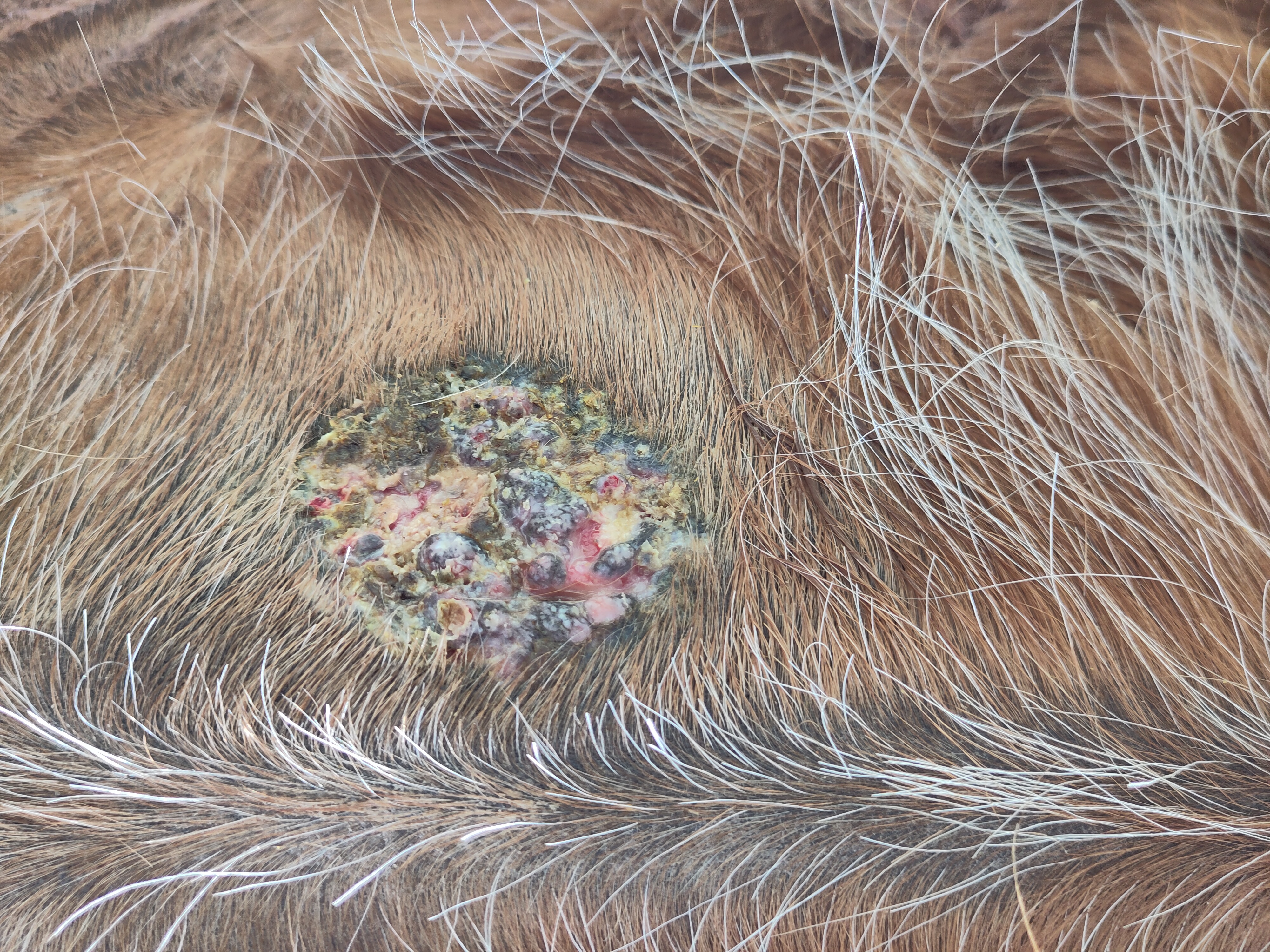 Kleines Update: nachdem es gestern Abend wieder fast vollständig verkrustet war und ich schon damit gerechnet hatte, dass es jetzt erstmal ein paar Tage dauert, bis sich wieder was tut, ist heute Morgen ein großes Stück Kruste beim Säubern abgegangen. Die restliche Kruste fühlte sich auch relativ lose an, aber kam noch nicht mit runter. Wir sind weiterhin bei der 1:1 Verdünnung und sie lässt mich weiterhin gut schmieren. Danach tritt sie jedes mal kurz in Richtung Sarkoid, aber sie lässt sich gut durch Futter etc ablenken.