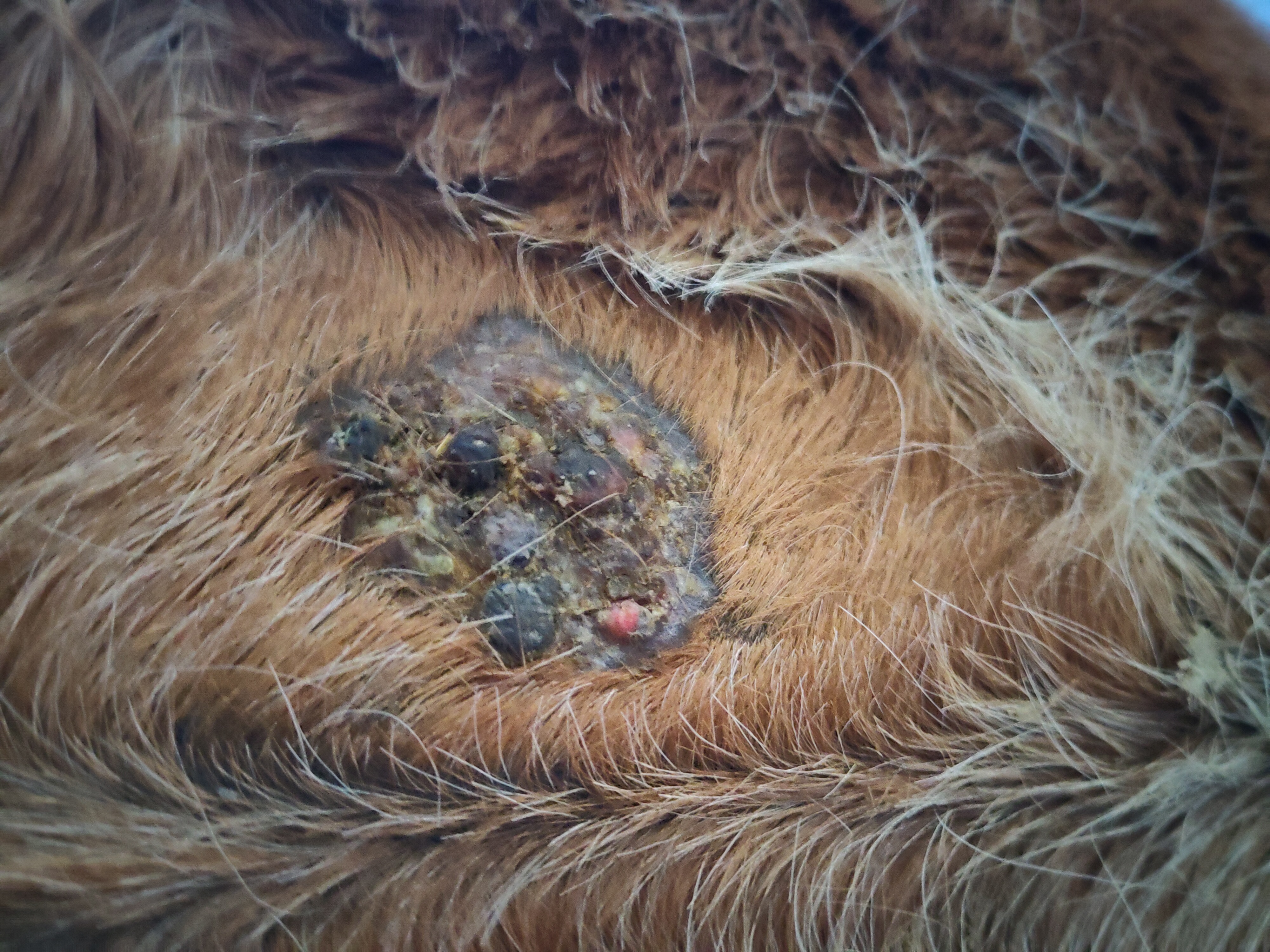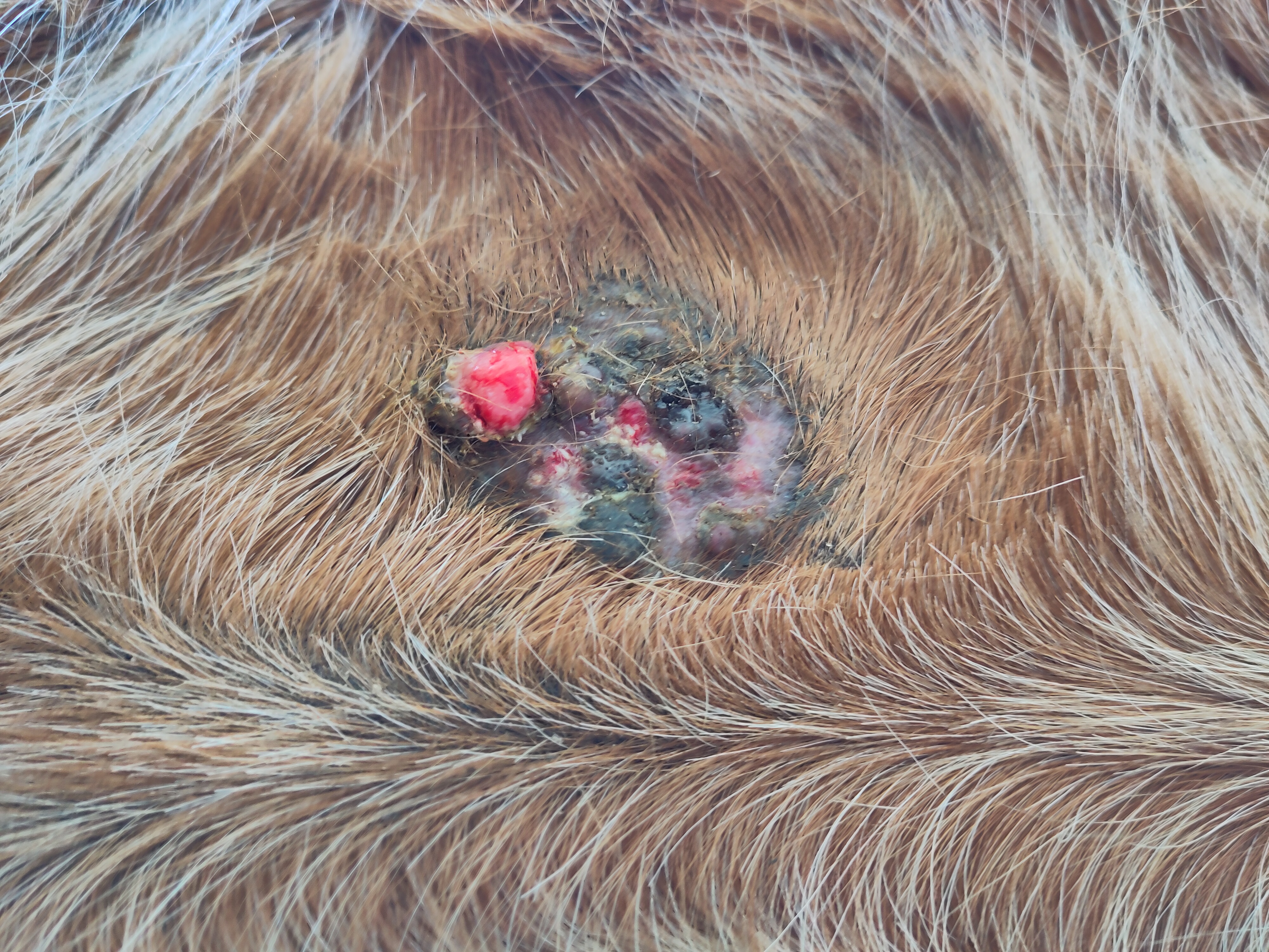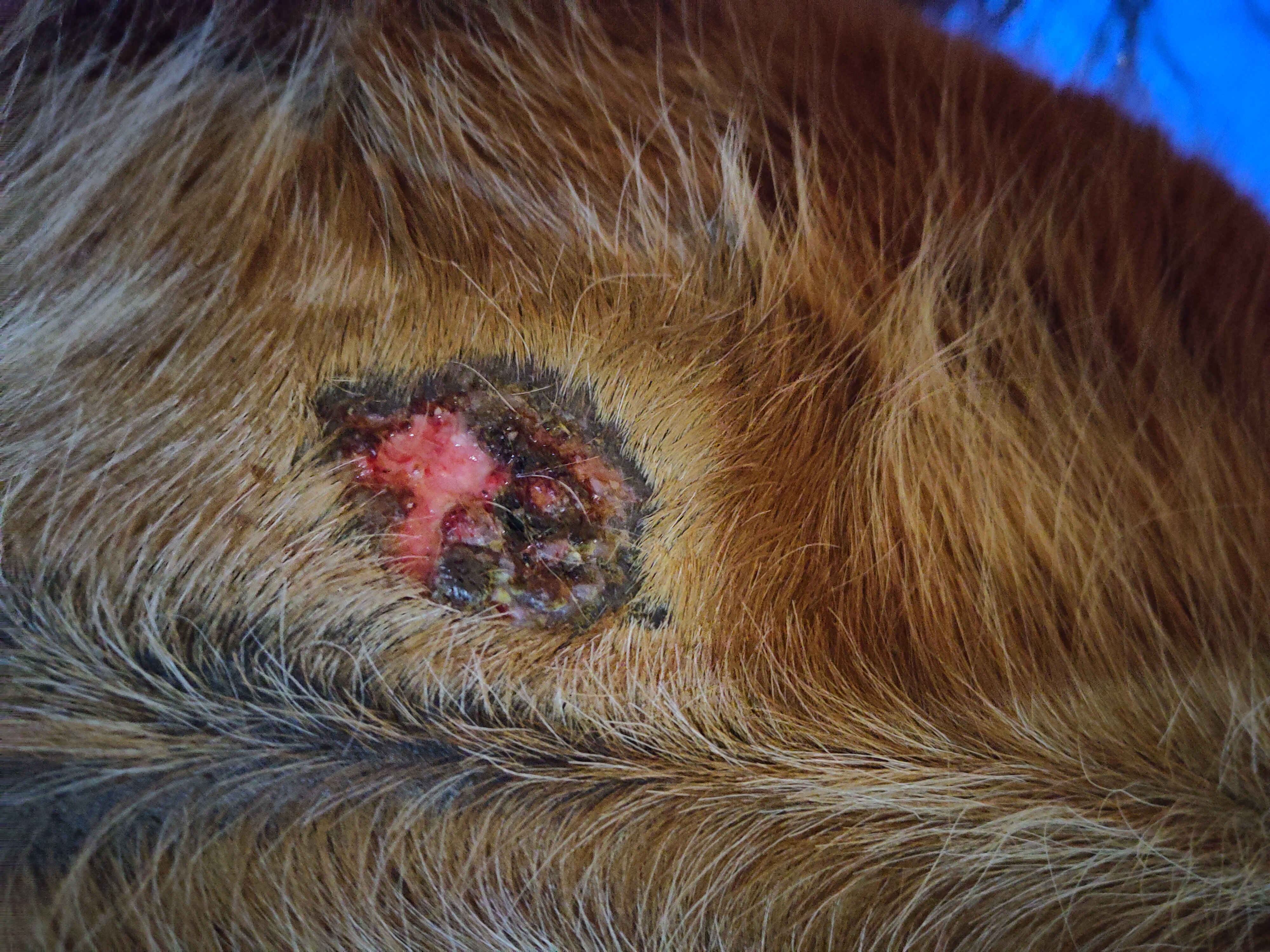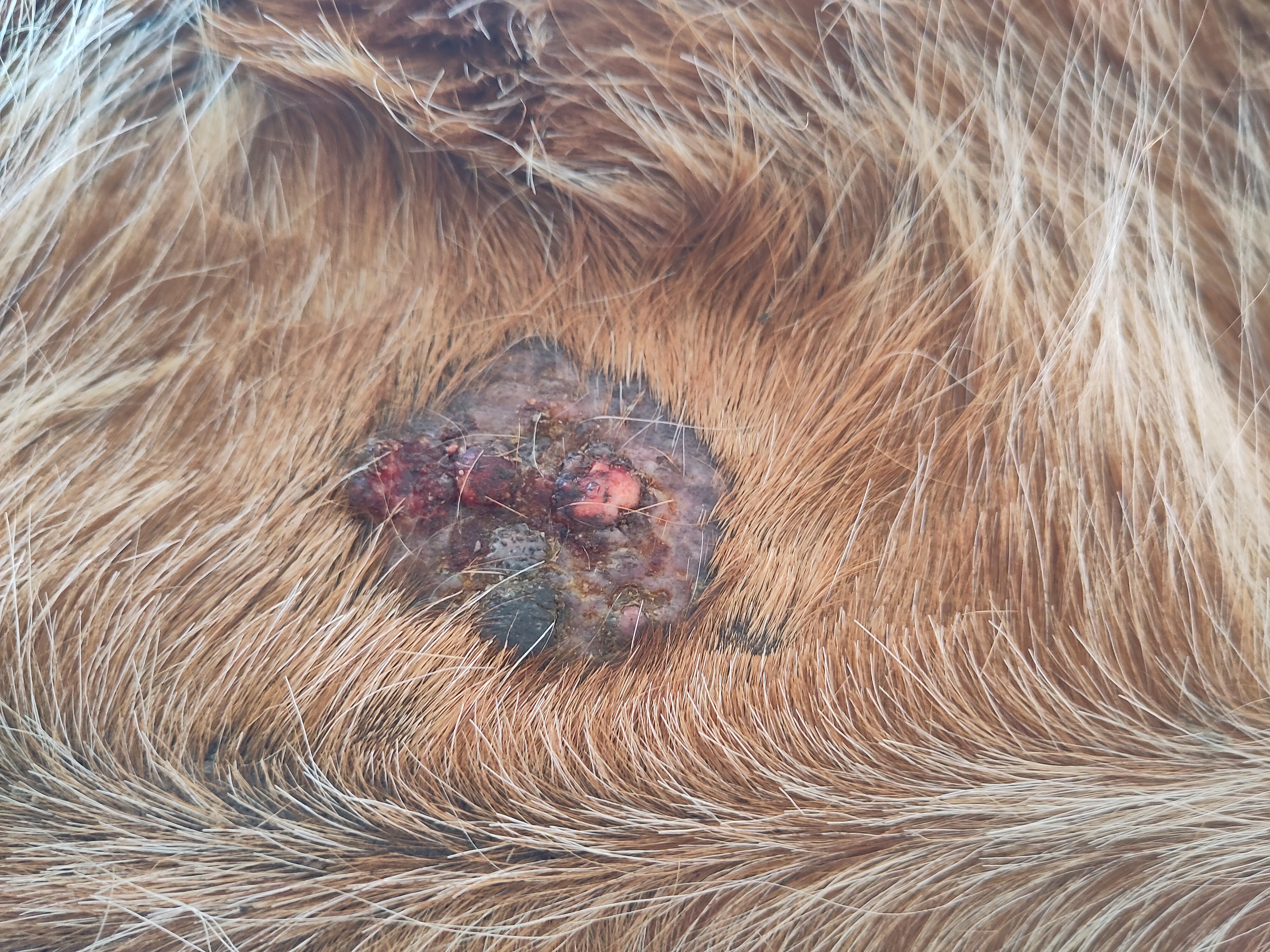 Nun ist es aber mittlerweile so, dass eine der Krusten regelmäßig auf geht und das Sarkoid jedes Mal ein bisschen größer wird.