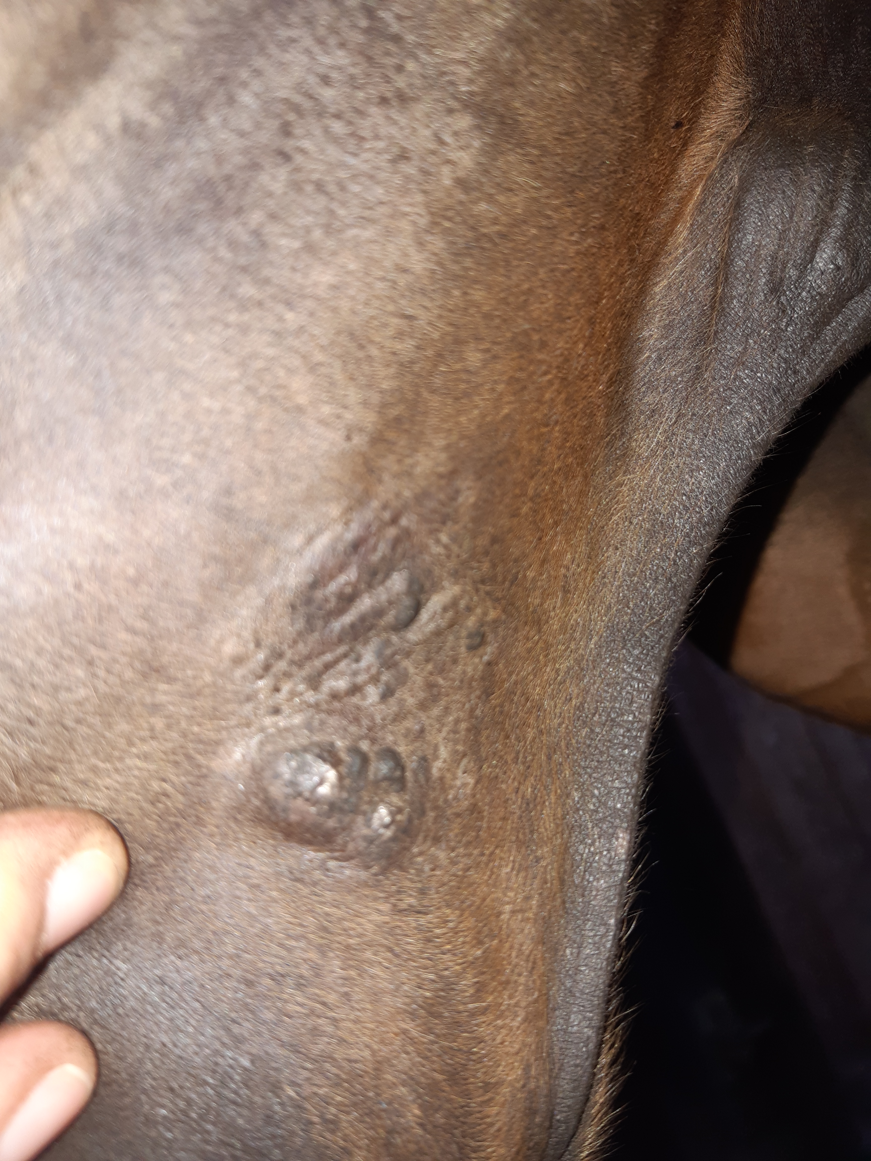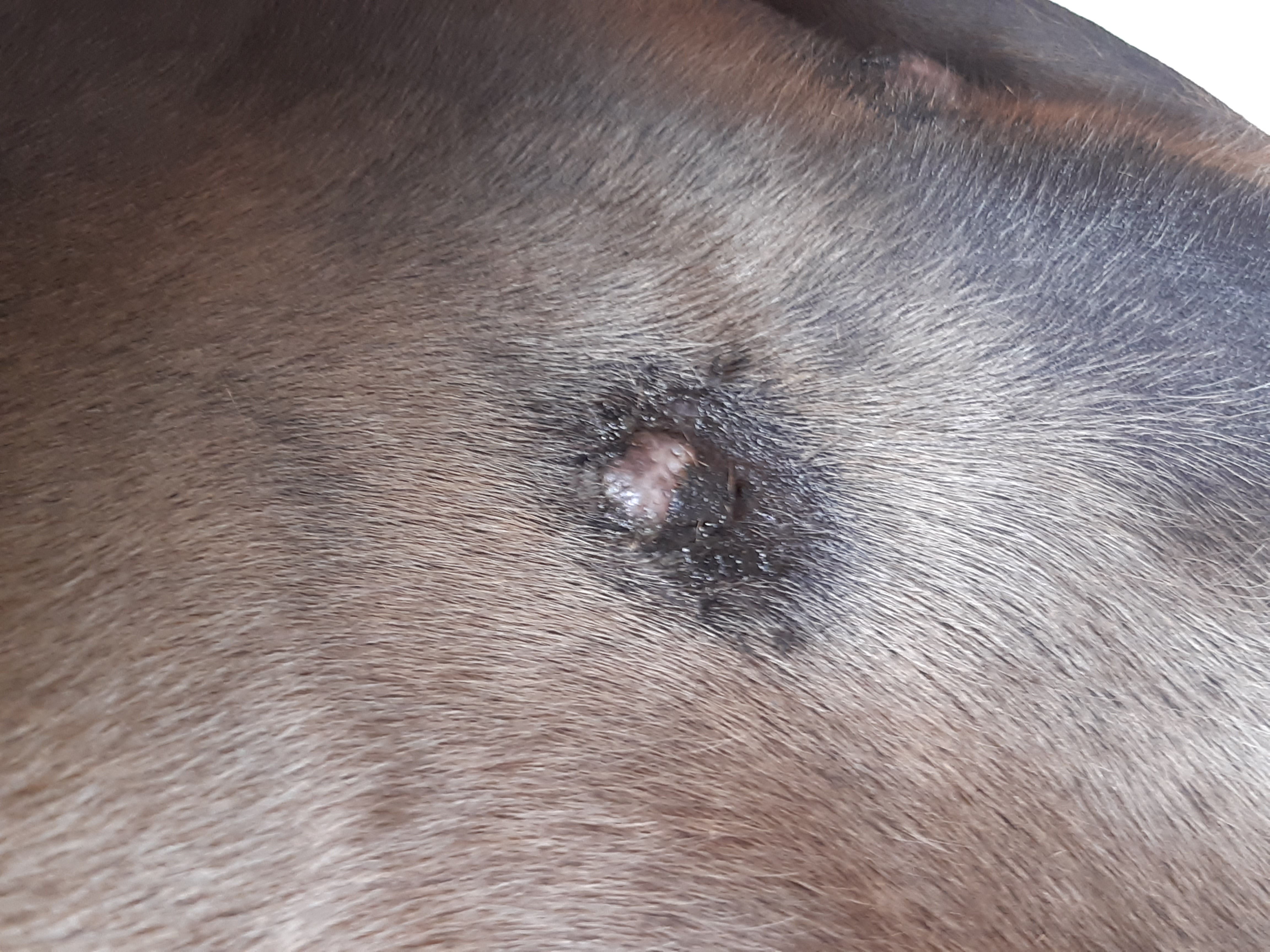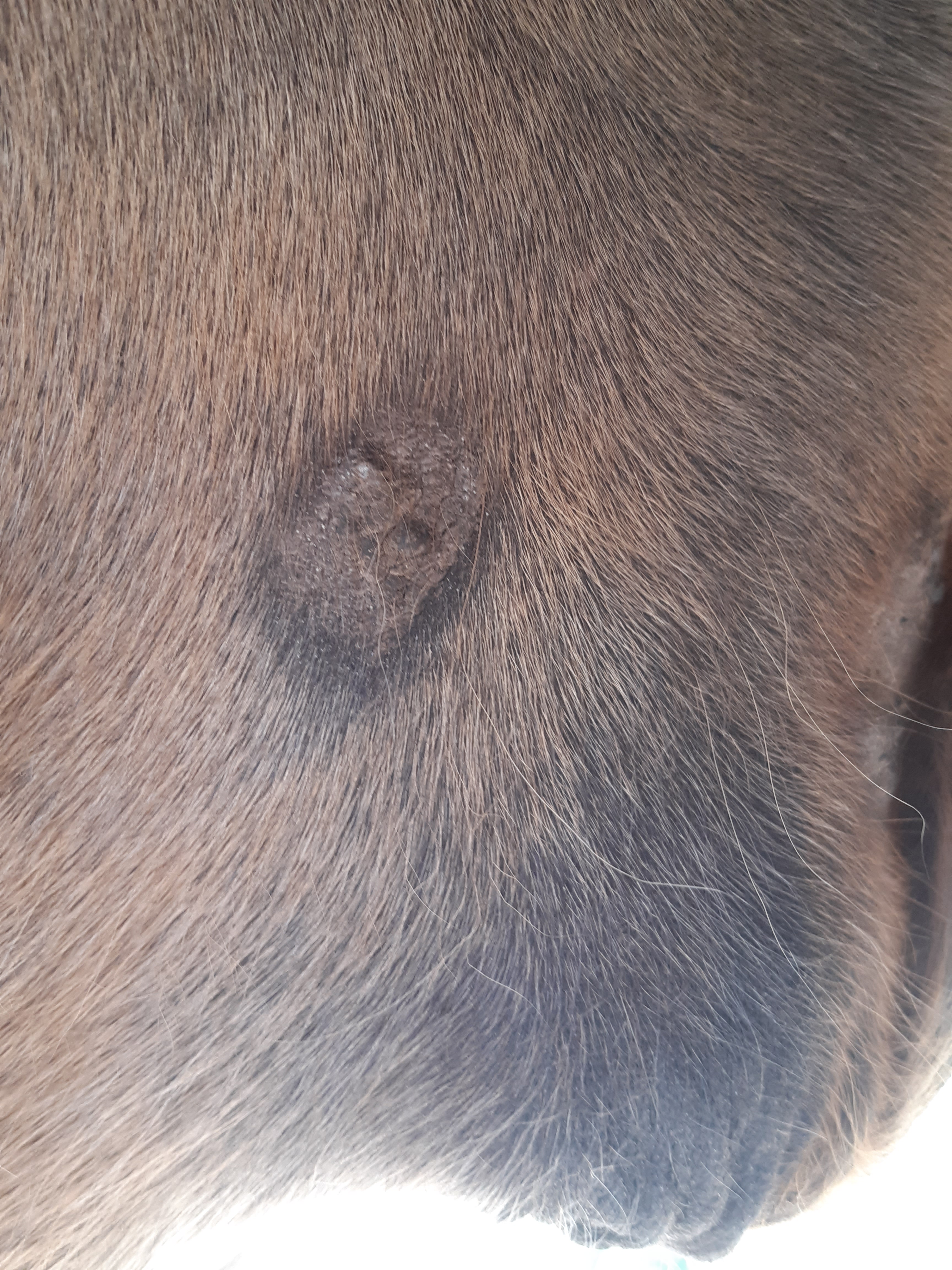 Die Tierärztin hat das erste Mal ca. 2020 draufgeschaut und sagte, es könnte ein Sarkoid sein, genau definieren könne sie das aber erst nach einer Probenentnahme, wozu sie aber nicht raten würde, da die Dinger dann oft wuchern. Solange es nicht wächst oder Sterni stört / beeinträchtigt, wäre es nicht so schlimm. Das Sarkoid wächst inzwischen aber deutlich und verändert sich auch optisch (s. Fotos).