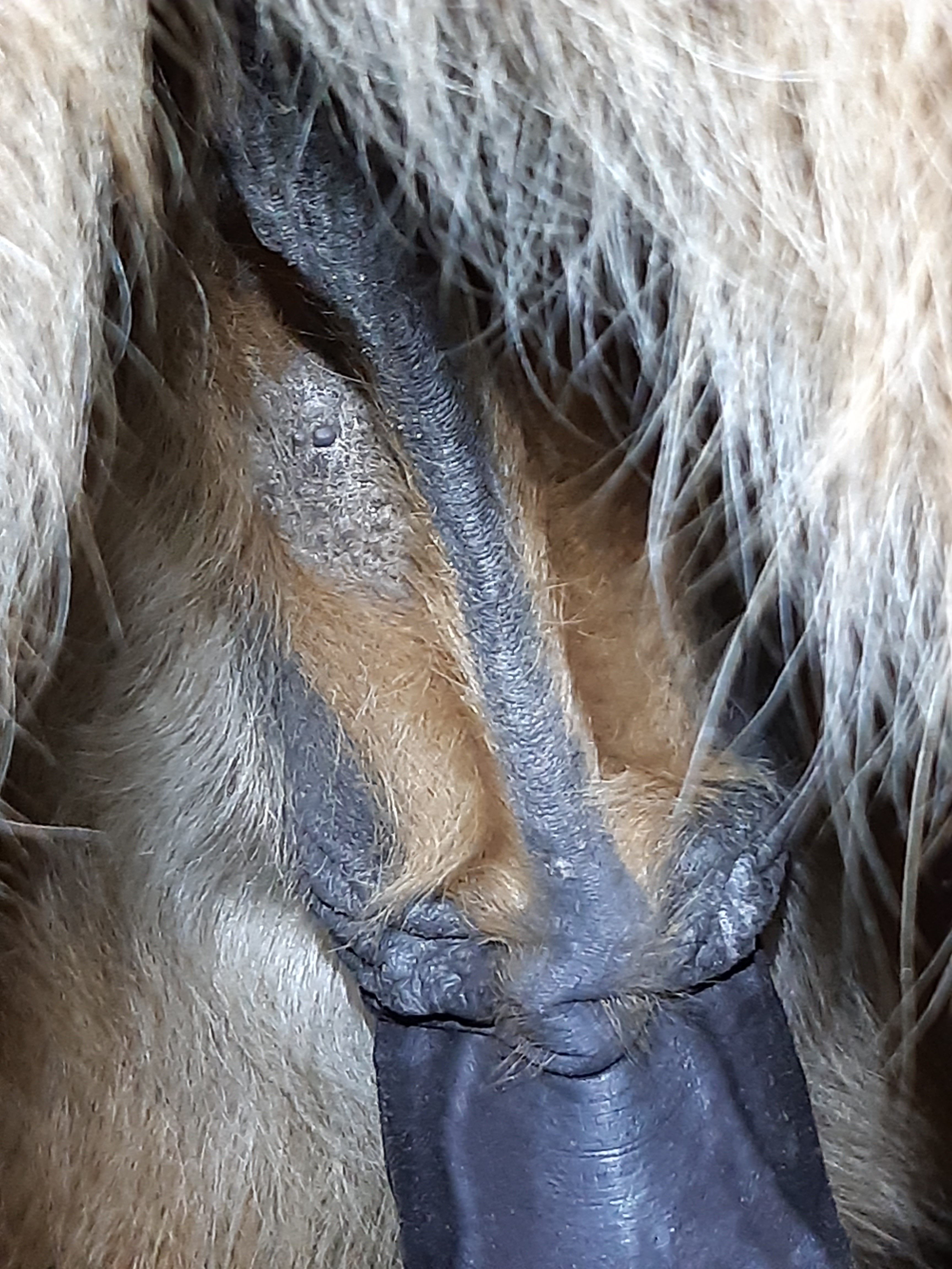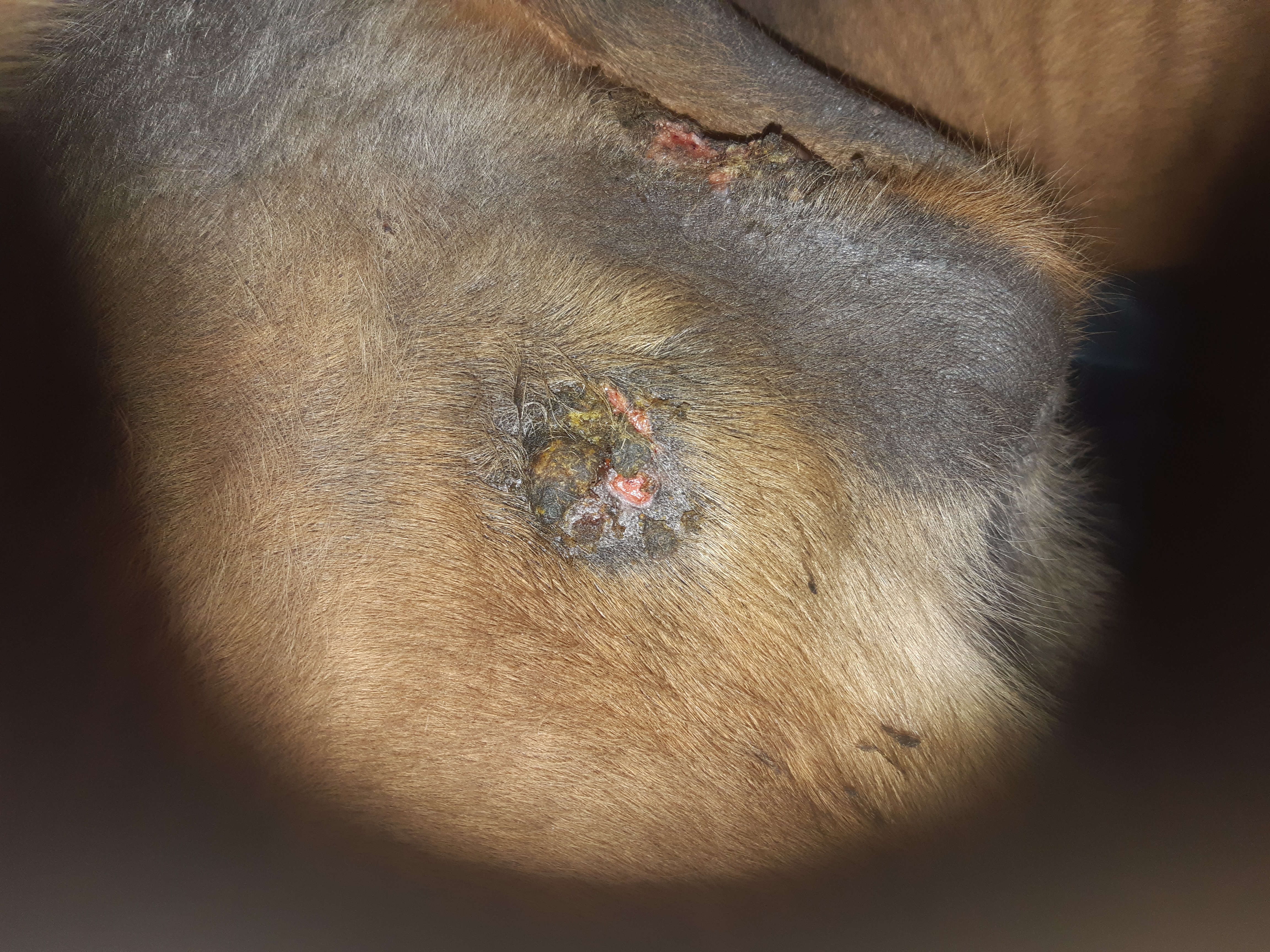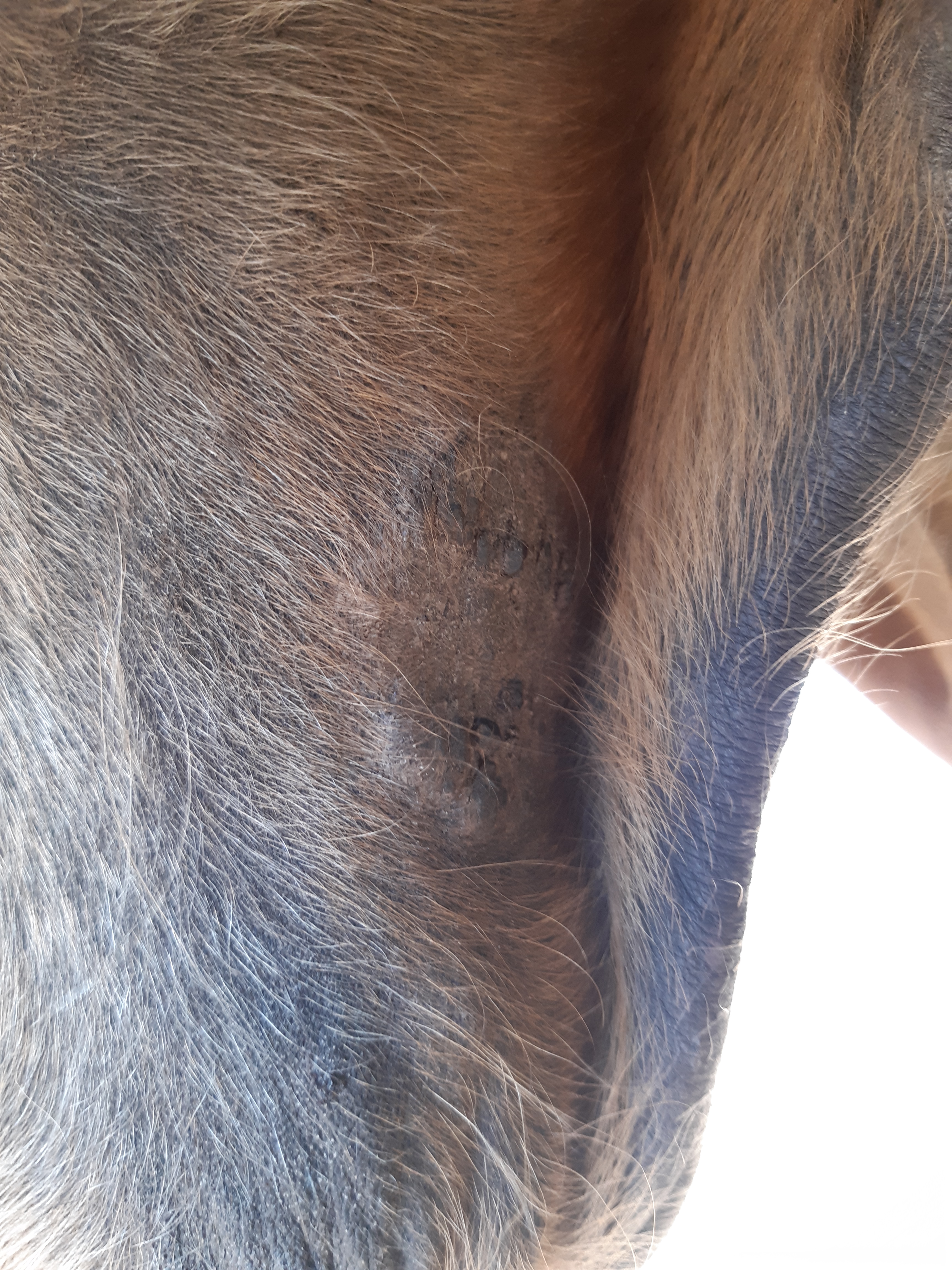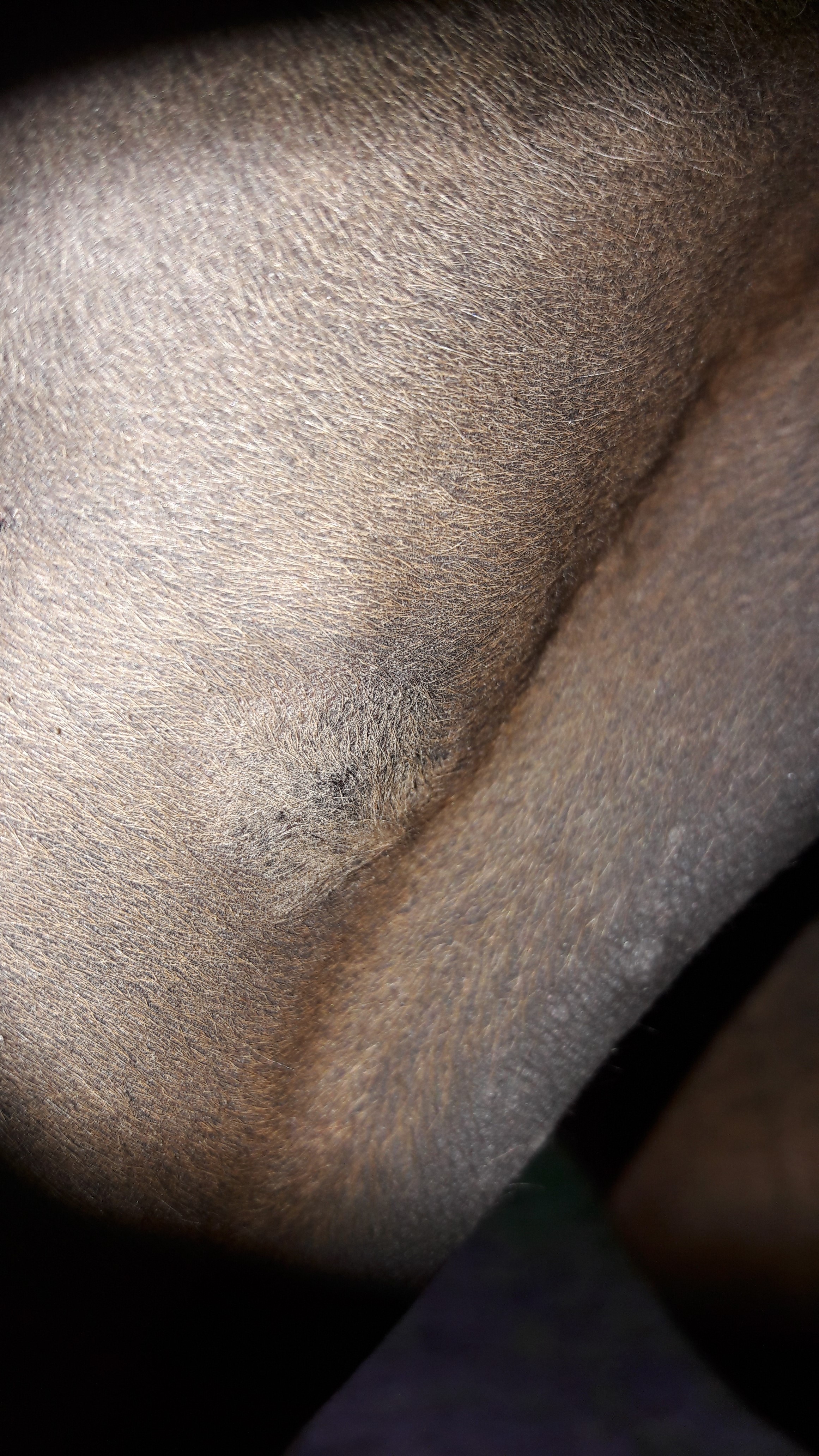 Im Sommer 2017 oder Sommer 2018 hatte er an der Schlauchtasche, linke Seite, einen Zeckenbiss. Auf alten Fotos von Oktober 2018 ist eine „Hautveränderung“ zu erkennen. Ich kann nicht genau sagen, ob es exakt die Stelle des Zeckenbisses ist, aber der Biss seinerzeit war auf jeden Fall in dem Bereich.