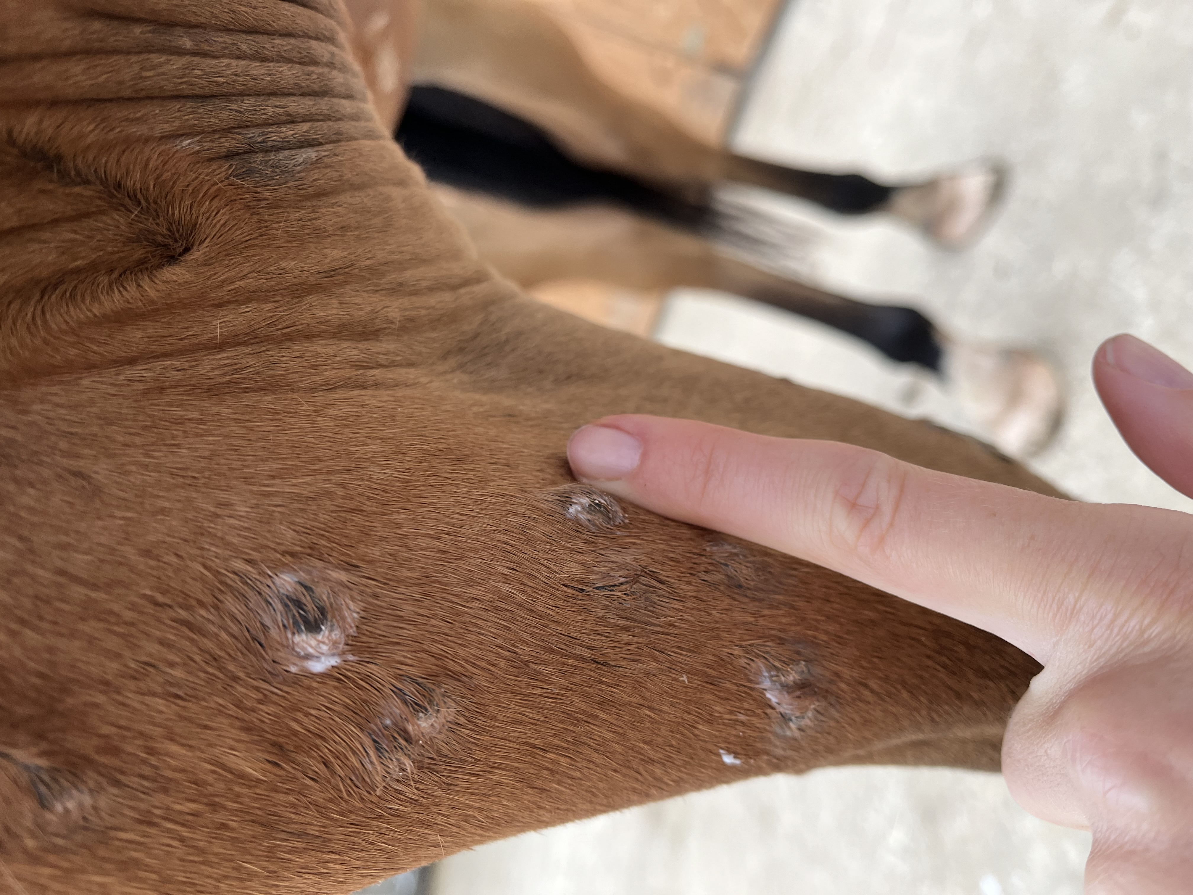 Sie tippt eher auf Milben. Ihr eigenes Pferd hat das wohl im Herbst am Rücken von den Grasmilben. Da bilden sich erst solche Knoten wie bei Euch, dann fallen die Knubbel mitamat Haaren ab und es sind eitrige Stellen da. Das Pferd ist während der gesamten Zeit sehr schmerzenpfindlich. Wie ist das bei Euch?