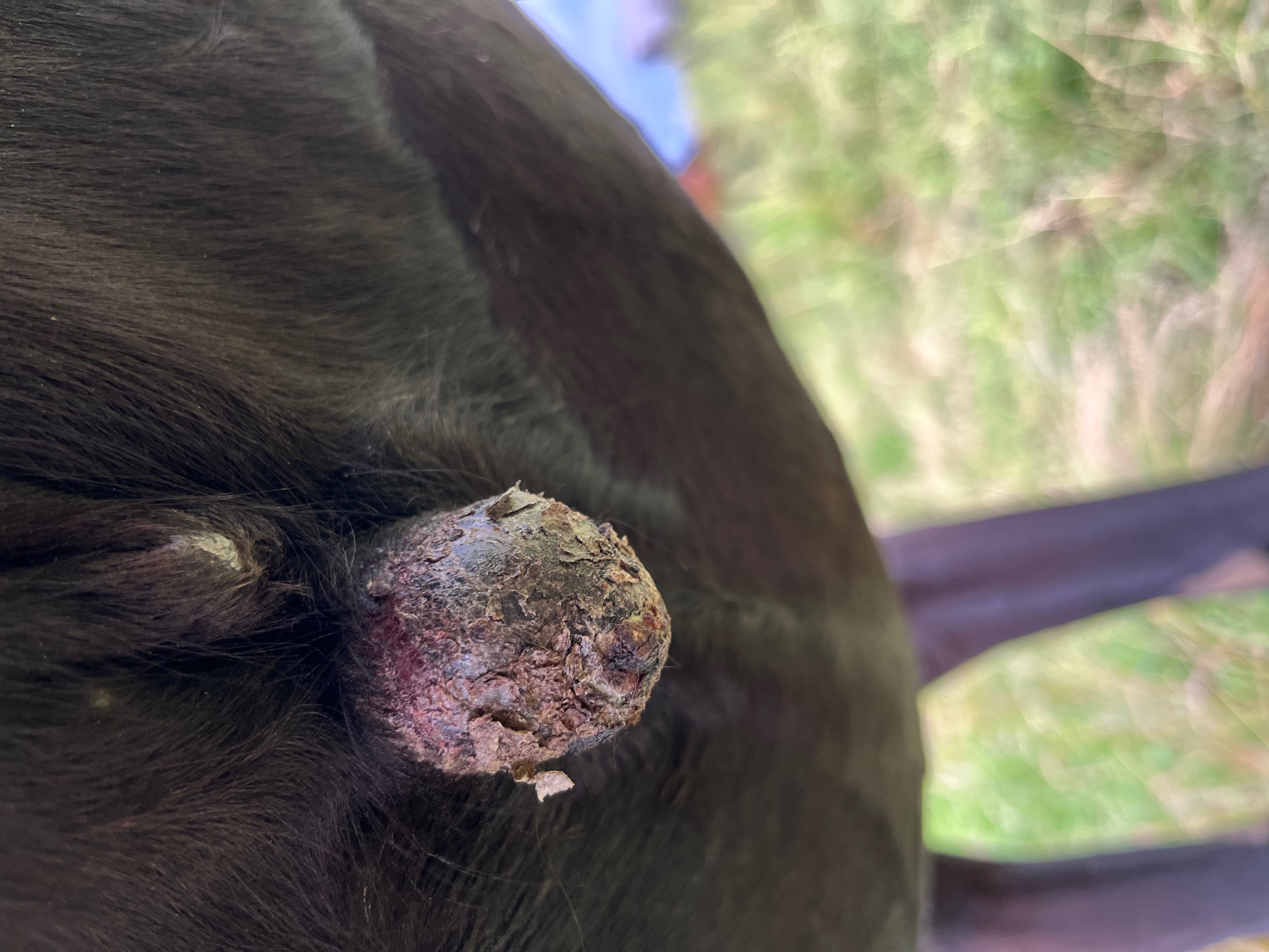 Mit dem Besprühen ist auch das kleine, nachgelagerte Sarkoid, auch etwas gewachsen. Aber es sieht immer noch nach Typ I aus. Eine Wucherung gab es bisher nicht. Nach gut 5 Wochen ging das große Sarkoid an einer Stelle auf, schloss sich aber praktisch nach weiteren 1.5 Wochen wieder. Wir sind jetzt in der 8. Woche der Behandlung. Laut TA soll ich es erstmal für 6 Monate verwenden. Aber irgendwie sehe ich da keinen wirklichen Ansatz einer Verbesserung.