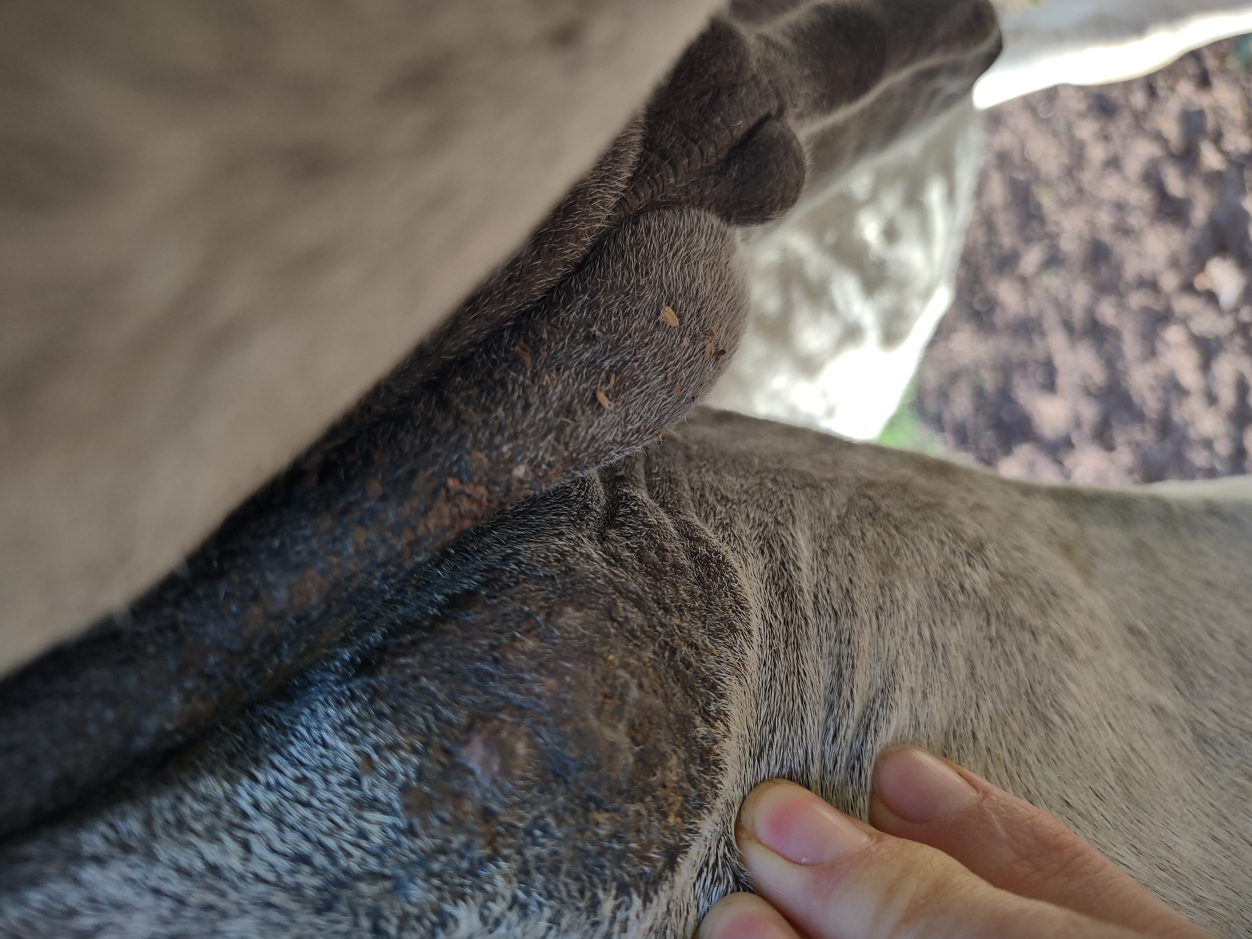Heute kein starker Juckreiz bemerkbar. Weiterhin zum Glück kein Abwehrverhalten. (Wir haben das Cremen vorab aber auch intensiv mit dem Clicker geübt