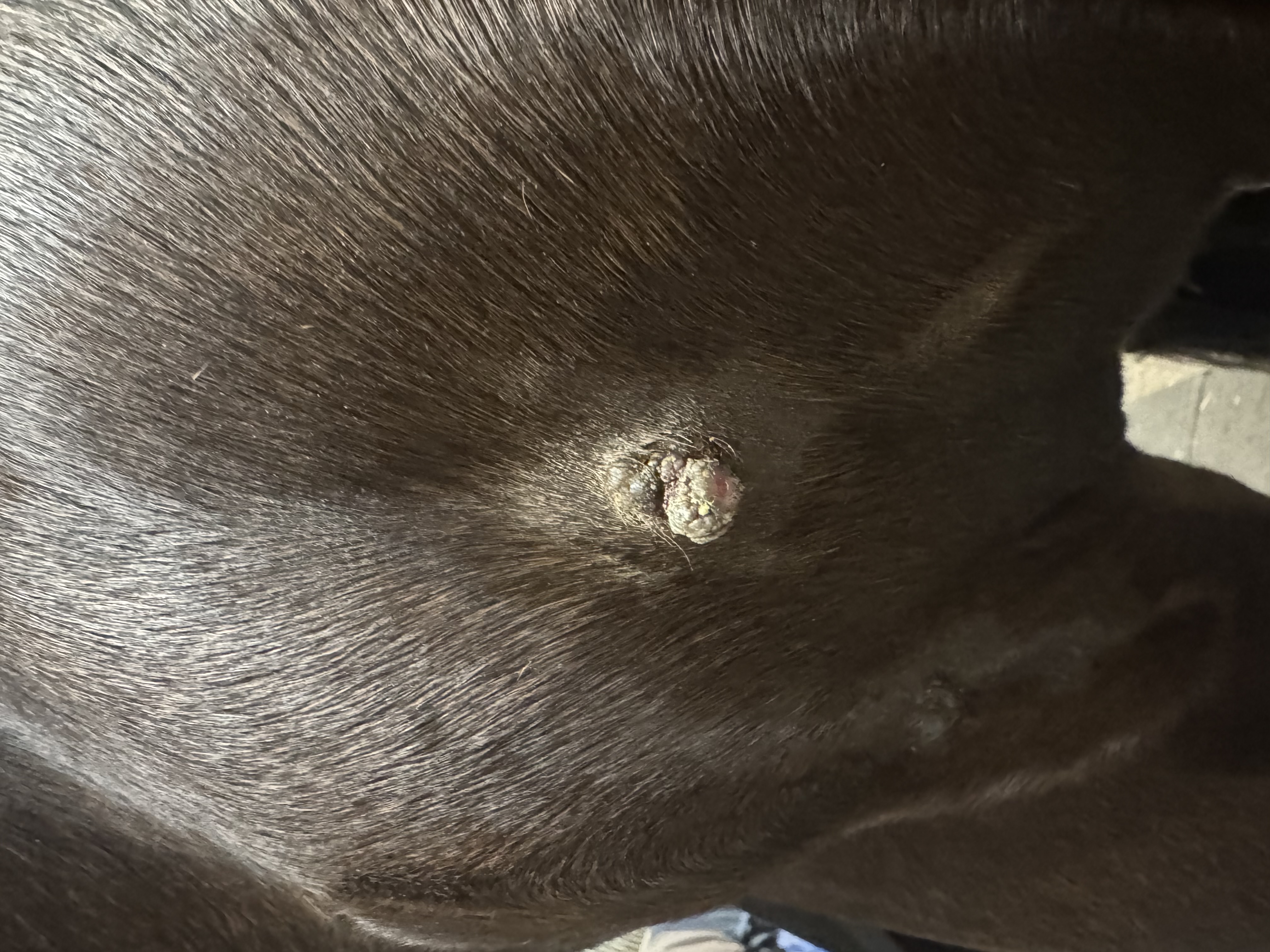 Hallo, ich schon wieder! Hoffentlich nerve ich nicht, aber ich habe mein Pferd gerade umgedeckt und dabei gesehen, dass an zwei Stellen scheinbar Tumorgewebe abgefallen ist, dabei schmiere ich erst eine Woche und nur bei dem kleinen unten hatte sich eine Kruste gebildet. Bei dem oberen war das für mich nicht zu erkennen, da das Sarkoid schon immer schwarz war.