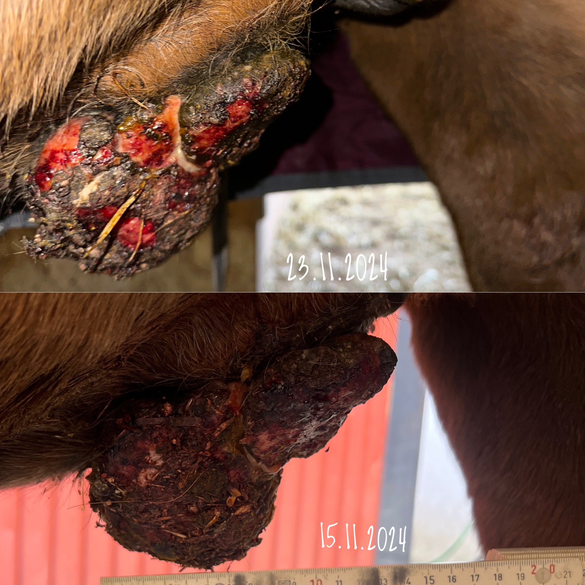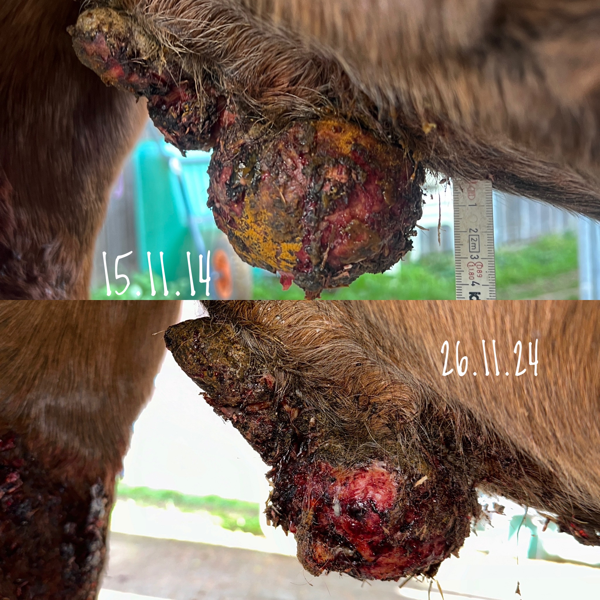 hat sich beim Schmieren gegen den Bauch getreten und dabei das Sarkoid erwischt. Die Kruste ist abgefallen & es hat geblutet