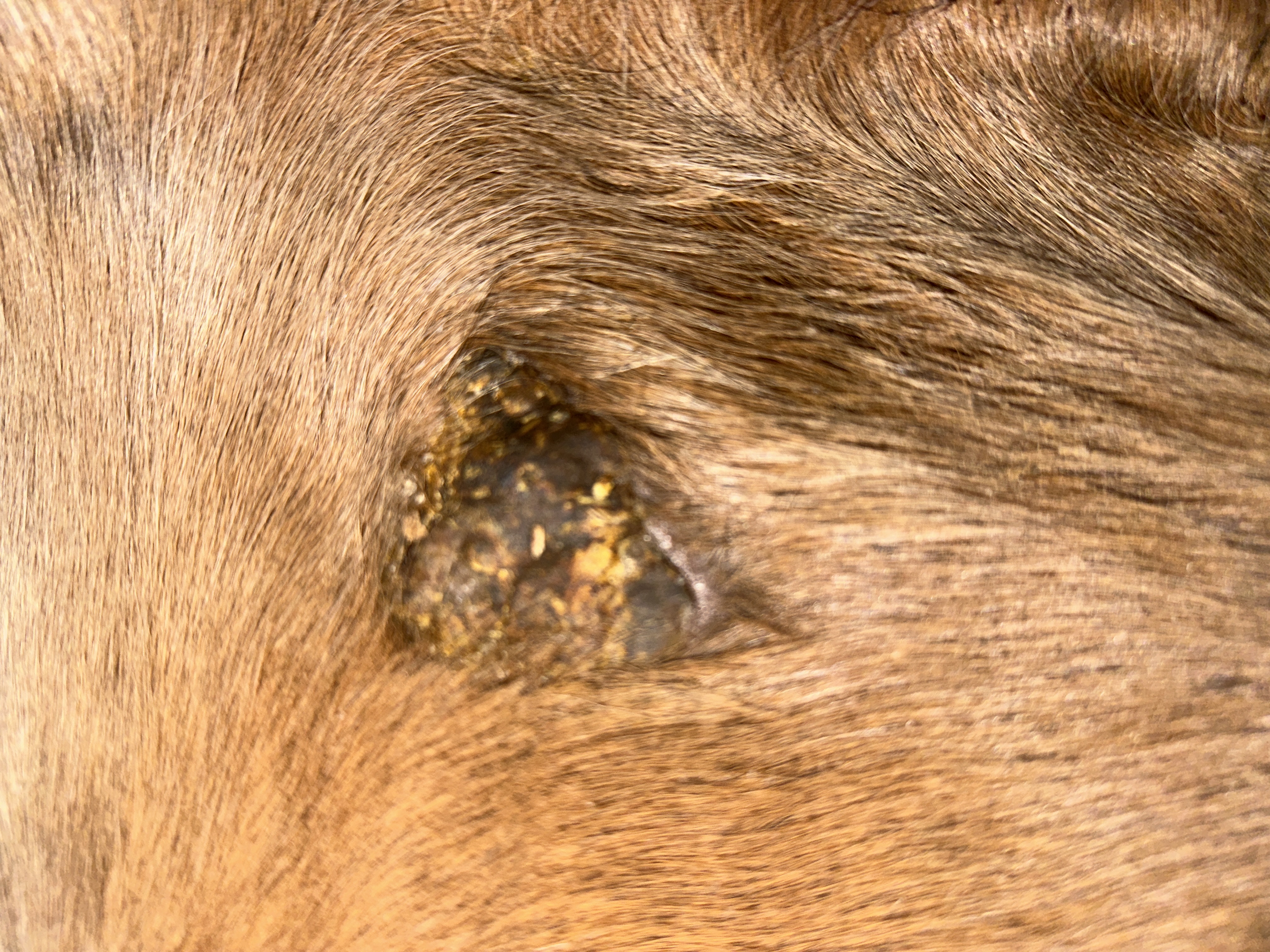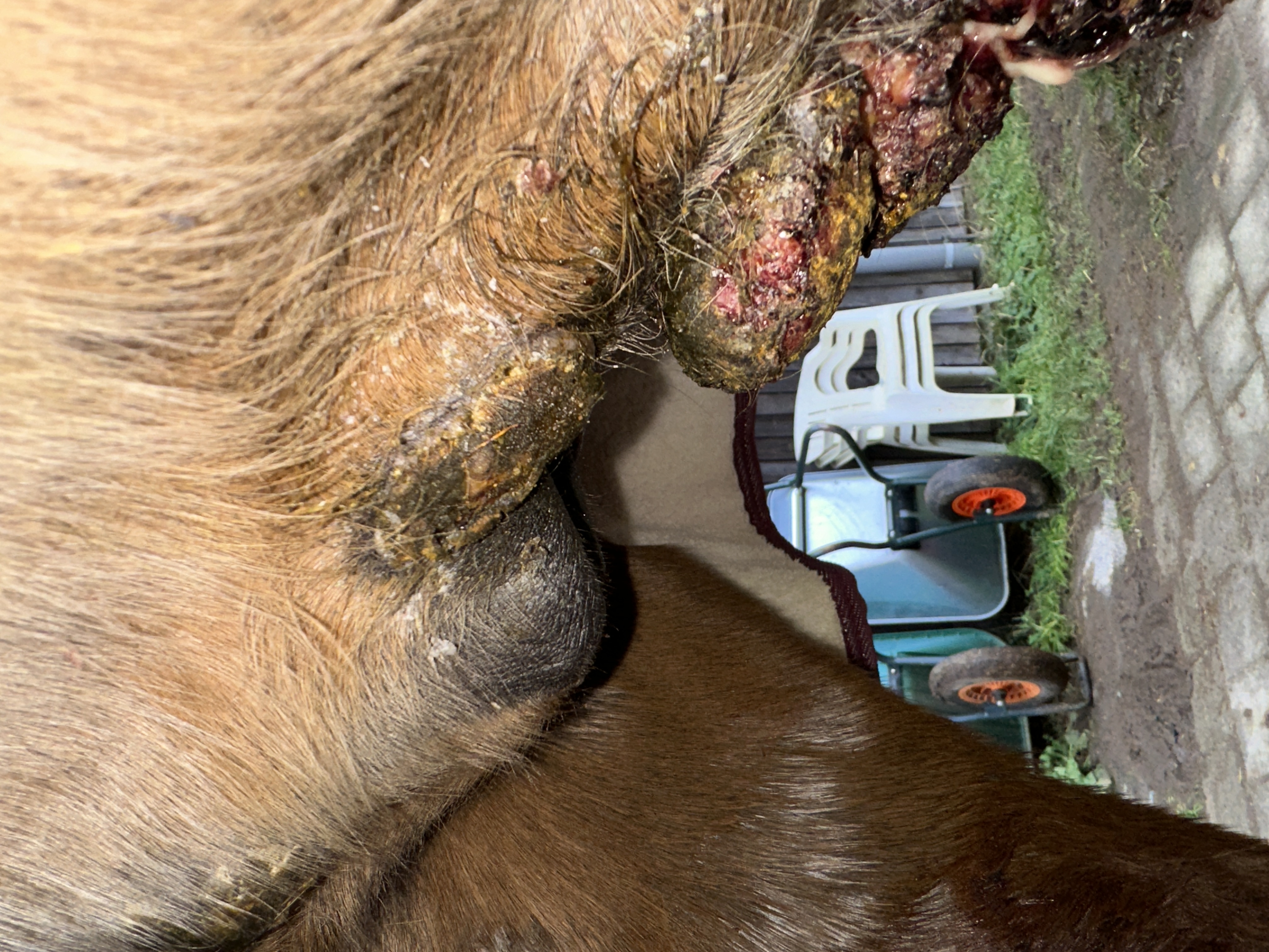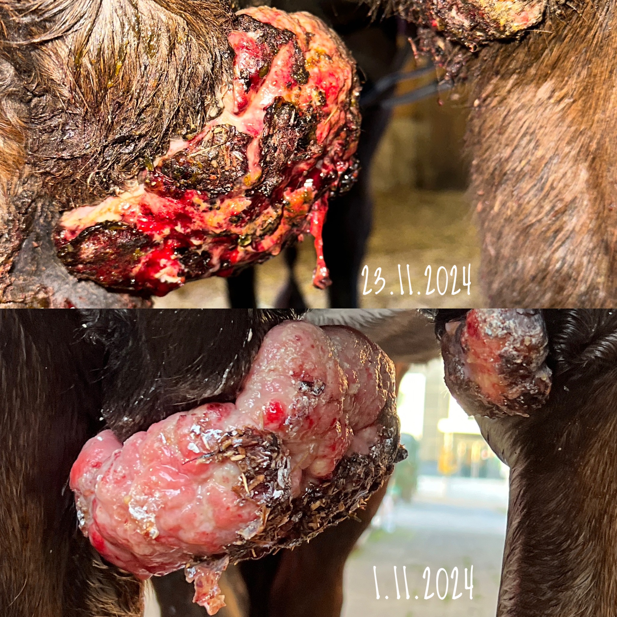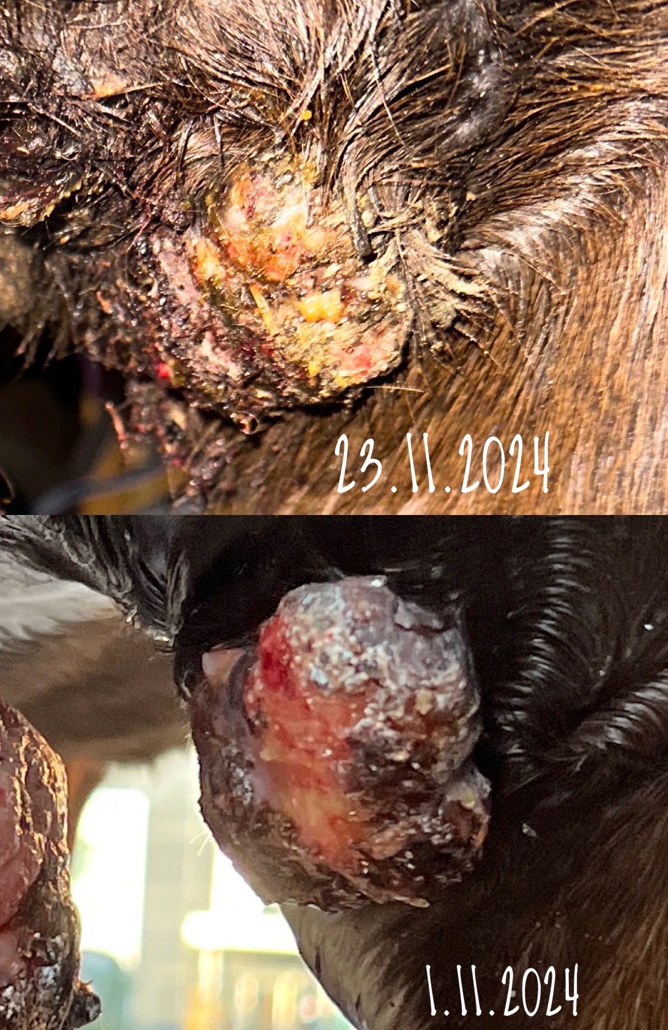 Momentan beisst er fast täglich in das vordere grosse Sarkoid rein, ich vermute, dass es jetzt noch mehr juckt. Wir haben hier eine Idee, wie wir das Sarkoid besser schützen könnten und versuchen diese so bald wie möglich umzusetzen.