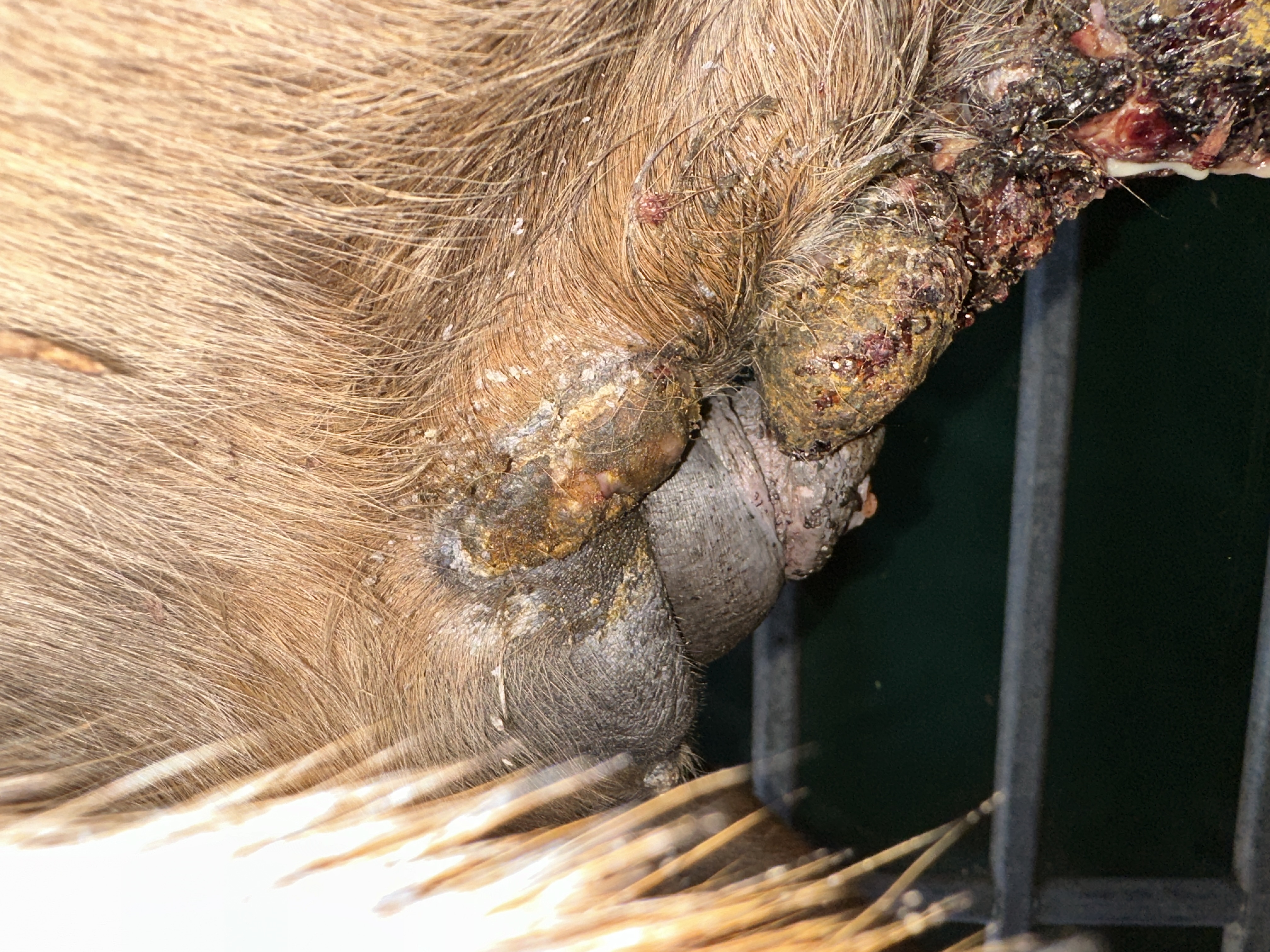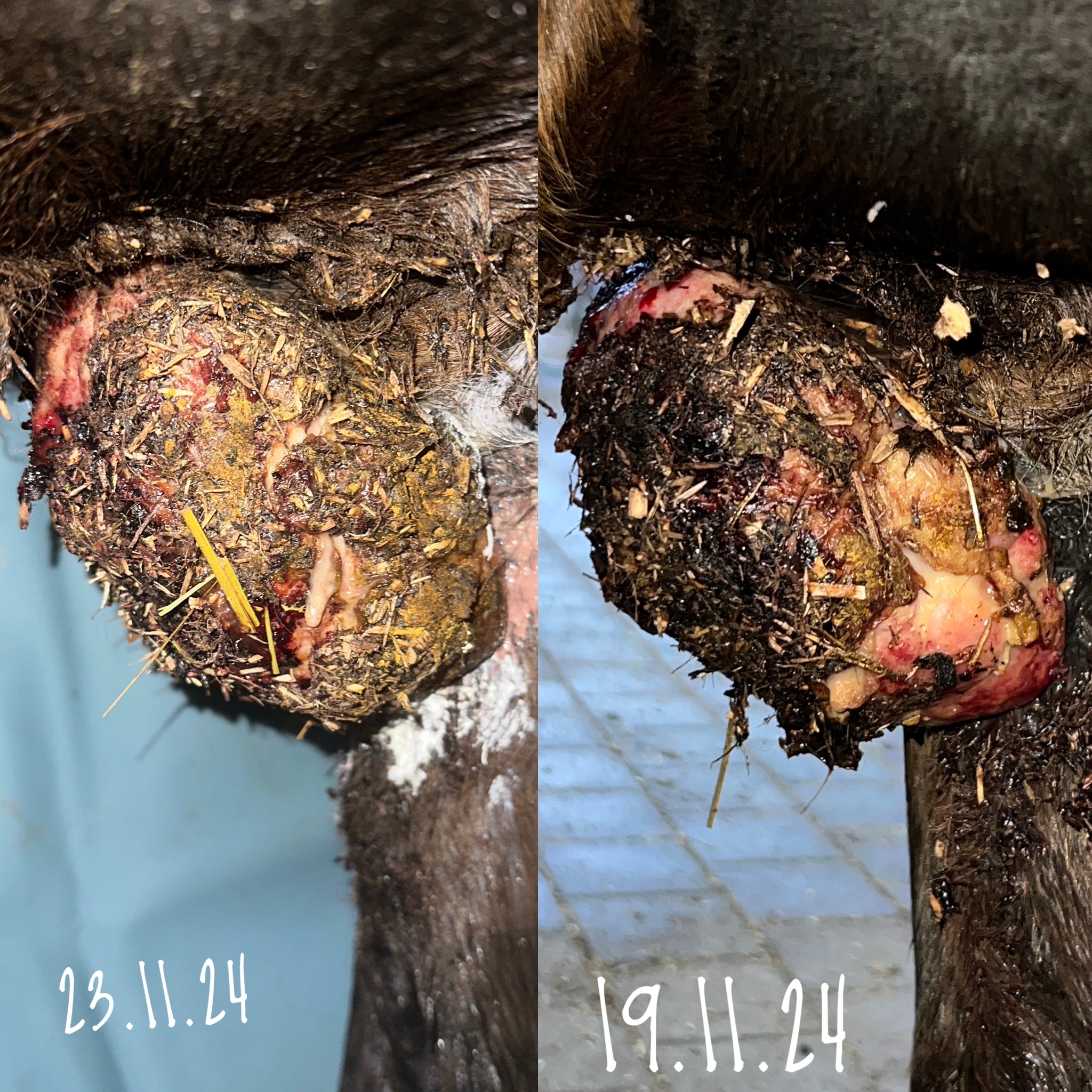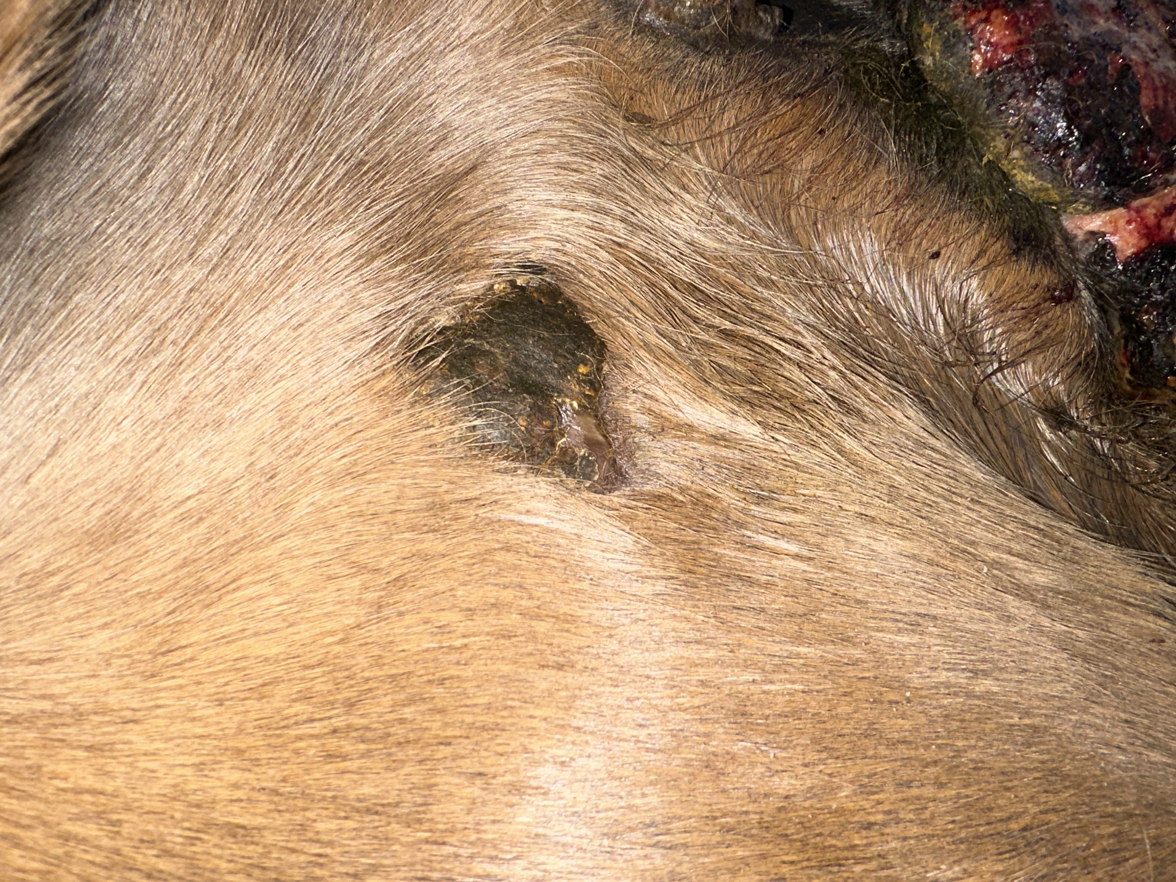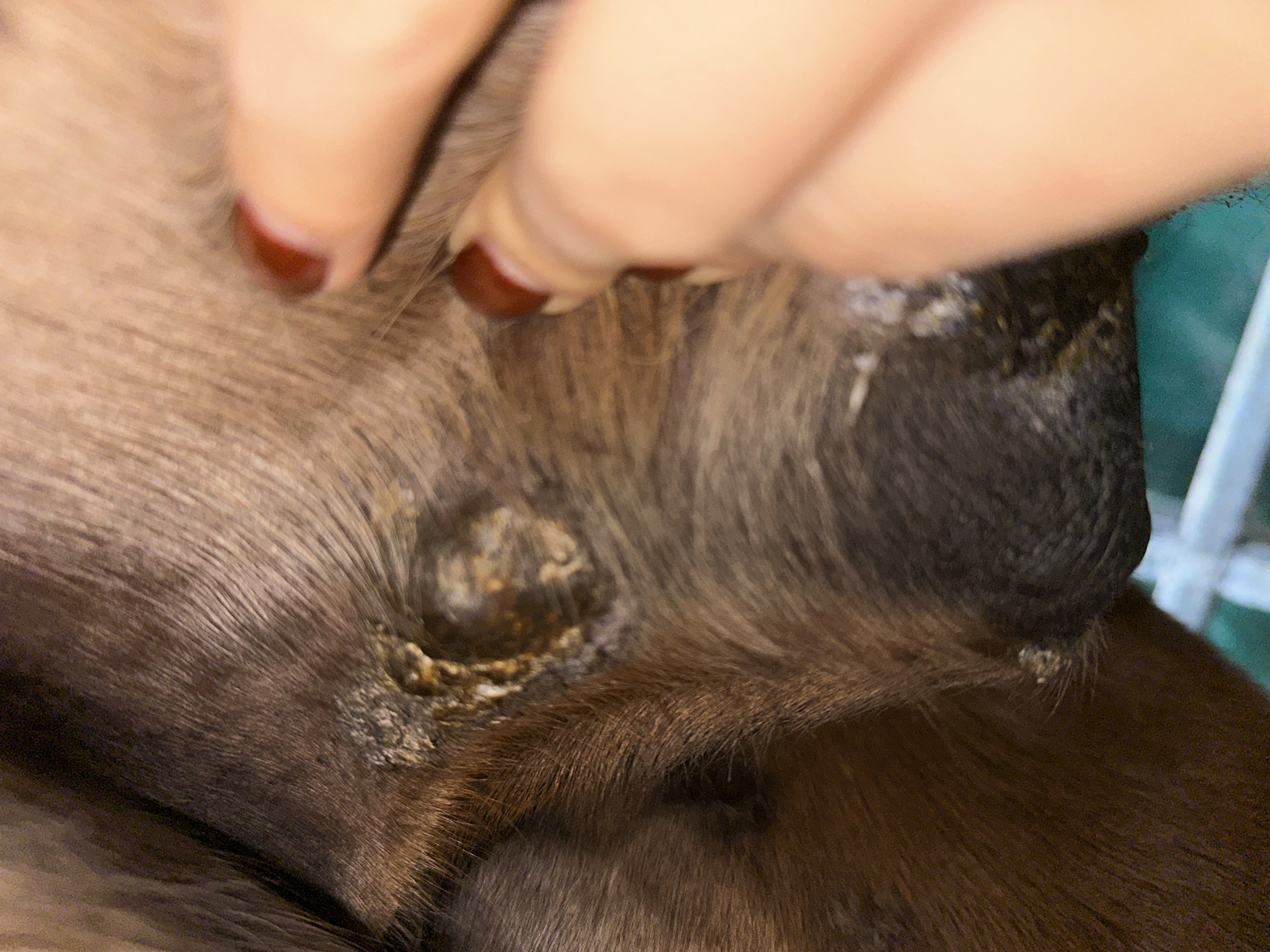 Momentan beisst er fast täglich in das vordere grosse Sarkoid rein, ich vermute, dass es jetzt noch mehr juckt. Wir haben hier eine Idee, wie wir das Sarkoid besser schützen könnten und versuchen diese so bald wie möglich umzusetzen.
