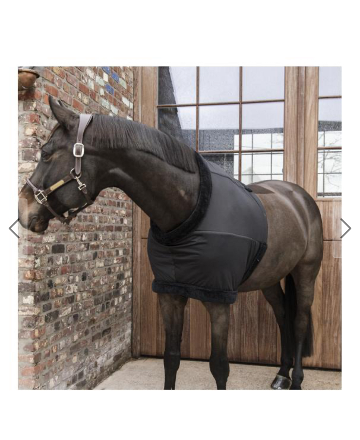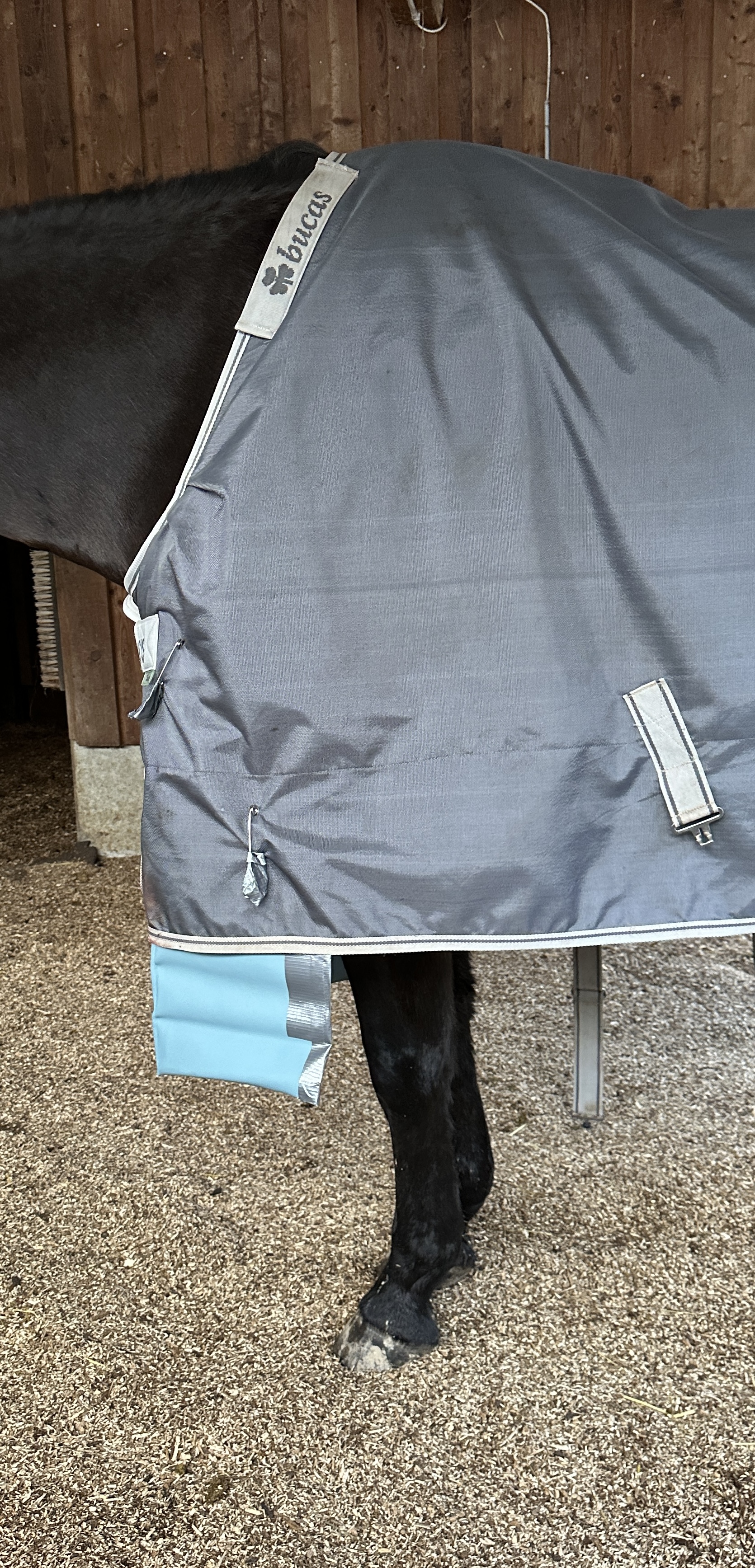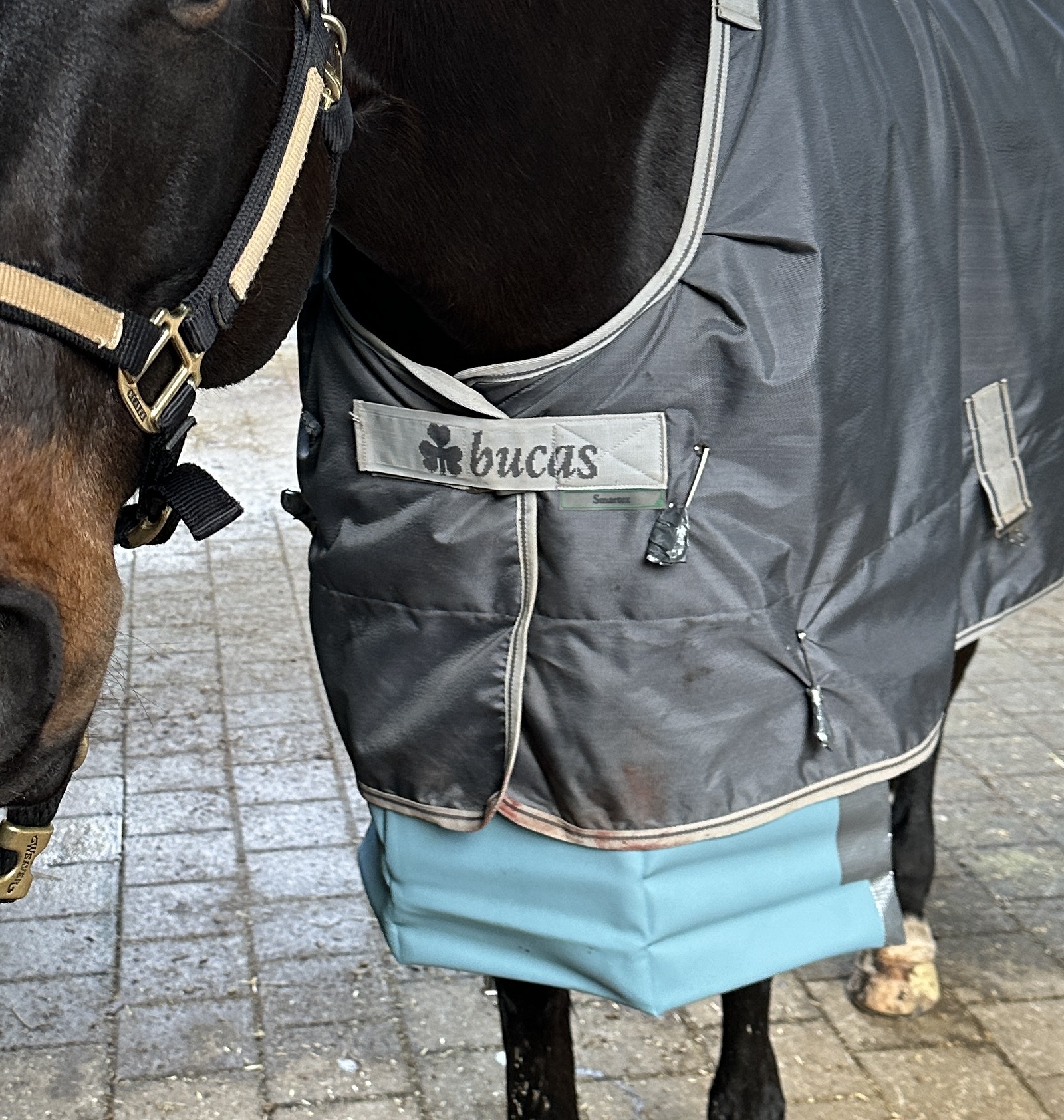 Ich habe in der Zwischenzeit etwas gebastelt. Funktioniert soweit gut, so lange es kalt genug ist, um eine Decke zu tragen. Ich habe dazu ein Kunstleder genommen. Es war jetzt in den letzten Tagen nie mehr so stark blutig. Der Brustschutz von Kentucky hat den gesamten Brustteil mit Fell gepolstert, da würde er anfangen zu schwitzen. Deshalb habe ich es jetzt so gelöst.