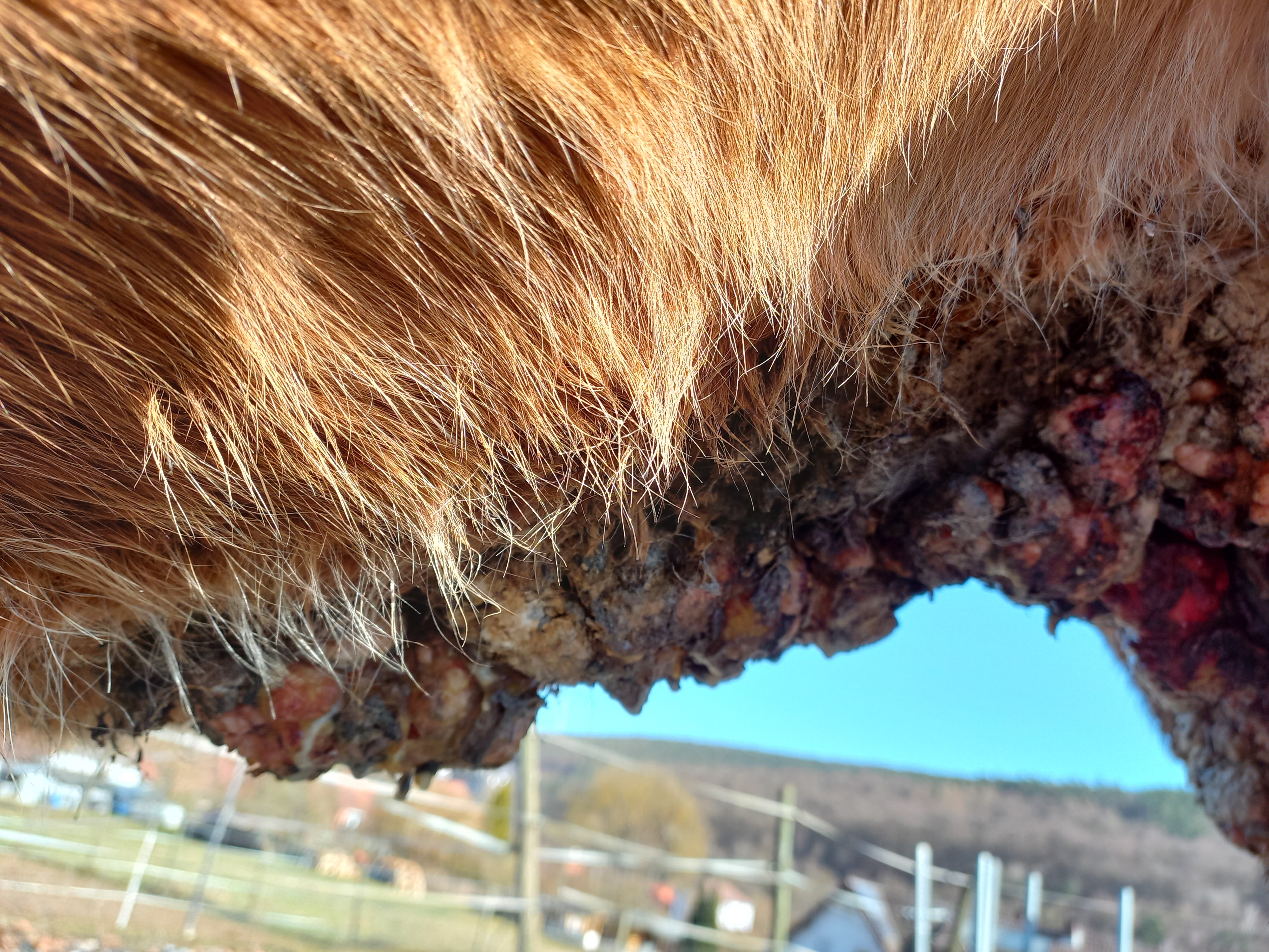 Wäre definitiv ein Fall für den Tierarzt, ob der noch eine Chance bzgl. OP sieht. Das müsste sicherlich in Etappen passieren. Aber ob das erfolgreich ist und man das weg bekommt, wage ich zu bezweifeln.