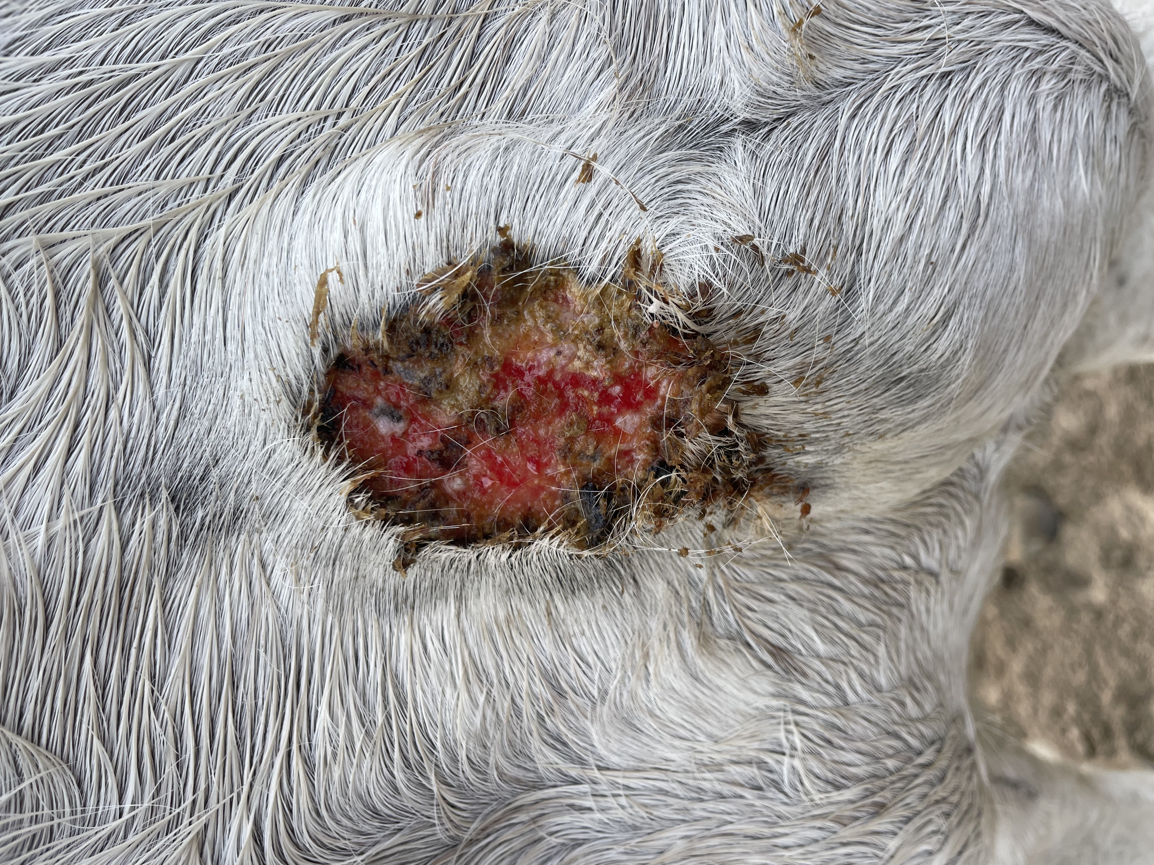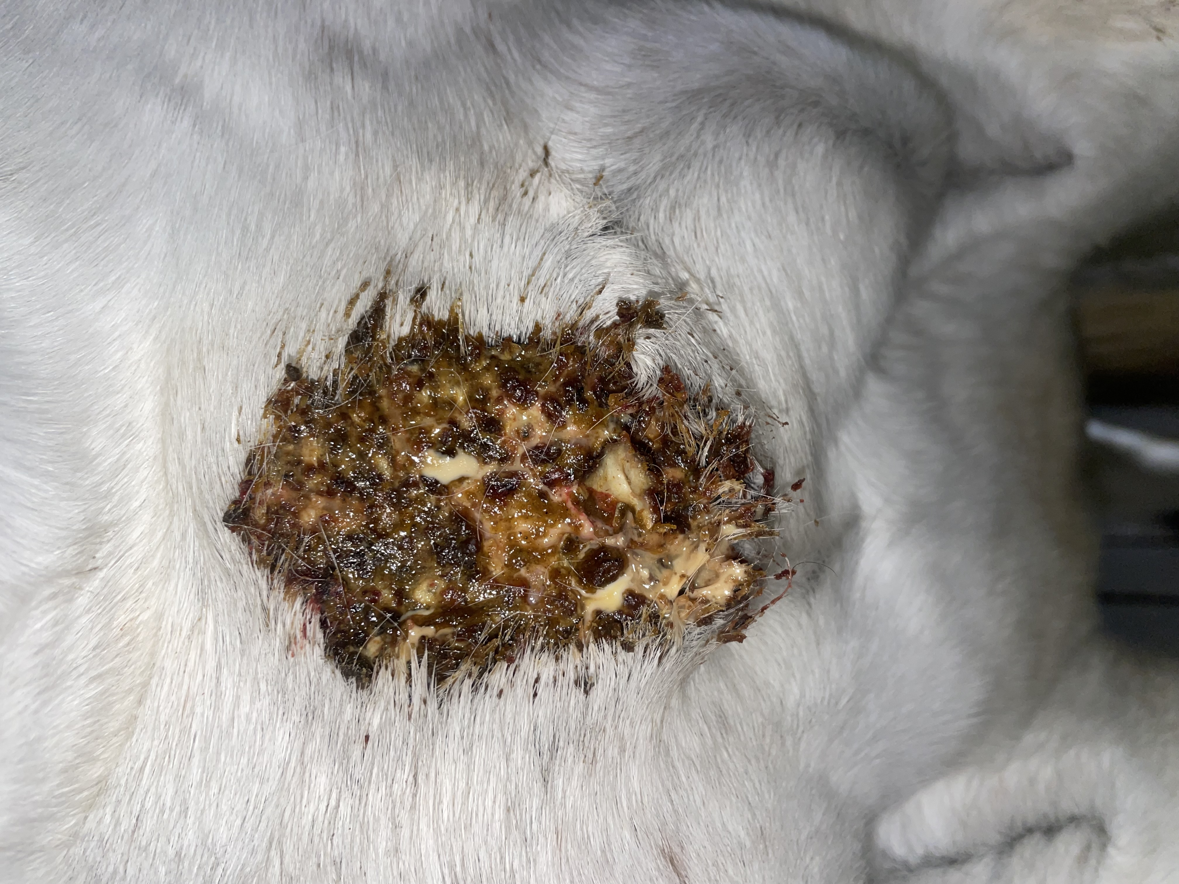 Da ich gestern unter 1:1 gesehen habe, dass es an der ein oder anderen Stelle noch ordentlich gelb eitert, habe ich heute noch einmal dünn 1:3 geschmiert. So weit so gut. Dachte das wäre alles gut aber nope, ca. Eine Stunde nach dem Schmieren hat sie es sich wieder aufgebissen, wenn ich reite geht’s, aber so langsam rückt die Geburt des Fohlens näher deswegen mache ich nicht mehr jeden Tag was