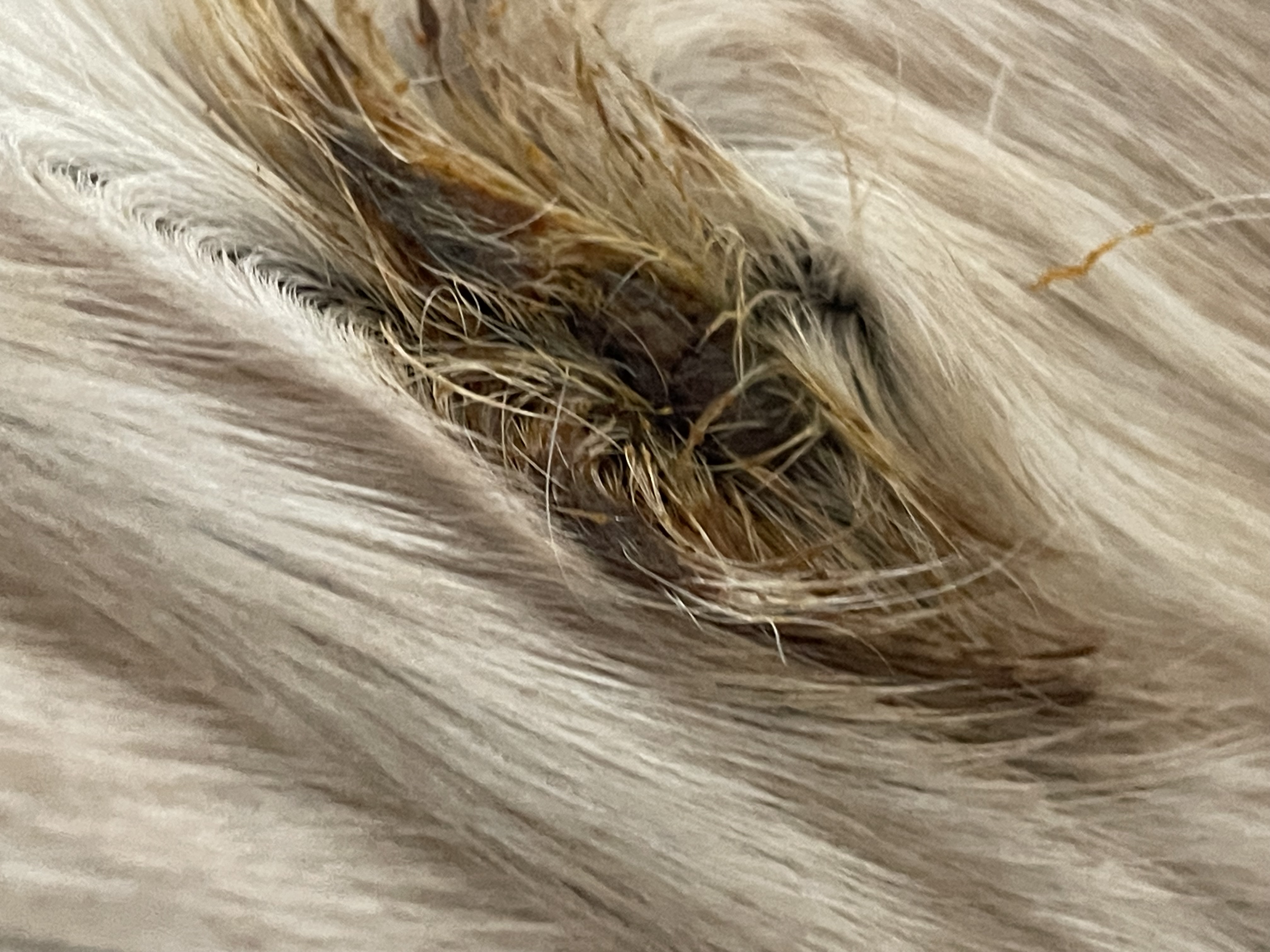 Letztes Jahr Ende August hatte sie zwei komische Flecken an der Brust. Insektenstiche? Gingen aber nicht weg. Im Oktober, als die Tierärztin sowieso da war, habe ich gefragt. Vorher hatte ich nochmal genau geguckt und festgestellt, dass sie hinten zwischen den Schenkeln noch so ein komisches Ding hatte. Die Tierärztin meinte, es seien tatsächlich Sarkoide.