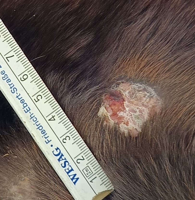 07/2024 wuchs oberhalb der 2022+2023 behandelten Stellen eine neues Sarkoid direkt hinter dem Ohr, Behandlung mit Aldara und dann abgebunden. Leider war die Stelle ungünstig und es konnte nicht vollständig abgebunden werden. Die Stelle war erst in Ordnung, flach und glatt, mit dem jetzigen Fellwechsel beginnt es wieder zu wachsen. Der Knubbel ist nicht prall, es fühlt sich an, wie wenn sich Flüssigkeit darunter sammelt. Am 22.03.25 zusätzlich kleiner blutiger Punkt zu sehen (evtl. von Trense?). Ich habe die Stelle jetzt noch nicht behandelt. Wie schätzt ihr die Stelle ein? Mit CompX 1:1 beginnen?