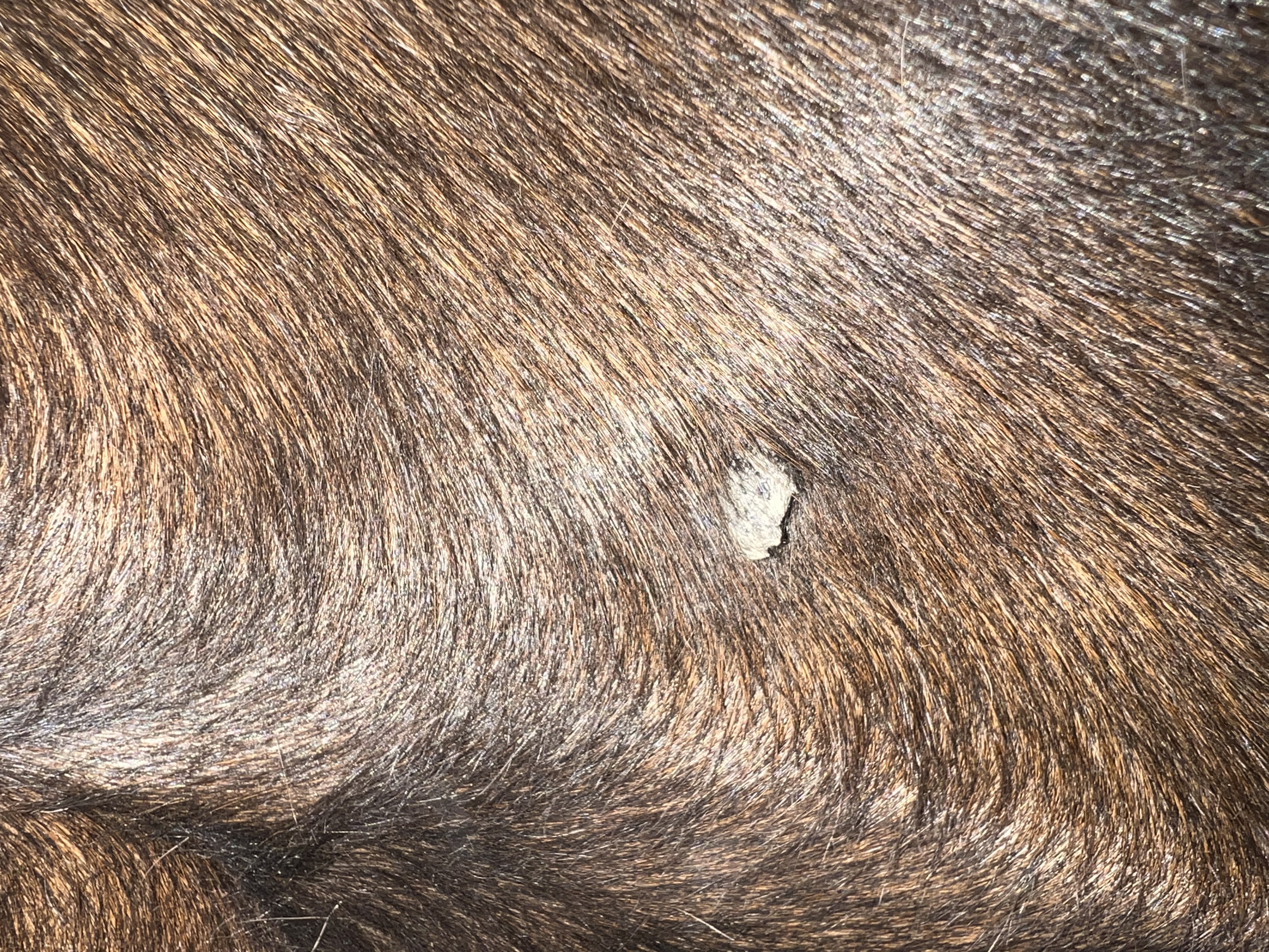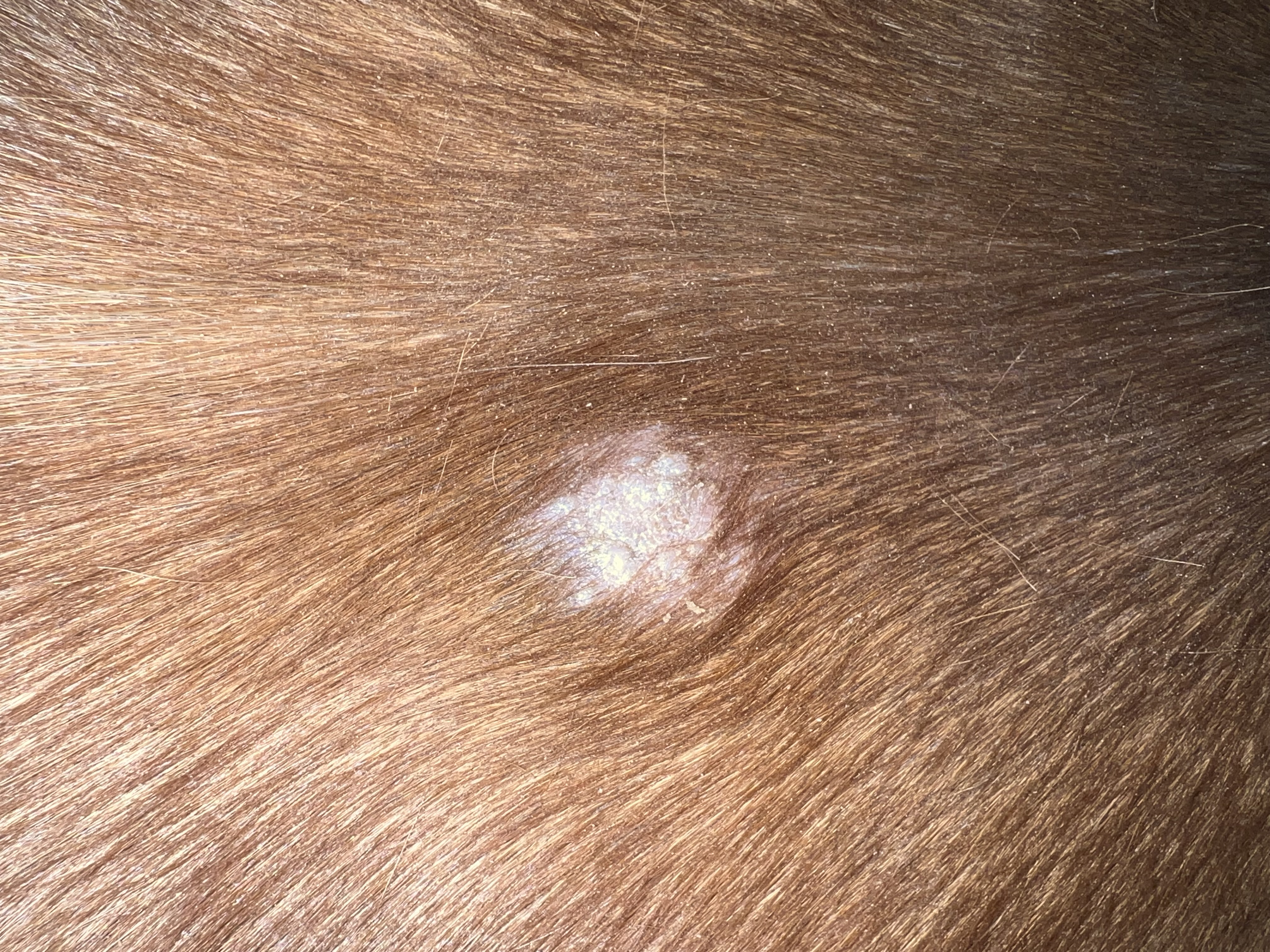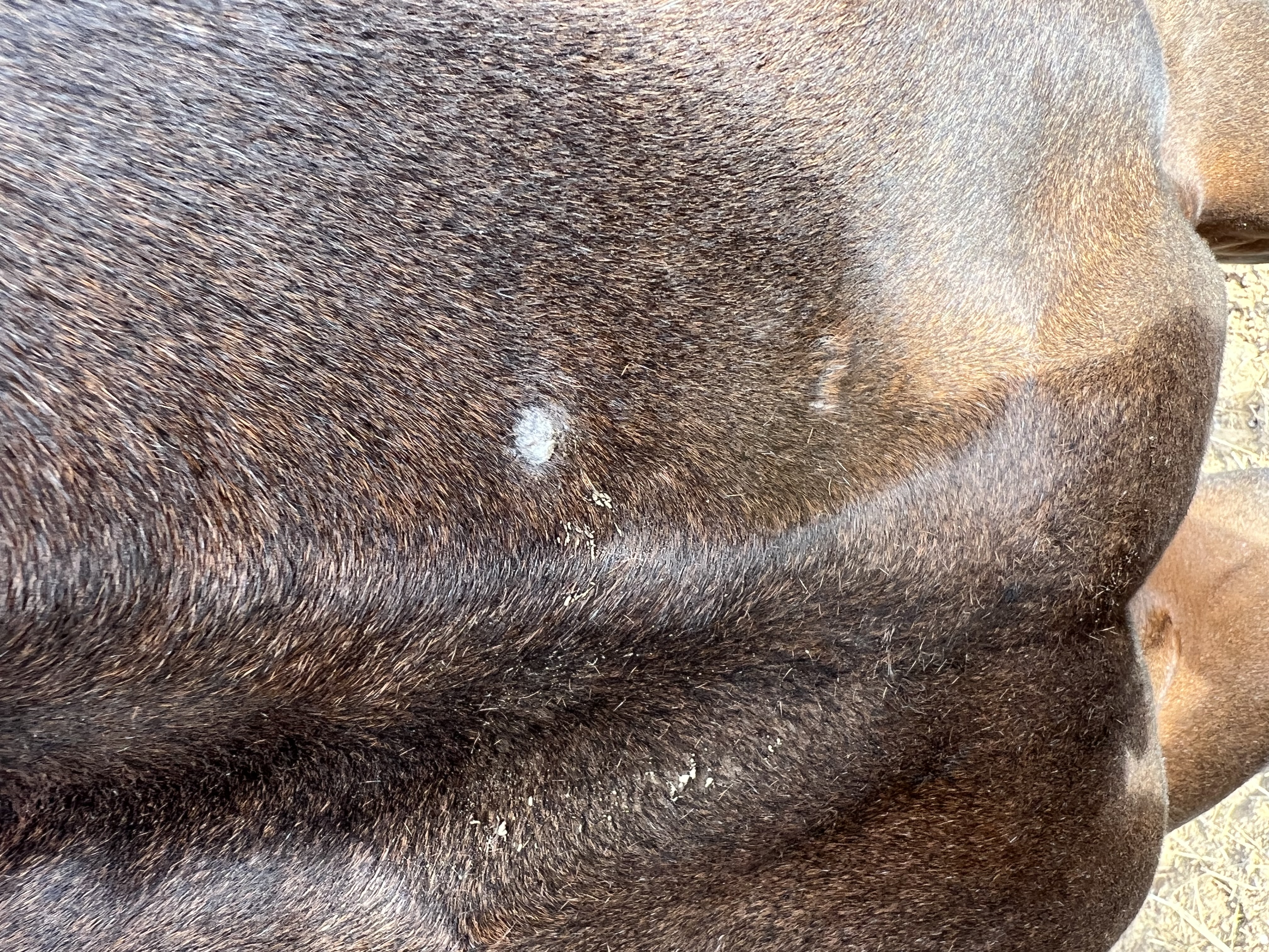 Er hat ein ganz flaches in der Gurtlage, welches mir erst als haarlose Stelle aufgefallen ist.