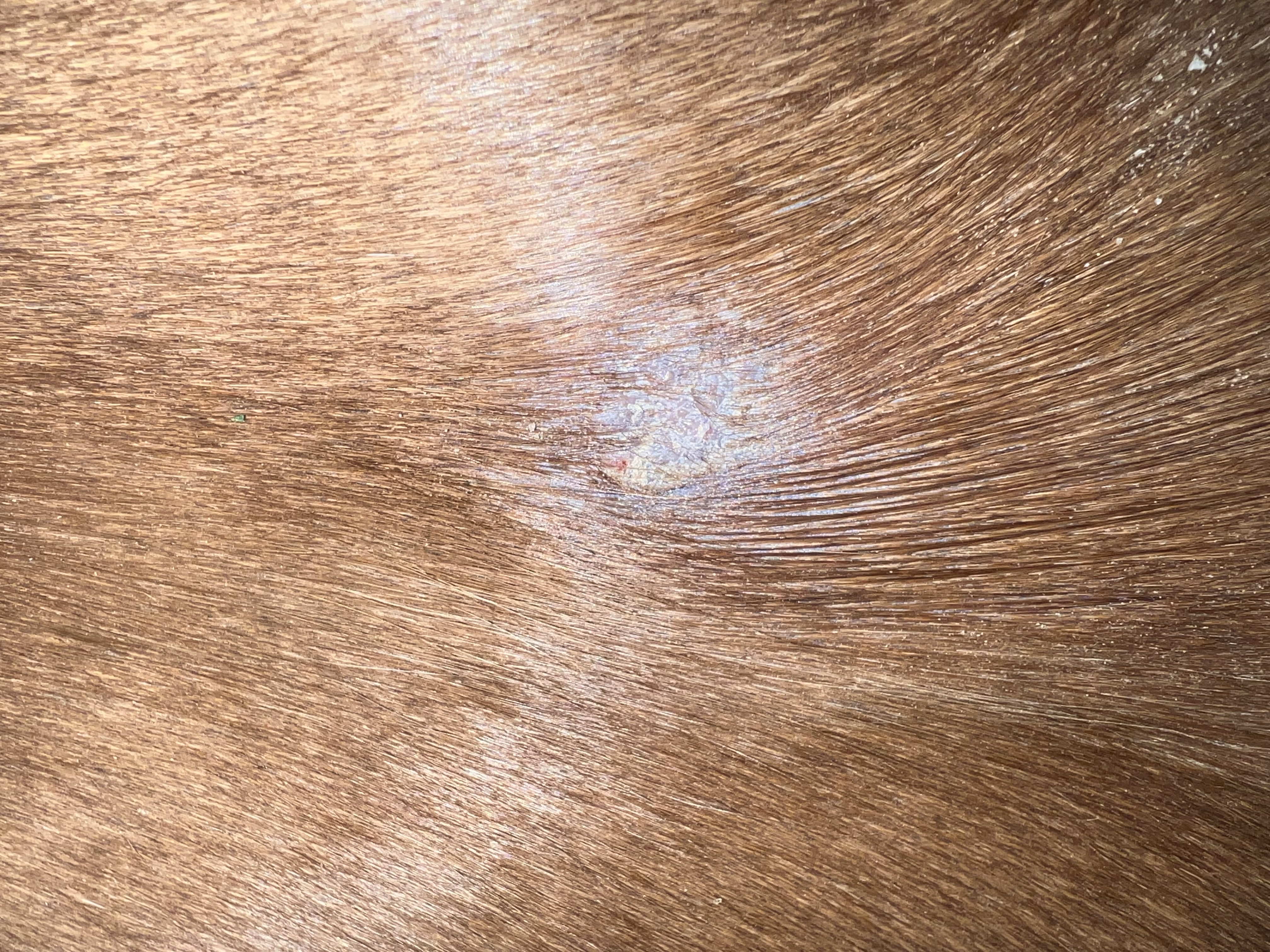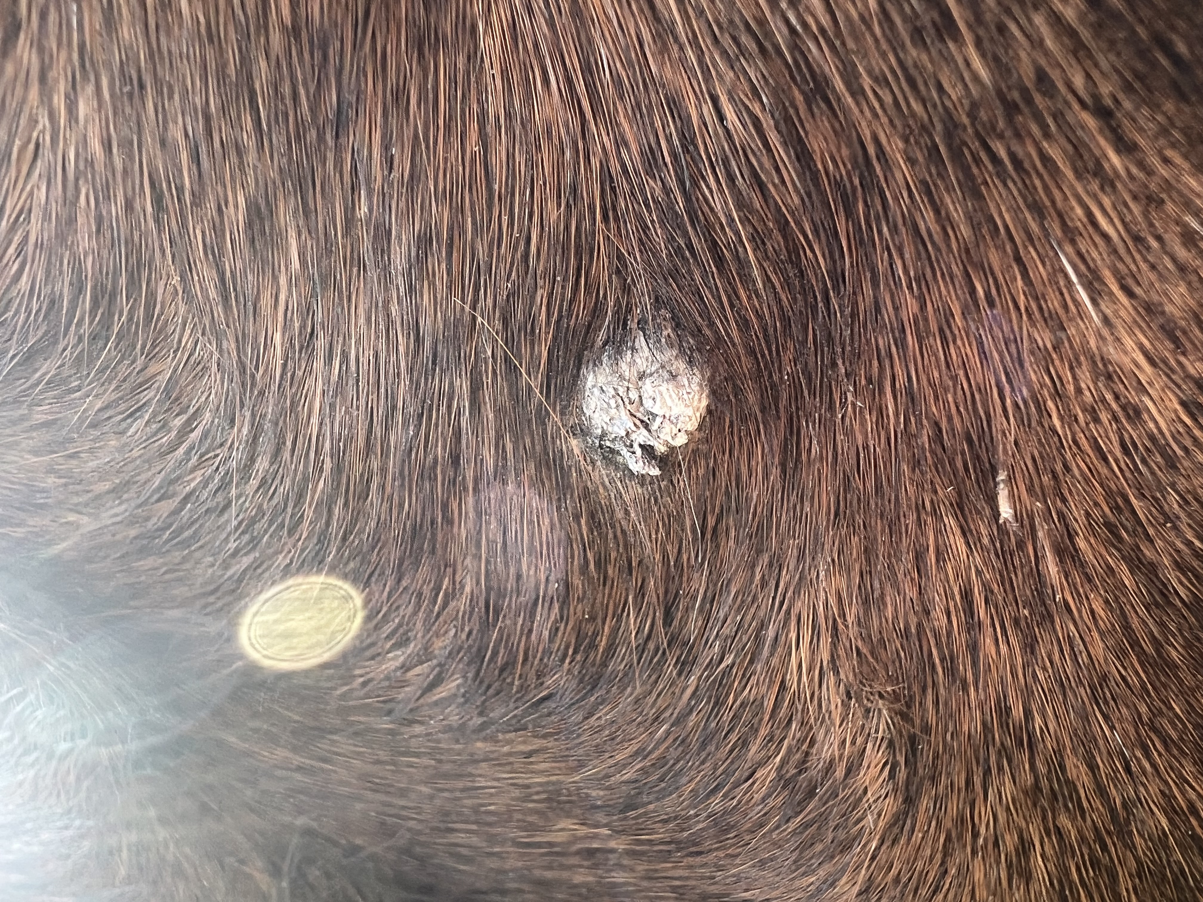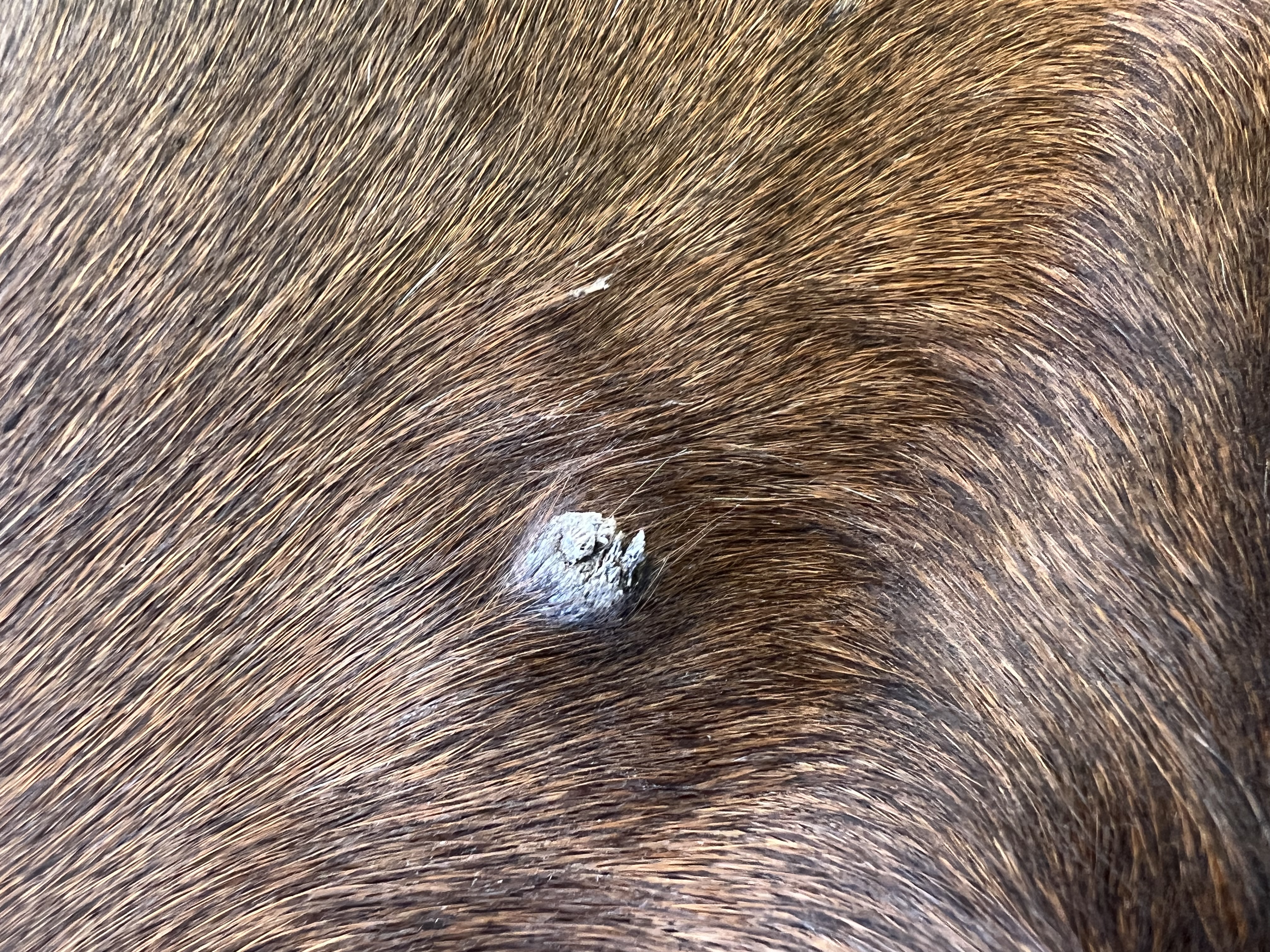 Er hat ein ganz flaches in der Gurtlage, welches mir erst als haarlose Stelle aufgefallen ist.