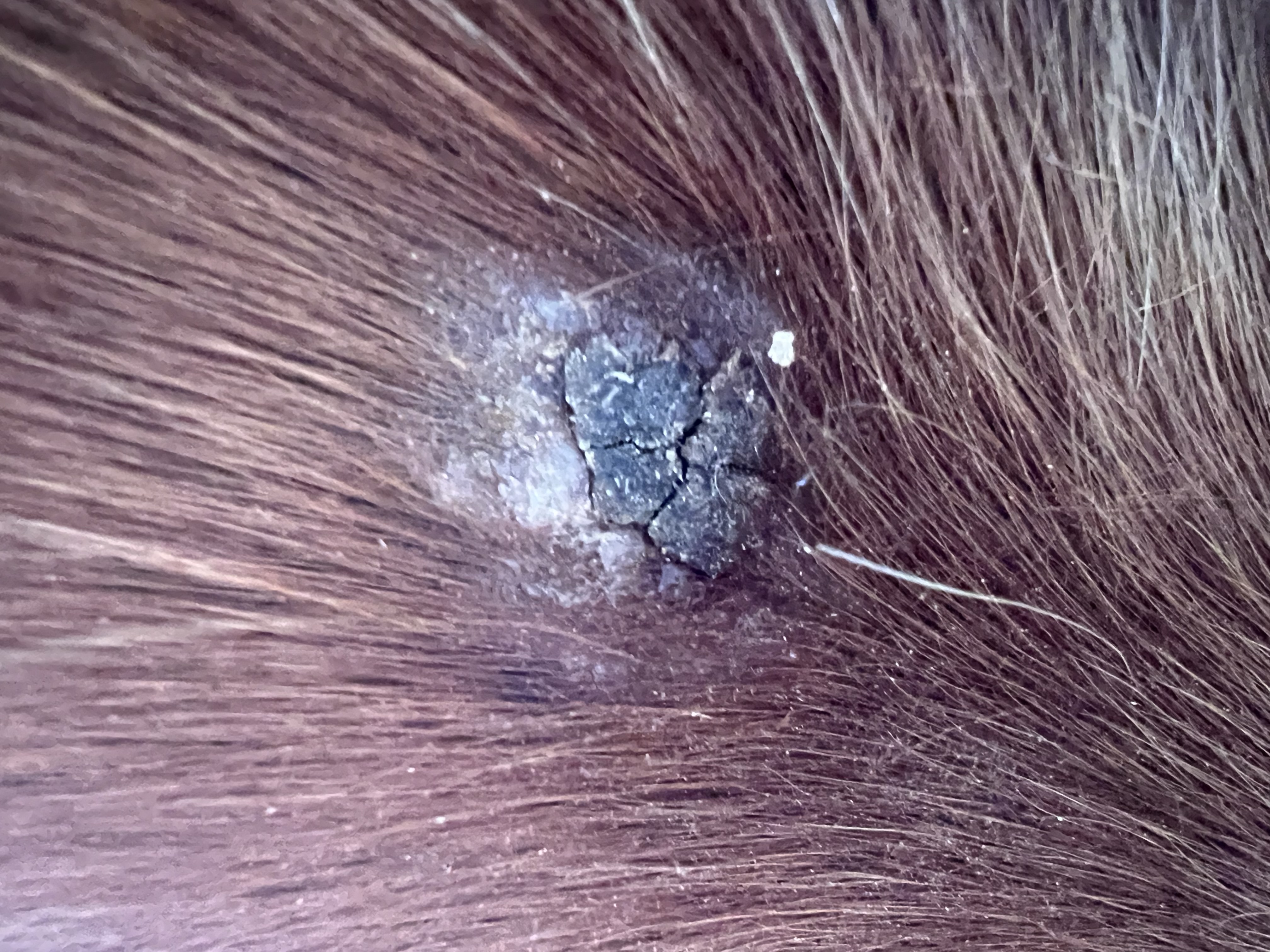 Wenn es einfach nur eine haarlose trockene Stelle ist, kann das alles und nichts sein. In der Vergrößerung sehe ich nur eine weiße Stelle und kann das nicht genauer erkennen.