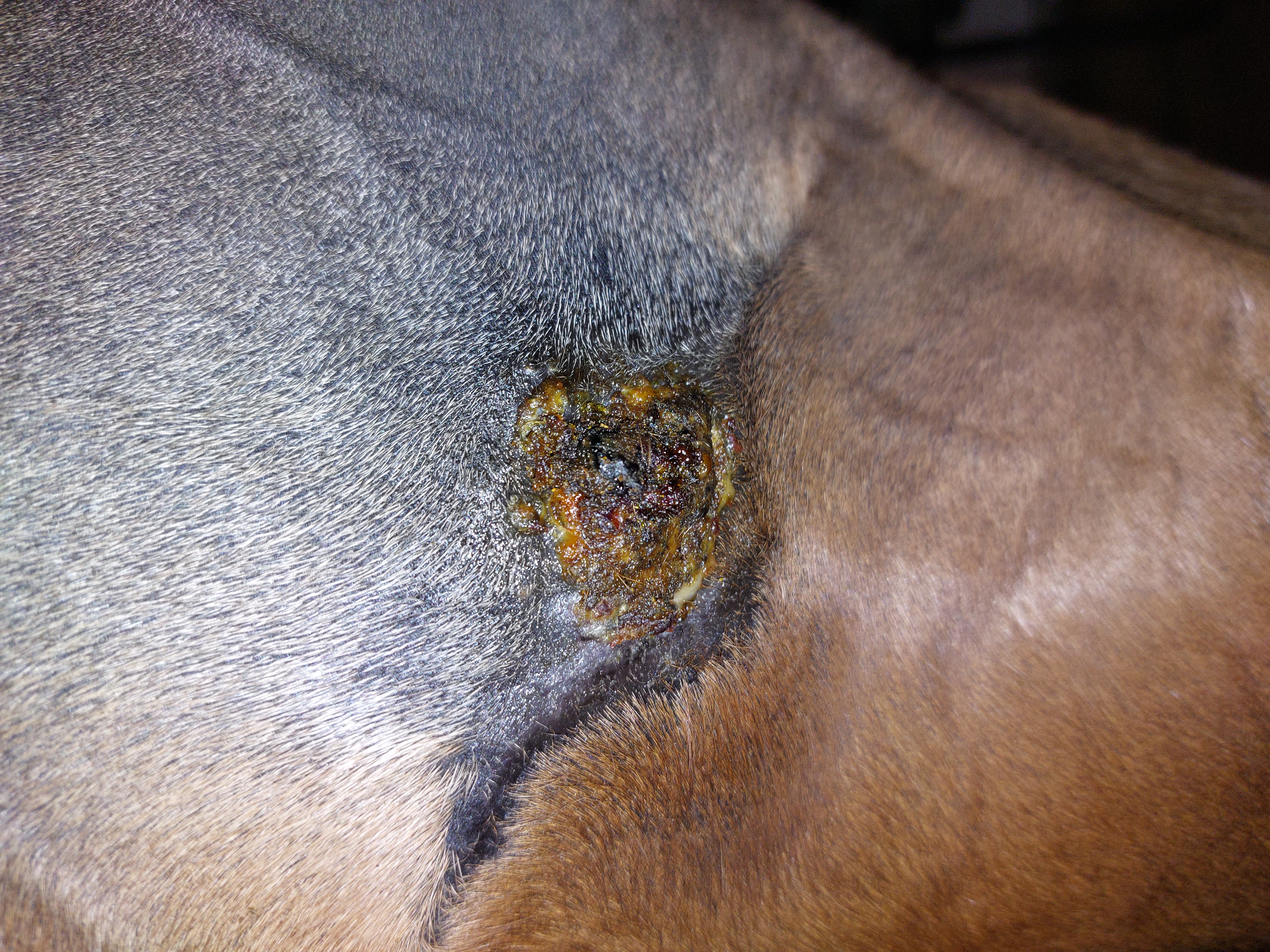 Nun hatten wir ein dreiviertel Jahr Ruhe. Doch die Narbe riss im Winter zweimal auf und nach dem zweiten Mal bildete sich erneut ein Rezidiv. Dazu hatte sich ein Knubbel an der Brust, sowie an beiden Innenschenkel jeweils ein Knubbel gebildet. Diese schmierte ich mit der Salz-Mehl-Paste und hatte damit das Gefühl, sie gut im Griff zu haben.