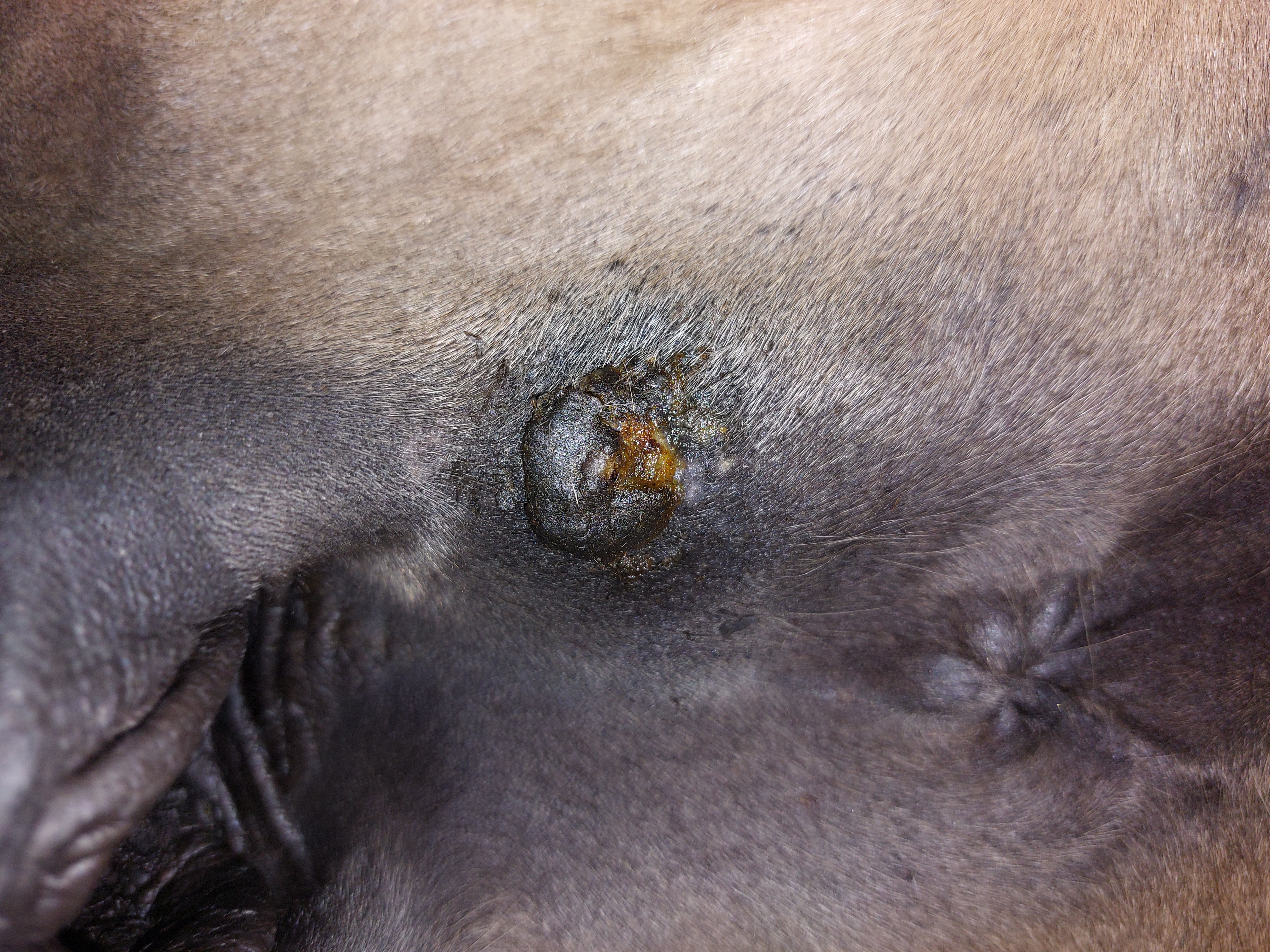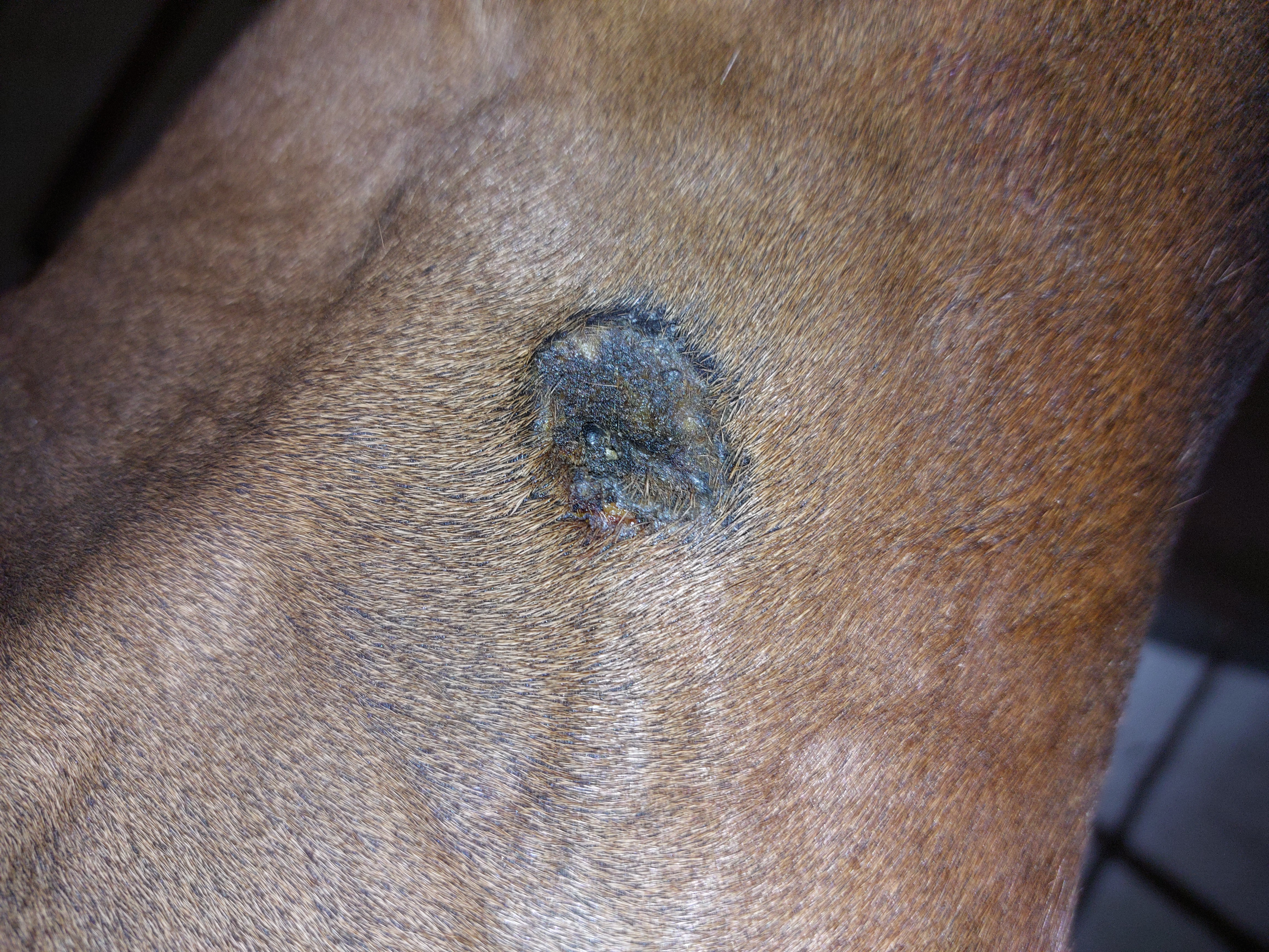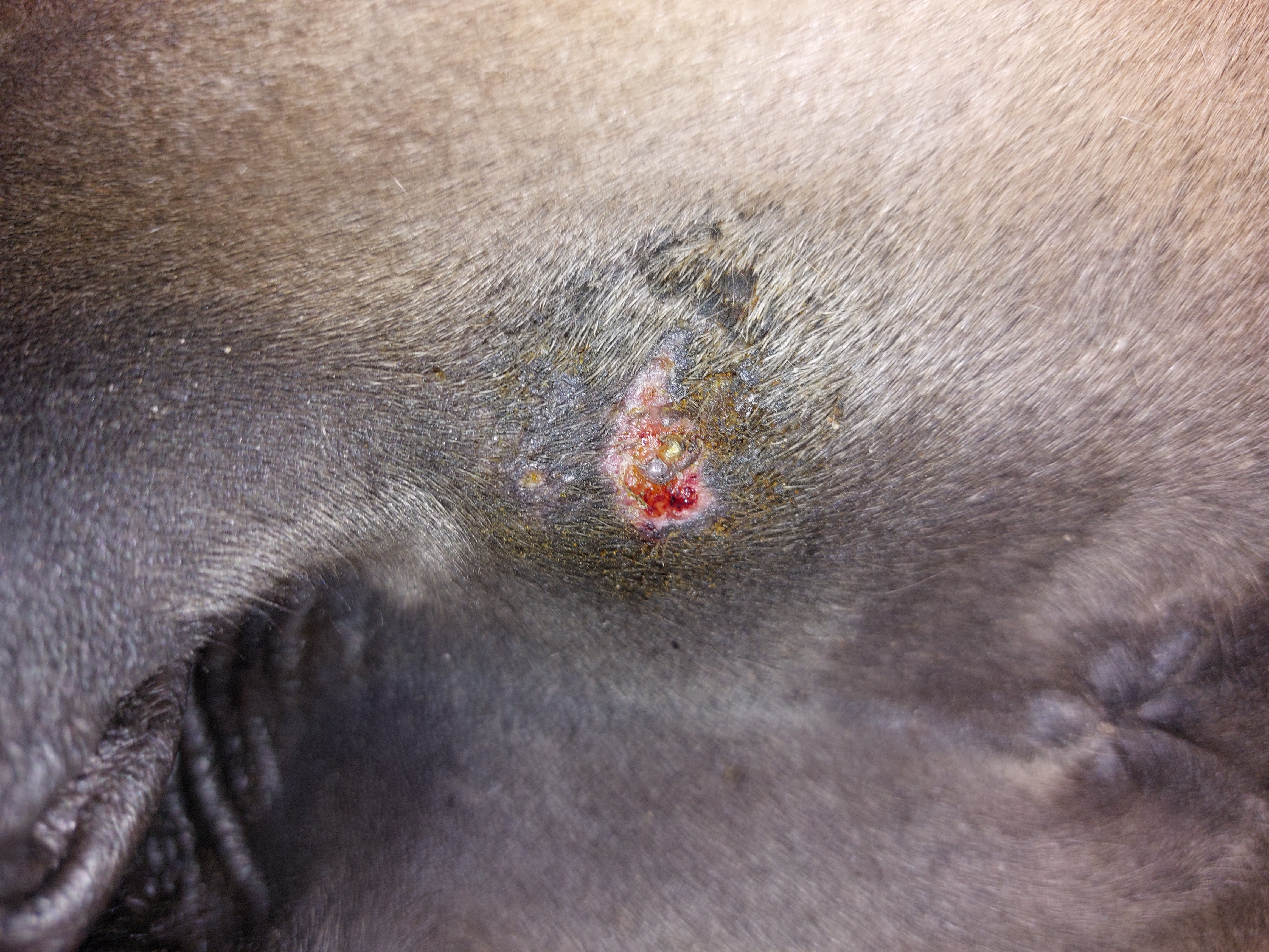 Und nochmal das Rezidiv am Hinterbein, arbeitet weiter…. Die anderen Stellen sahen unverändert aus.
