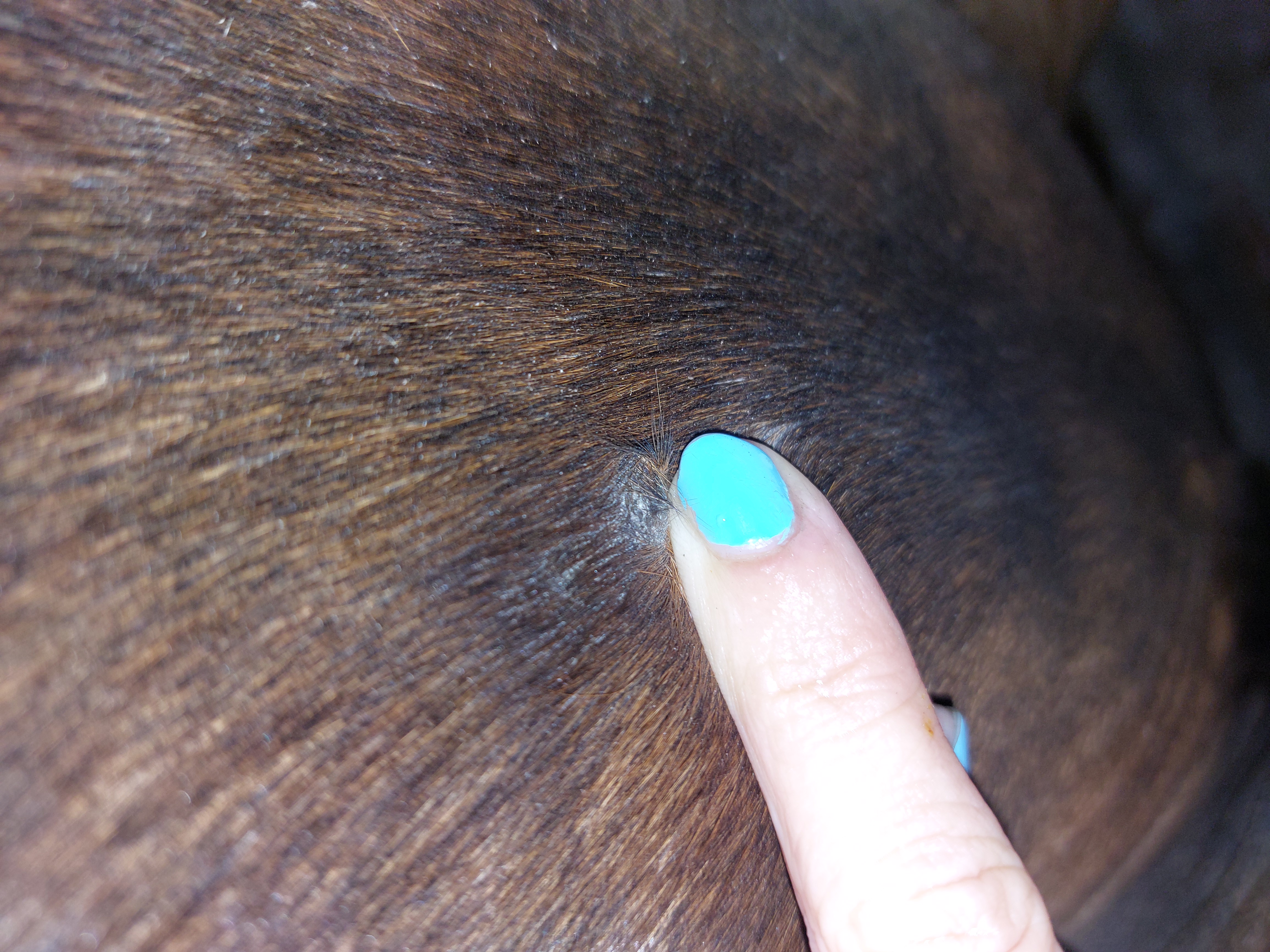 Die Stelle in der Gurtlage lässt sich leider sehr schwer fotografieren, ich müsste sie vermutlich sonst mal rasieren. Auf dem Foto lässt sich der Knubbel mehr erahnen als das er sichtbar geworden ist. Er liegt aber im Grunde wie zunächst bei dem an der Schlauchtasche noch unter der Haut, ist also noch nich fibroblastisch. Von daher würde ich tatsächlich auch befürchten, dass der vom Schmieren länger braucht und habe natürlich Sorge, dass Jaro dann wieder fit zum Reiten wäre, wir aber nicht mit Training starten können, weil er dort dann zu empfindlich für den Sattelgurt wird.