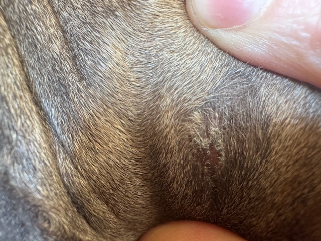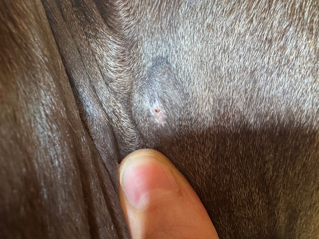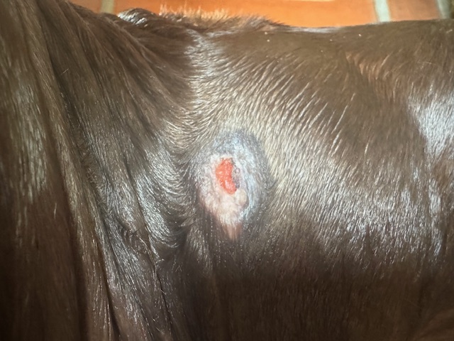 ich hatte nochmal getupft mit Dermequin und am 01.06. ist die Kruste dann abgefallen. Bild hänge ich an. Heute sieht es mit Heilsalbe dann noch immer offen aus, 2. Bild. Es ist jetzt nicht wirklich erhaben, aber krustig. Ich glaube, irgendwie kommt er dran und es öffnet sich dann immer wieder etwas. Um die Wundstelle herum ist es rosa jetzt. Ich finde schon, dass es gaaaaanz langsam kleiner wird. Aber wirklich in Zeitlupe. Soll ich noch eine Runde drehen, oder es in Ruhe lassen?