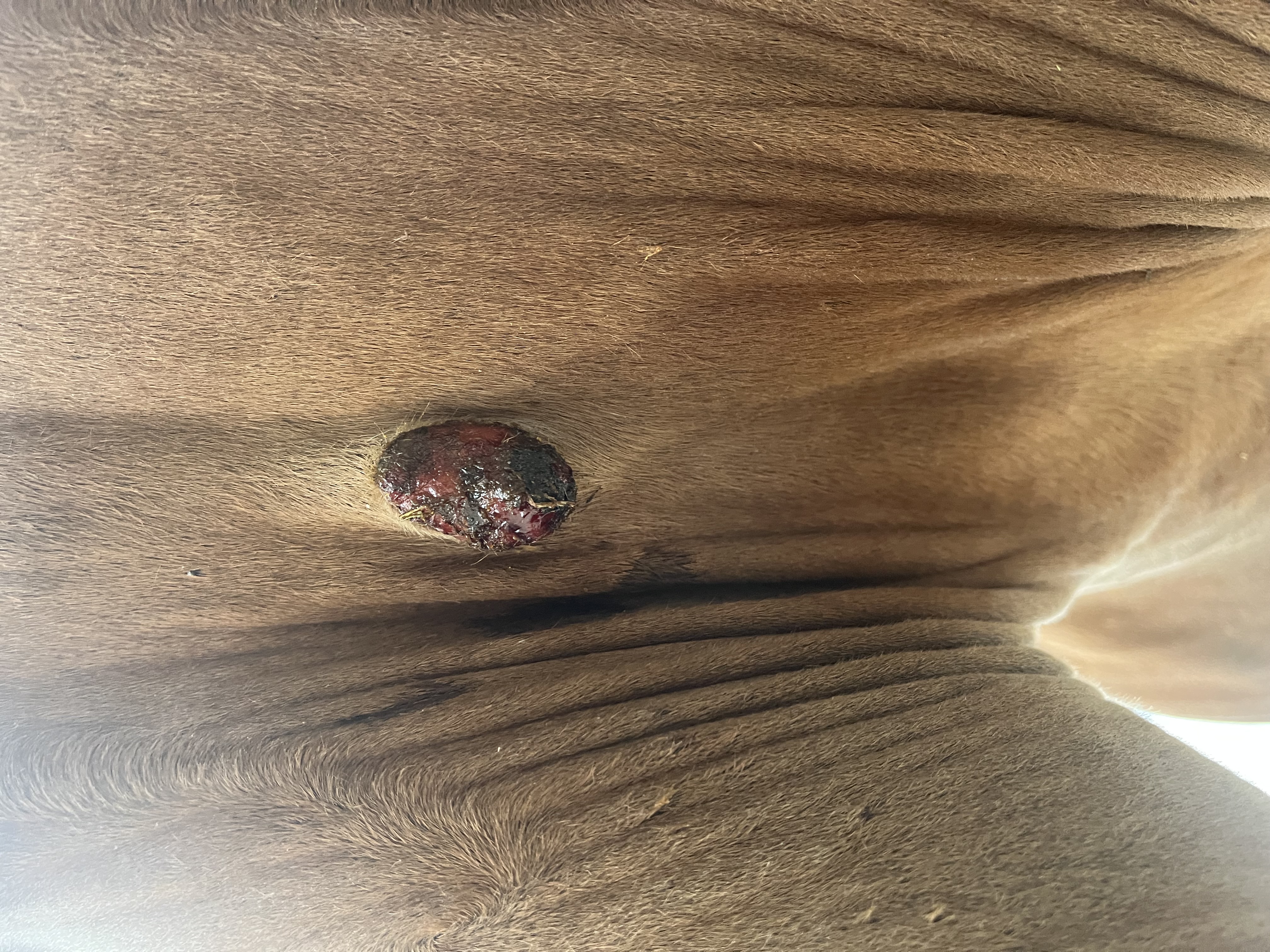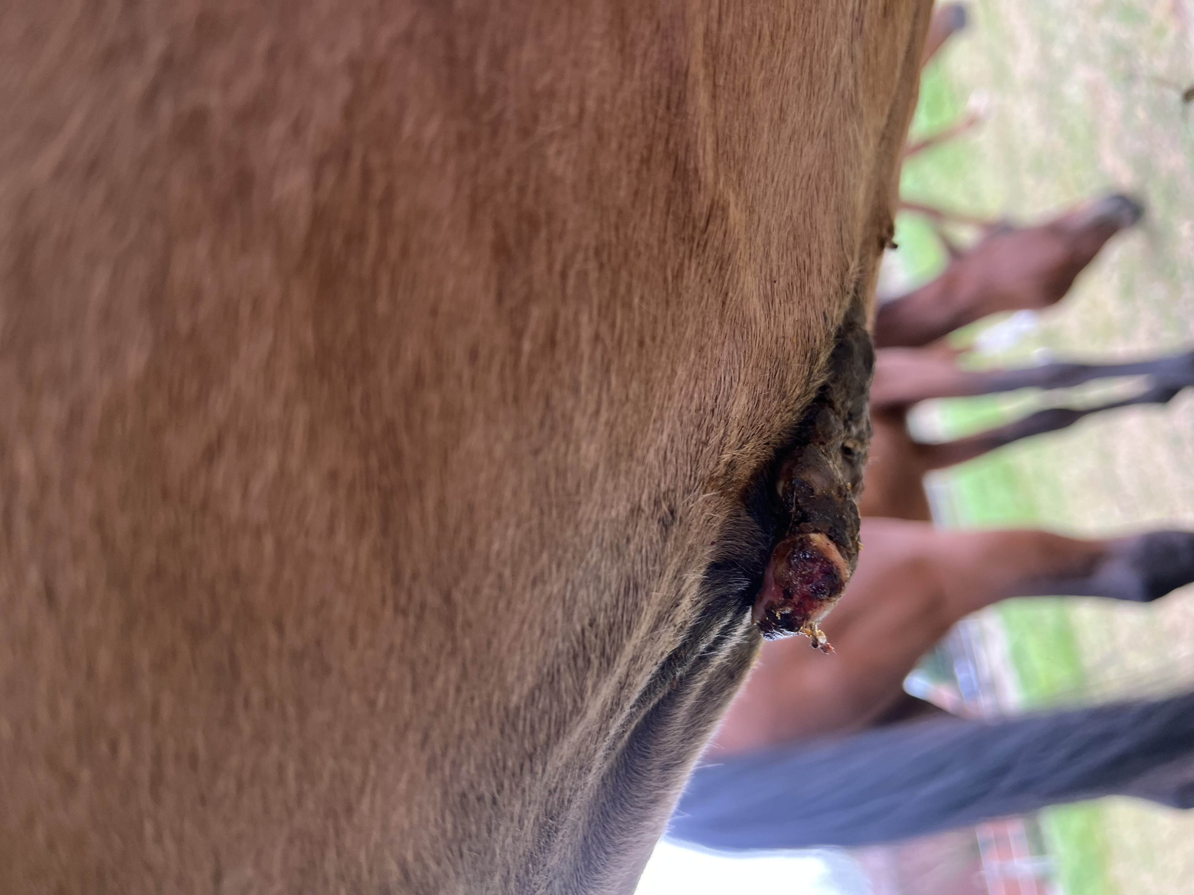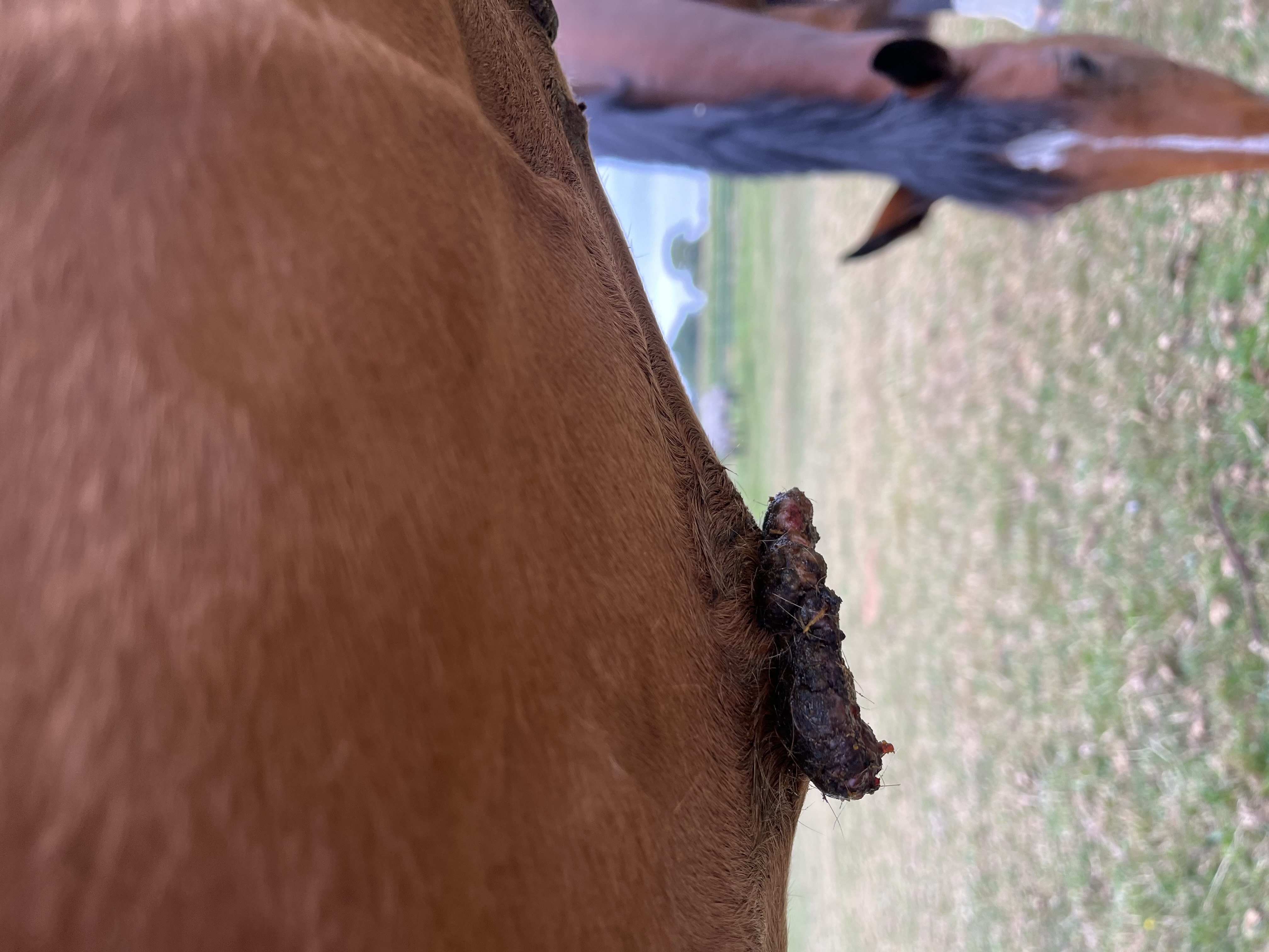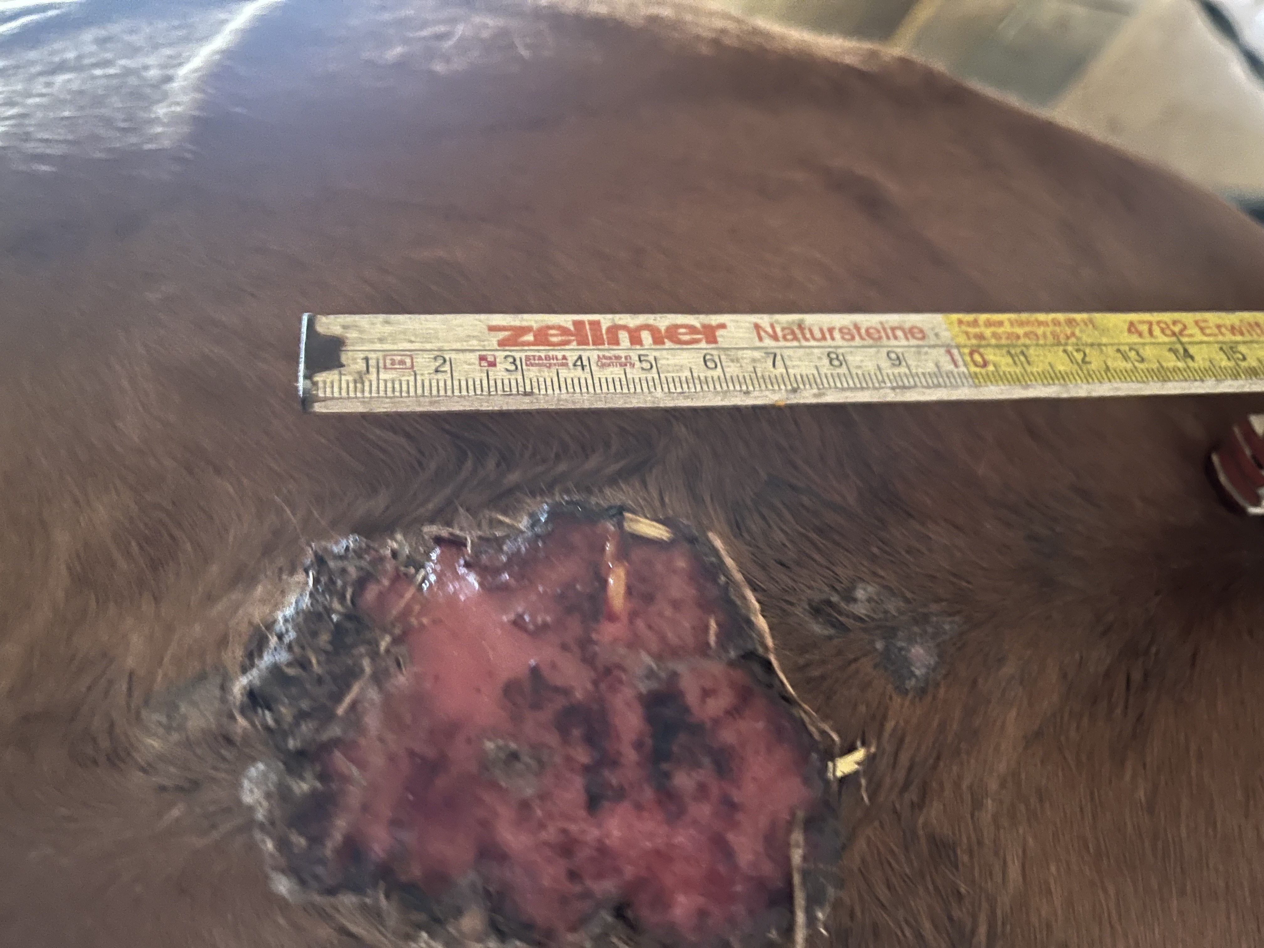 Talis kam Januar 2023 in den Stall, in dem auch meine Stute stand. Die damalige Besitzerin hat ihn mit einem Sarkoid unter dem Bauch, ähnlich groß wie das auf dem Foto, gekauft. Das Sarkoid war bereits abgebunden und ist im Laufe des Jahres abgefallen und wurde dann mit einer Tinktur (weiß nicht welche) weiter behandelt.