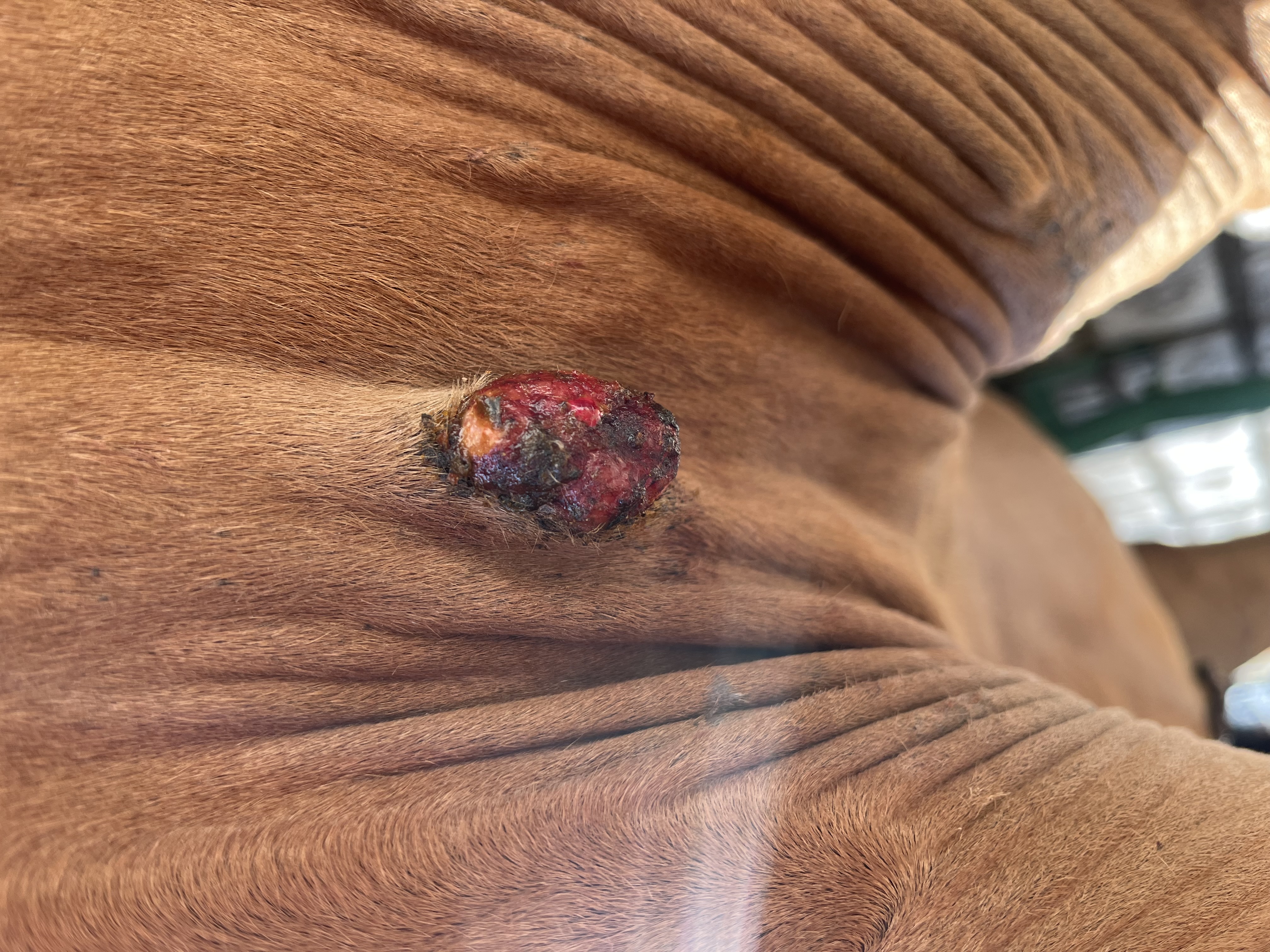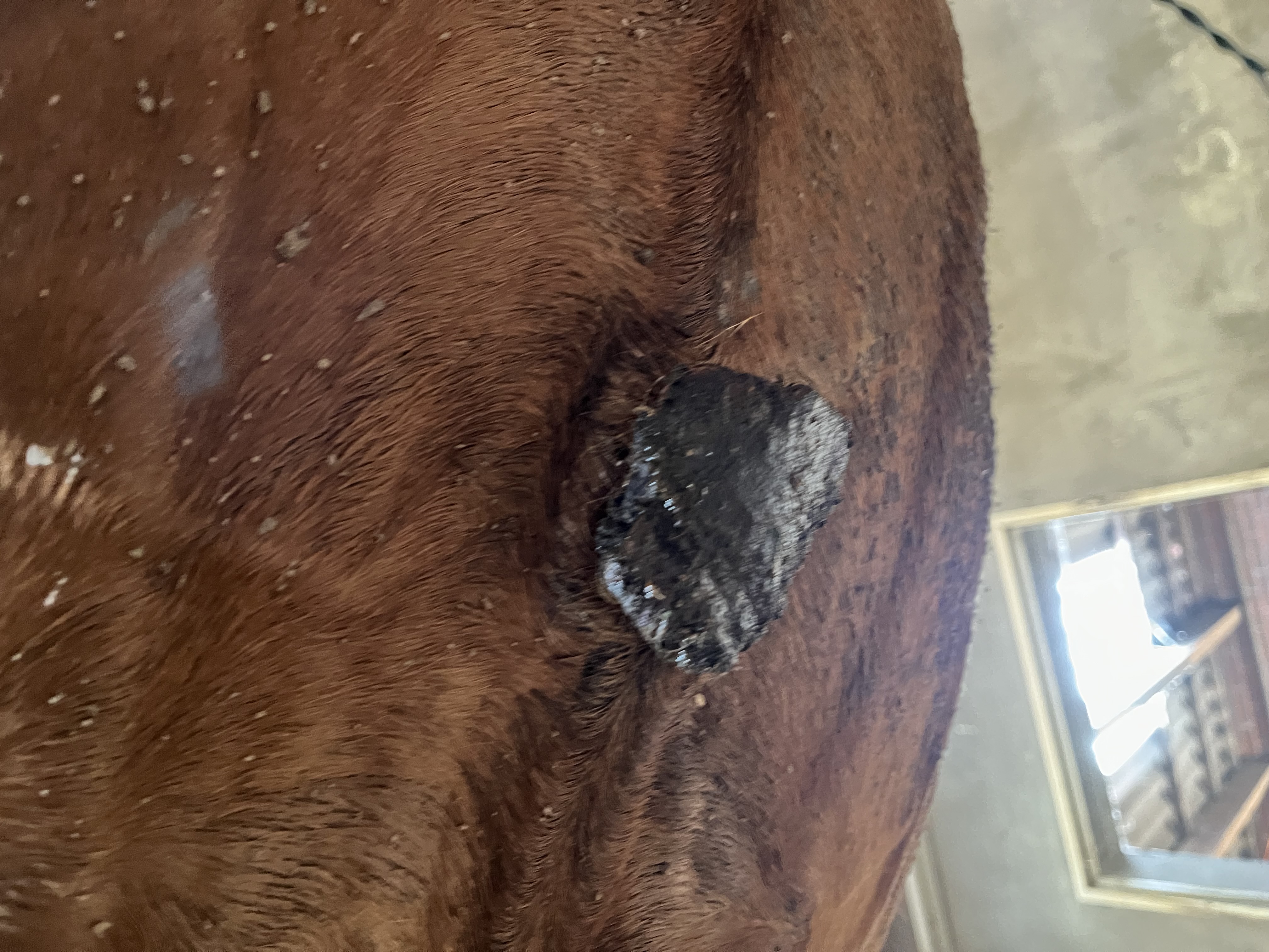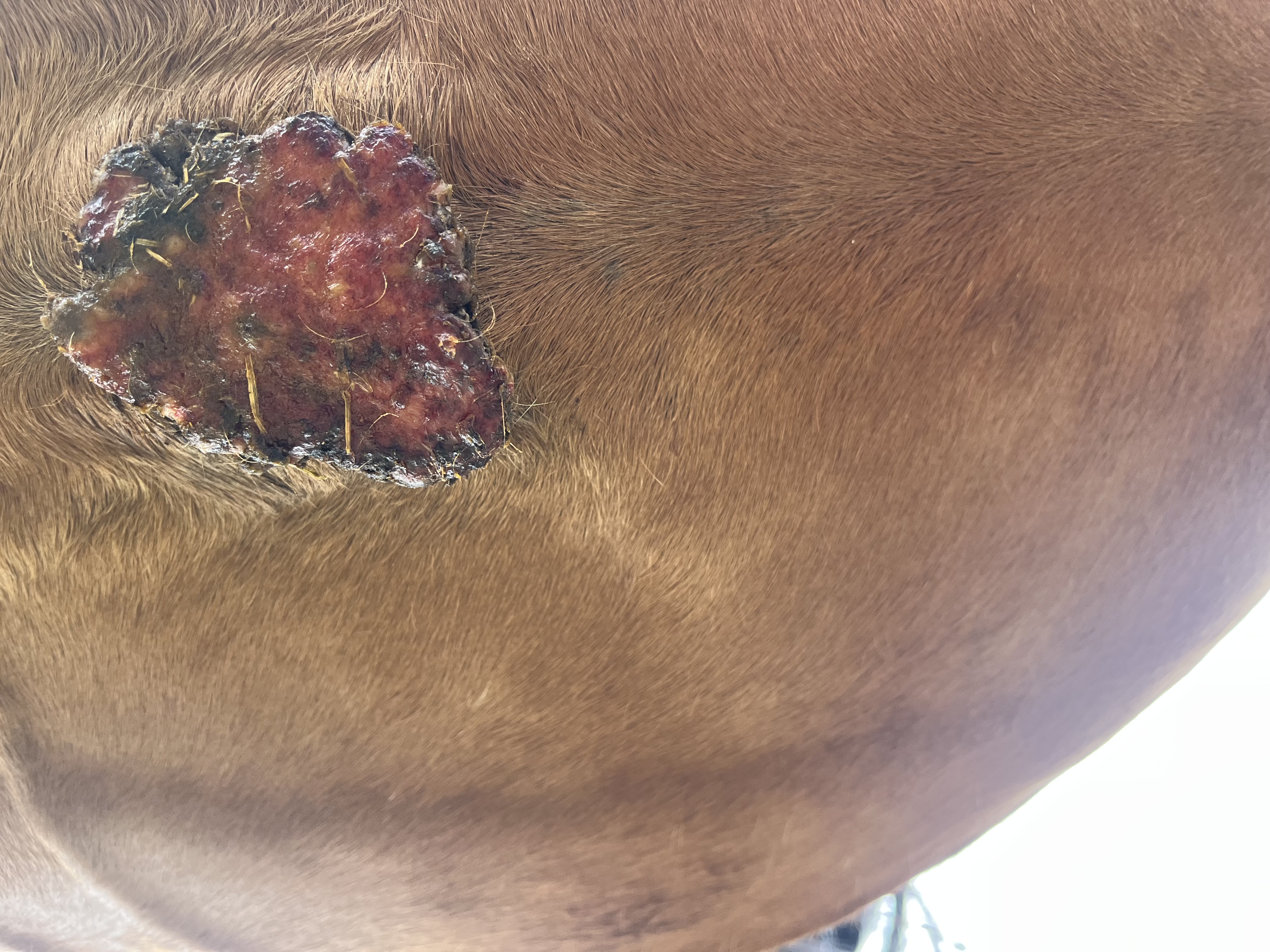 Talis kam Januar 2023 in den Stall, in dem auch meine Stute stand. Die damalige Besitzerin hat ihn mit einem Sarkoid unter dem Bauch, ähnlich groß wie das auf dem Foto, gekauft. Das Sarkoid war bereits abgebunden und ist im Laufe des Jahres abgefallen und wurde dann mit einer Tinktur (weiß nicht welche) weiter behandelt.