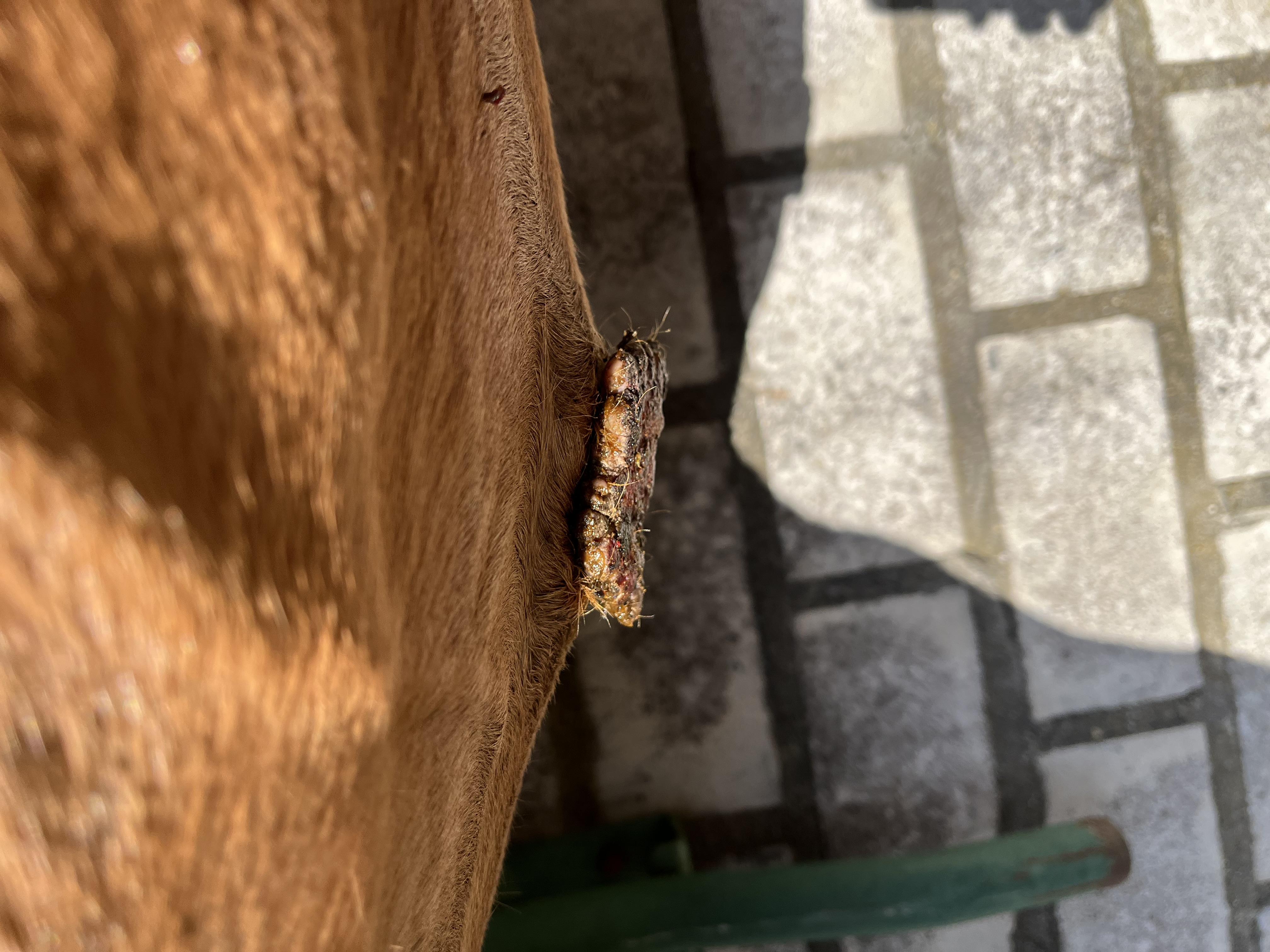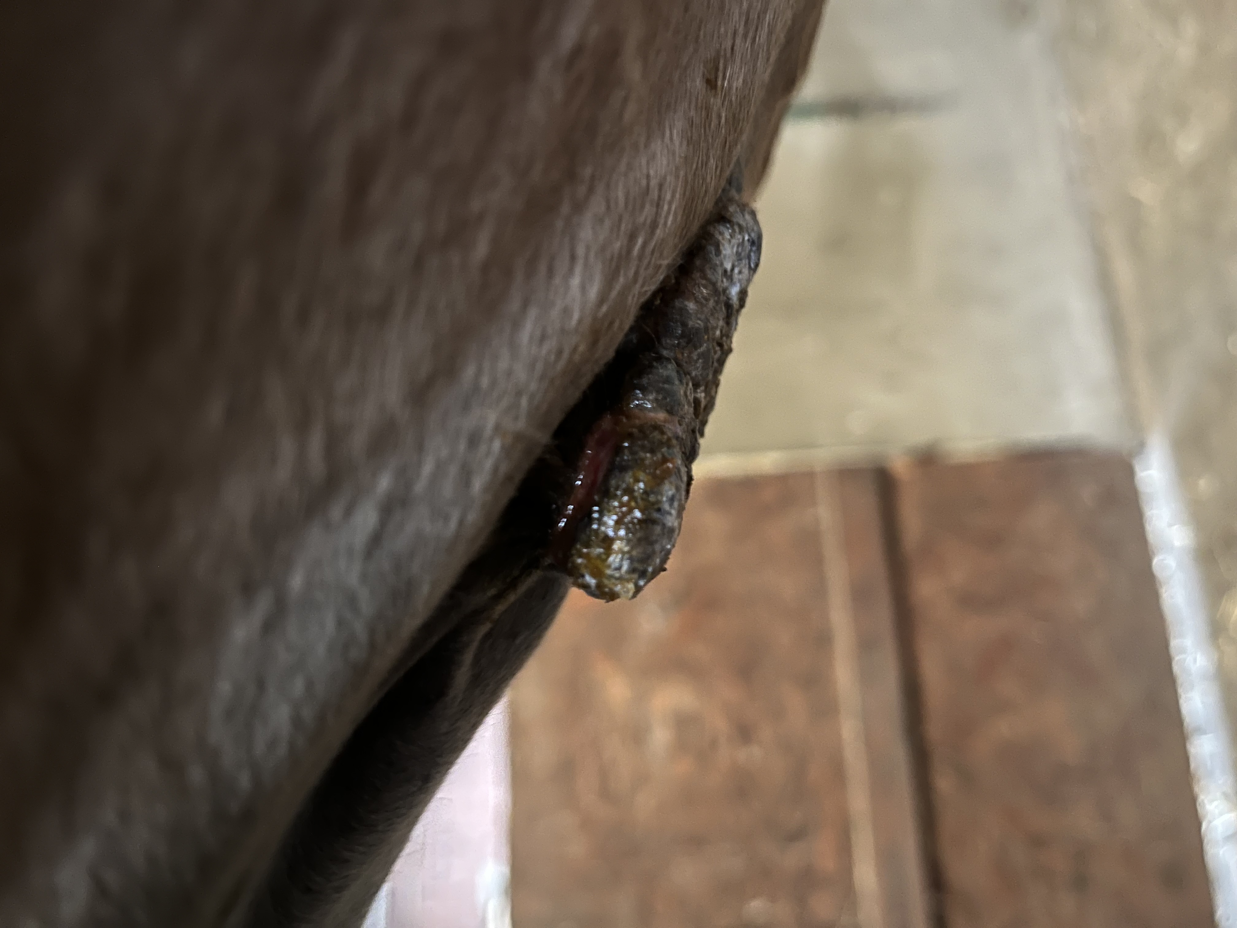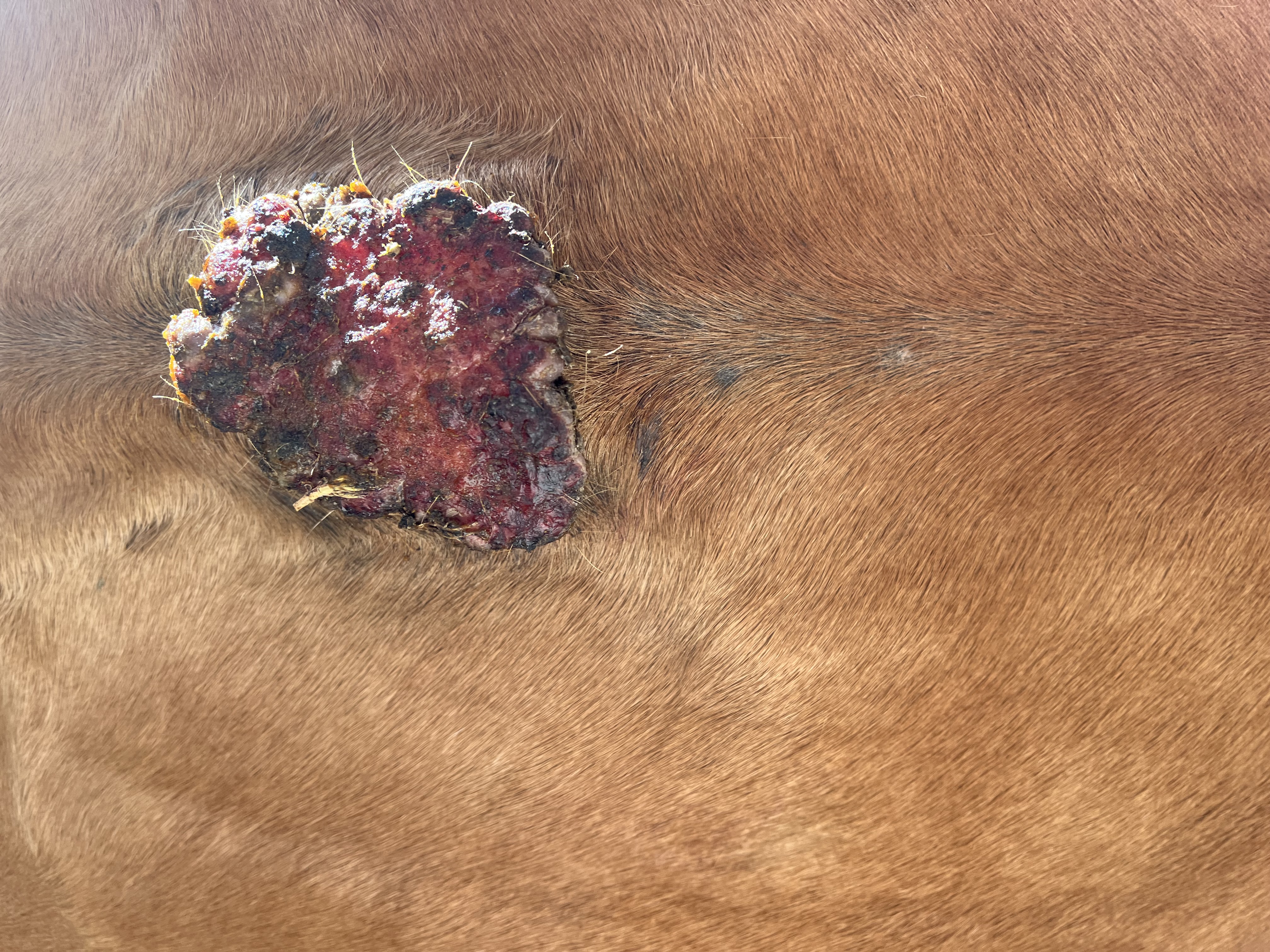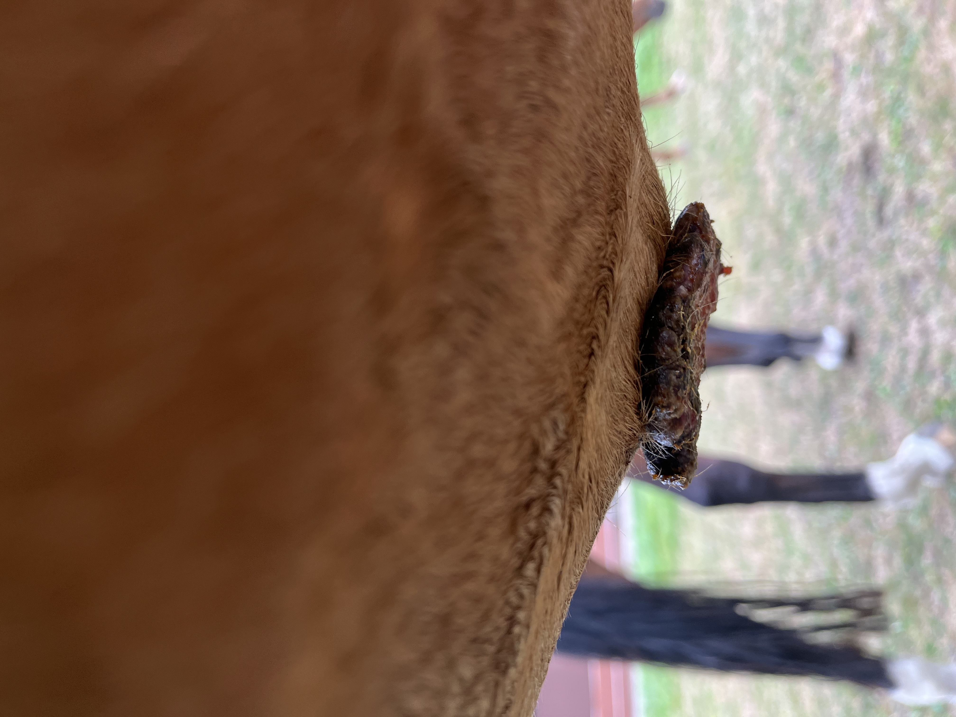 Talis kam Januar 2023 in den Stall, in dem auch meine Stute stand. Die damalige Besitzerin hat ihn mit einem Sarkoid unter dem Bauch, ähnlich groß wie das auf dem Foto, gekauft. Das Sarkoid war bereits abgebunden und ist im Laufe des Jahres abgefallen und wurde dann mit einer Tinktur (weiß nicht welche) weiter behandelt.