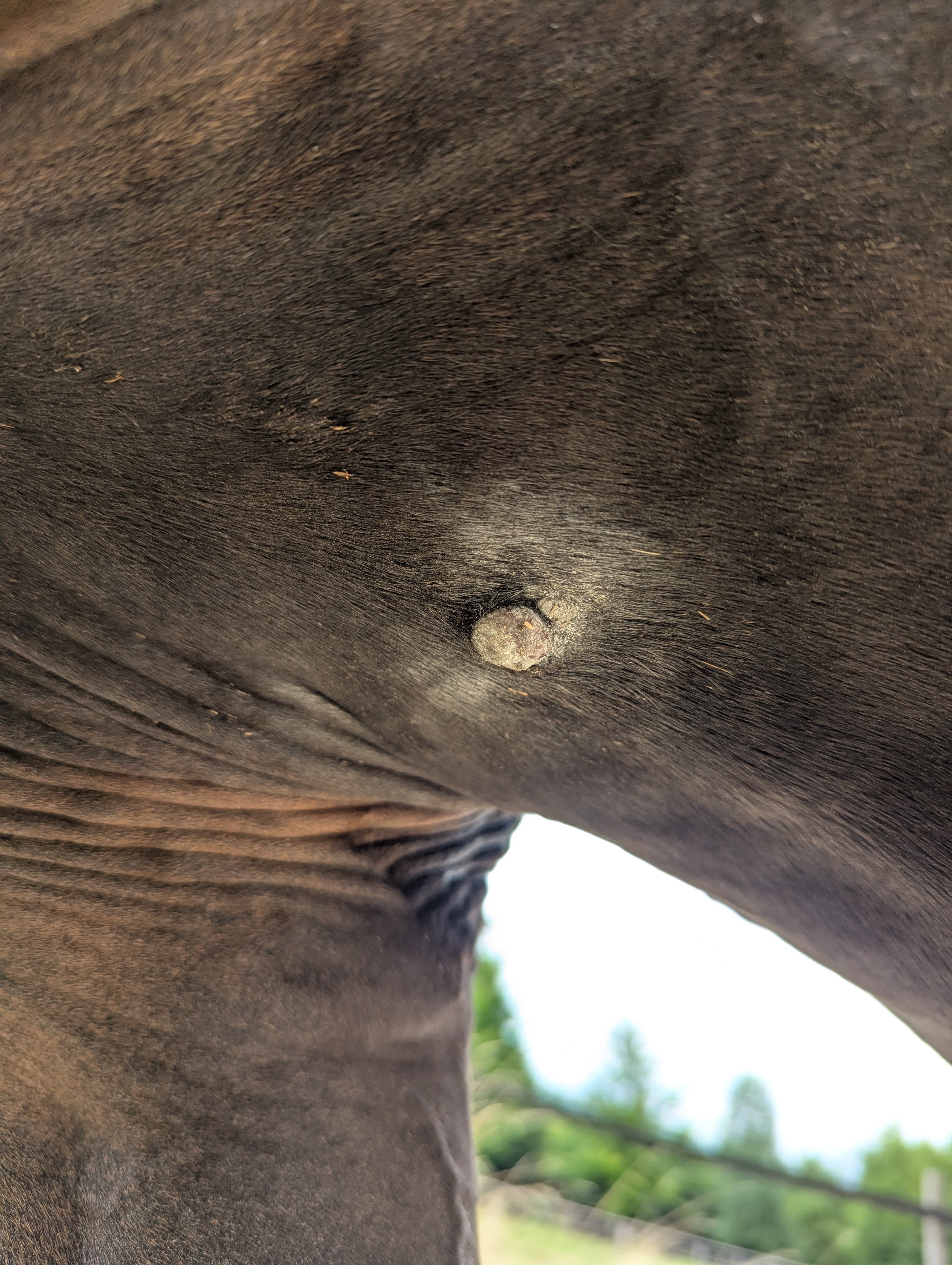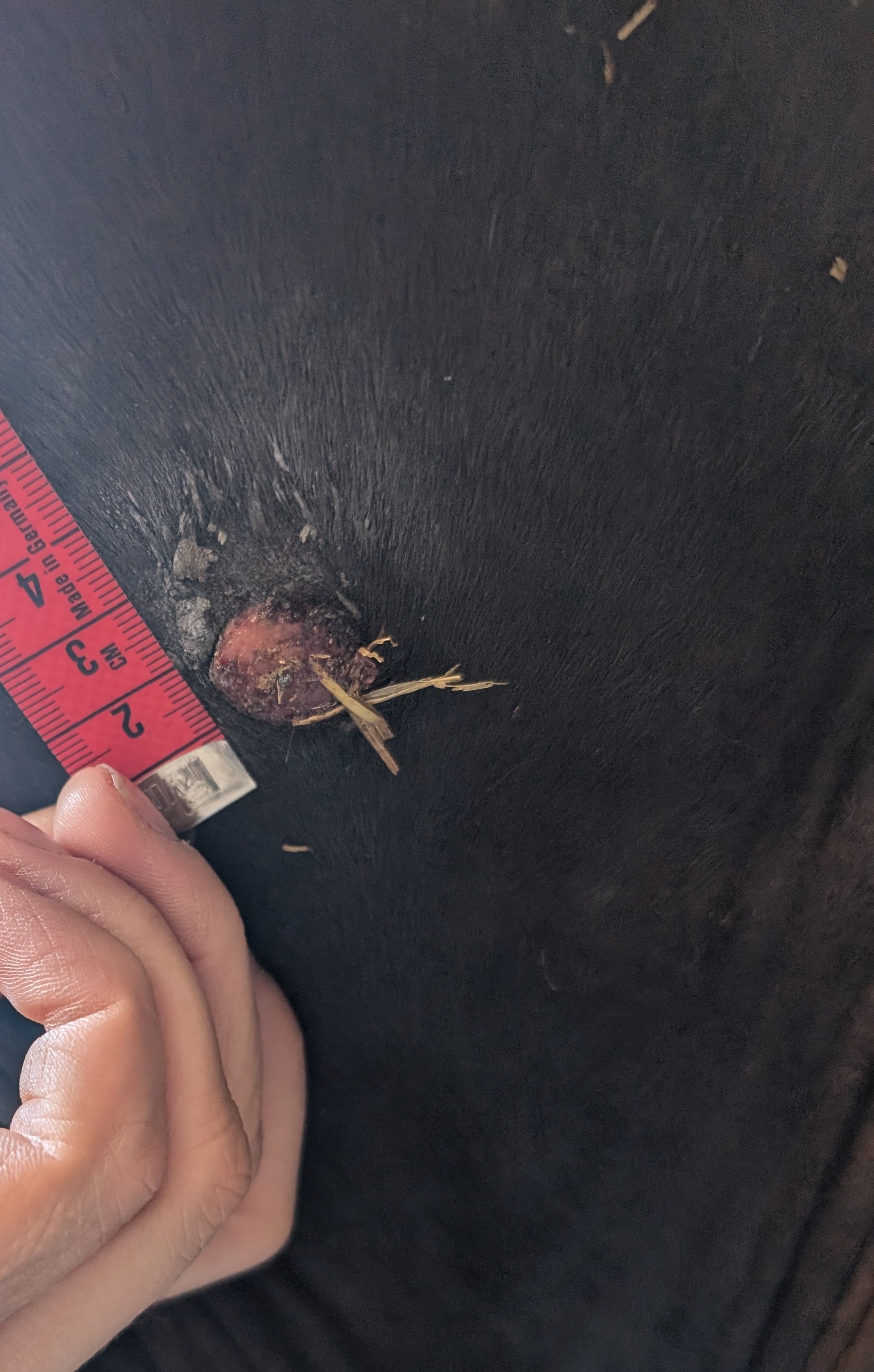 Wir haben unsere Romi vor einem halben Jahr übernommen. Sie stand in einem Offenstall und wurde 3 Jahre nicht mehr bewegt, man merkte aber, dass man früher viel mit ihr gemacht hat. Sie war absolut übergewichtig und wurde von uns in einen Stall umgestellt mit offener Box und Laufstall/Paddock. Es ist unser erstes Pferd und wir wachsen auch noch an den Aufgaben, aber bis jetzt hätten wir es nicht besser mit ihr treffen können. Sie hat auch schon gut an Gewicht verloren. Vor 3 Monaten ist uns dann dieser Knubbel aufgefallen, der krustig war, am Bauch in Gurtlage. Bzw wenn sie nicht so rund wäre, würde der Gurt davor liegen. Jetzt mit der Abnahme, liegen ca 2 Finger breit dazwischen. Im Trab rutscht der Gurt aber nach vorne und scheuert.