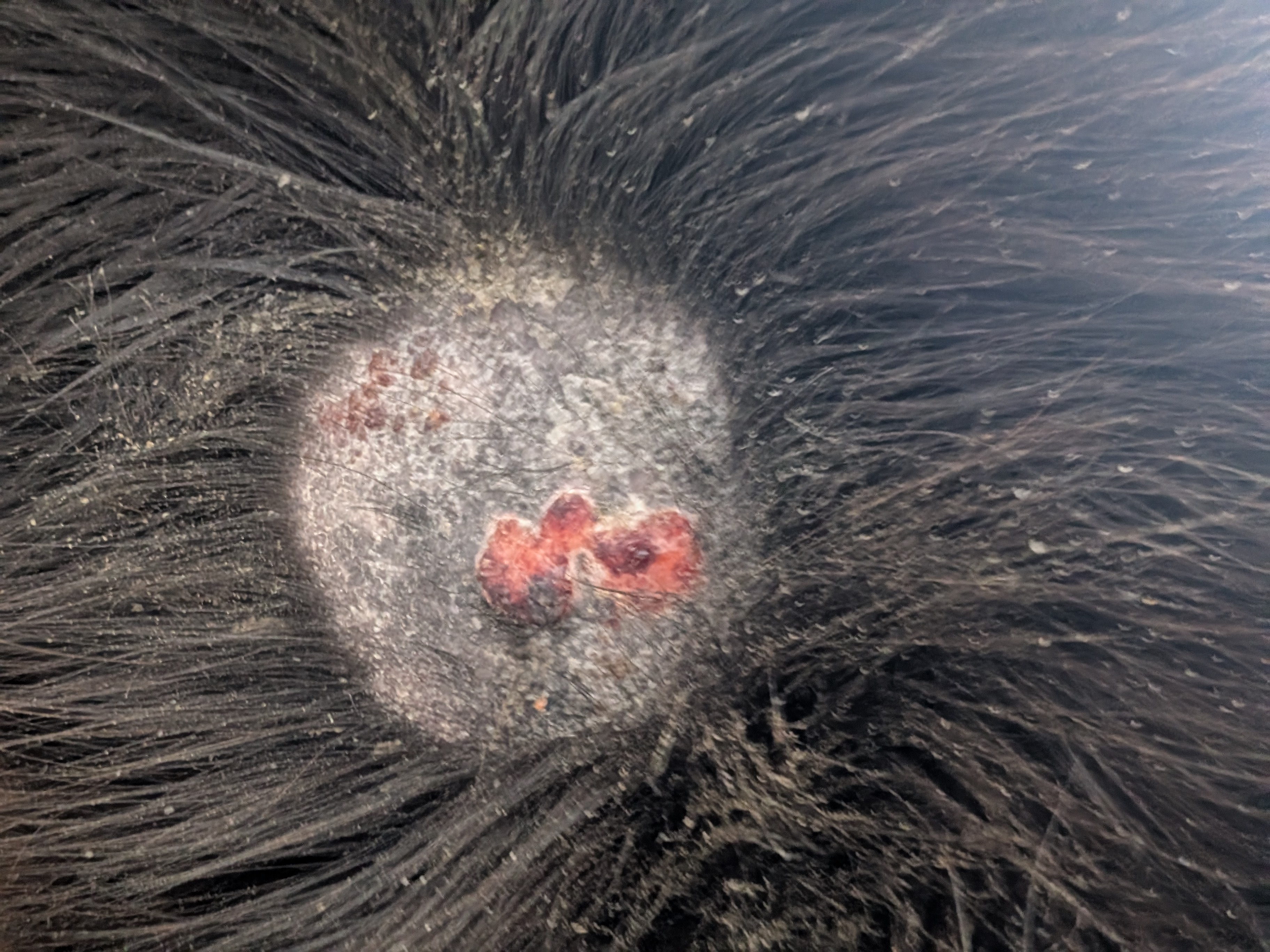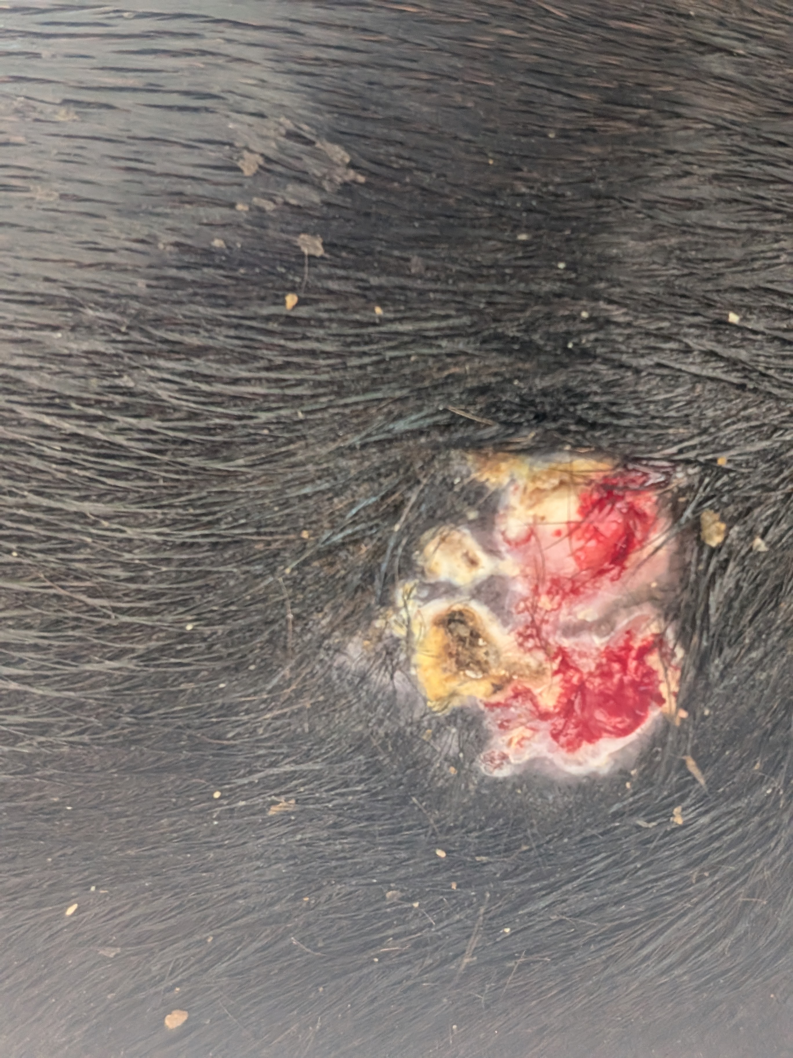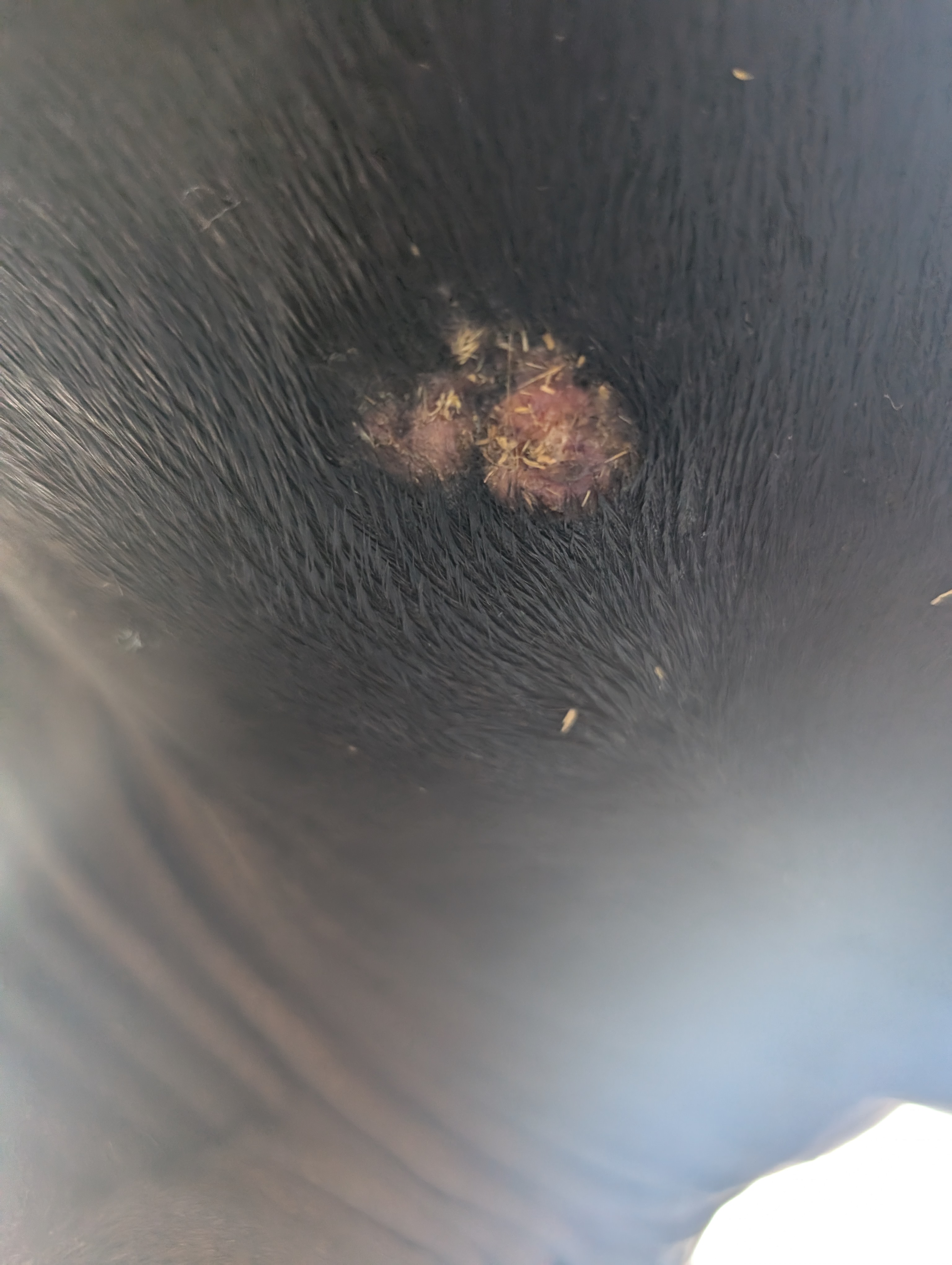 So sah es noch vor einigen Tagen aus, es bildet sich immer wieder eine Kruste, aber Romi tritt oft davor und dann ist es blutig und offen.
