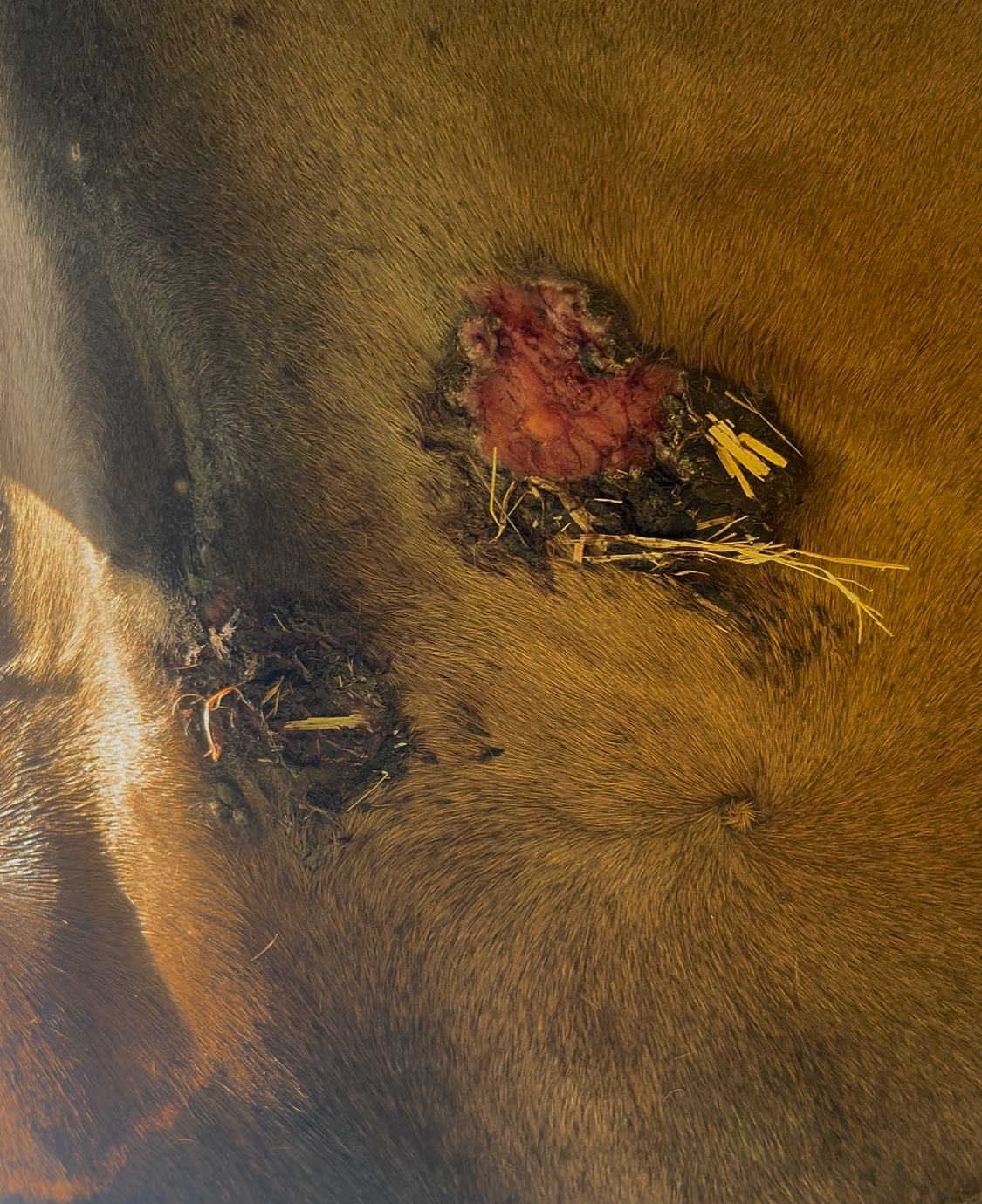 Der eine Sarkoid ist vor kurzem aufgeplatzt, was ihr offensichtlich Schmerzen bereitete und sie sich nicht mehr anfassen ließ. Es verursachte Schwellungen am Bauch, eine Wulst ist abgefallen. Seither ist es offen und das andere nebenan sieht aus, als würde es ebenso bald aufplatzen. Es wird immer dicker. Nun ist die Salbe angekommen und ich will mit der Behandlung beginnen.