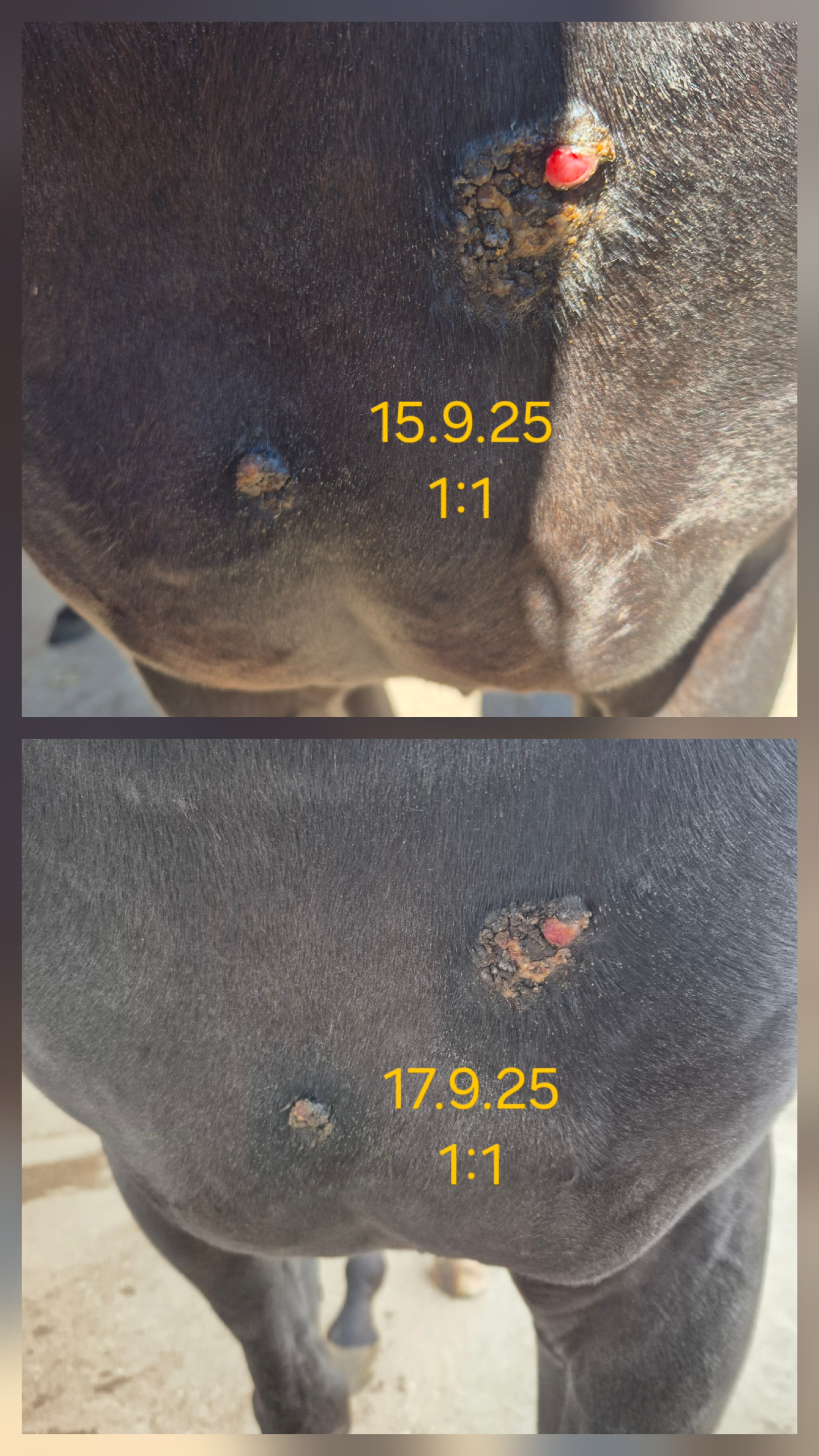 Mache immer mal Pausentage und schmiere dann mit 1:5. Krustet immer wieder und diese löst sich. Kann aber nicht richtig sehen ob es weniger wird oder was noch da ist