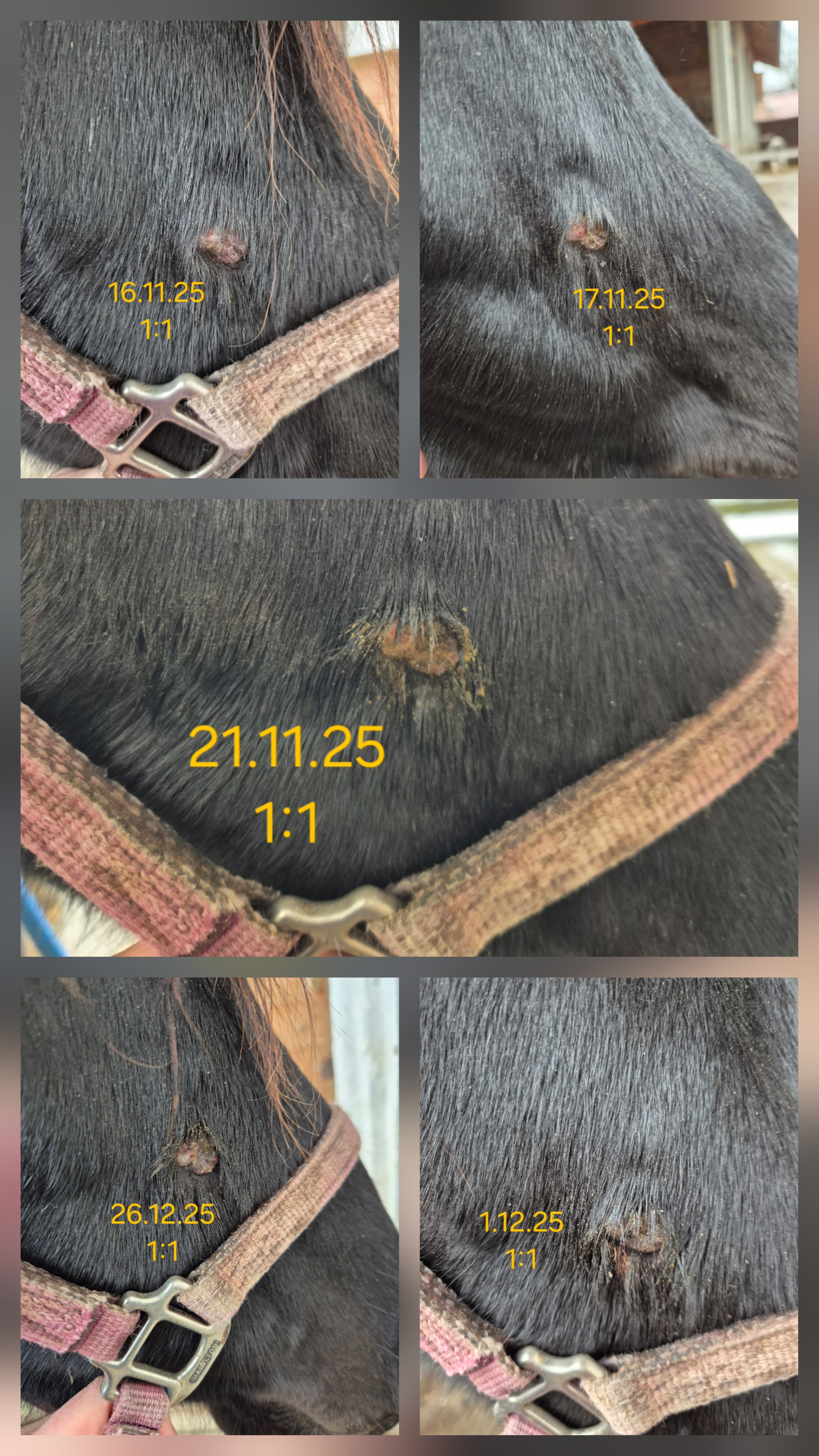 Das Sarkoid am Kopf wächst leider wieder. Bin wieder dran mit 1:1. Braucht noch ein bisschen bis es zu reagieren anfängt.