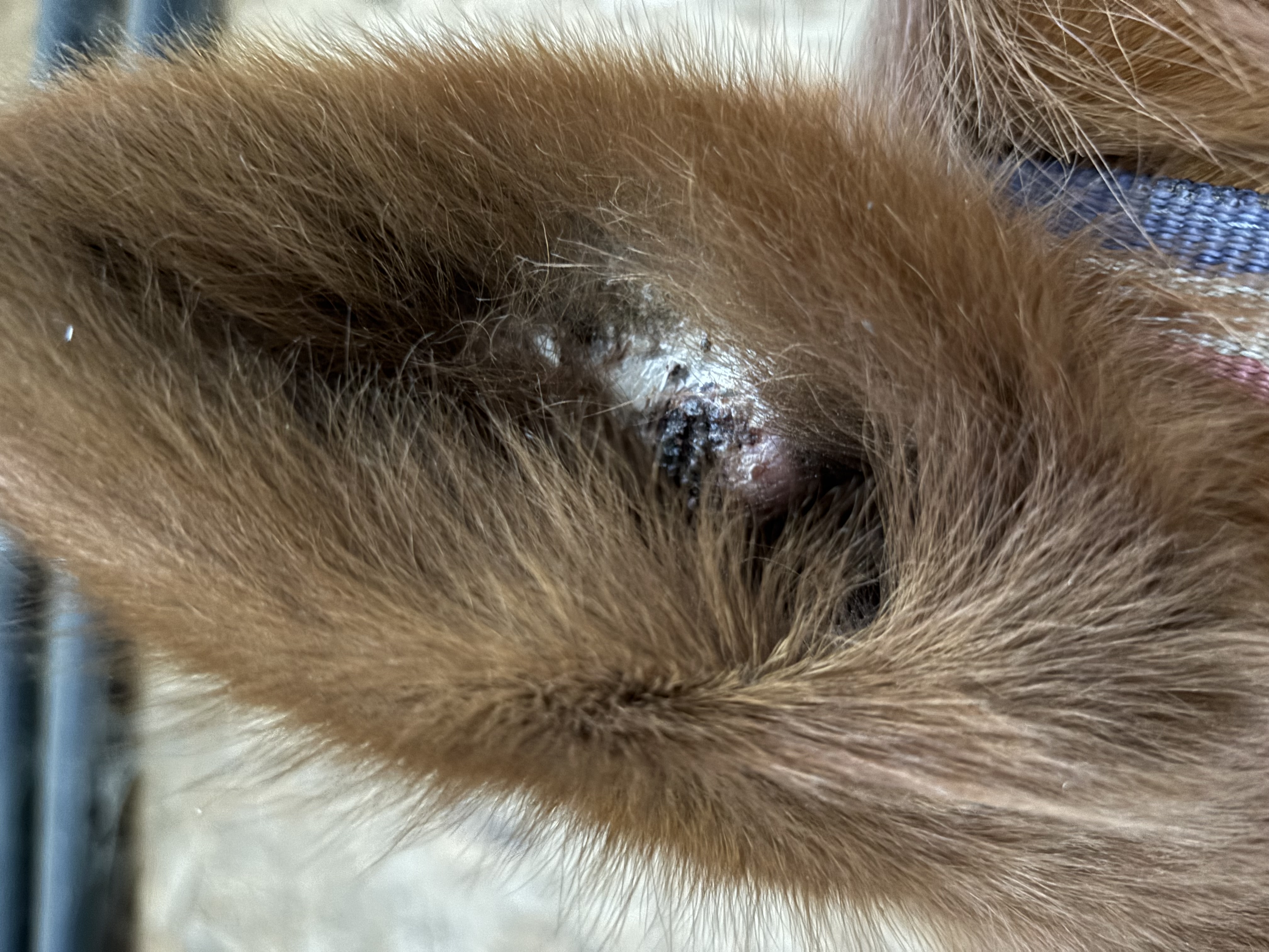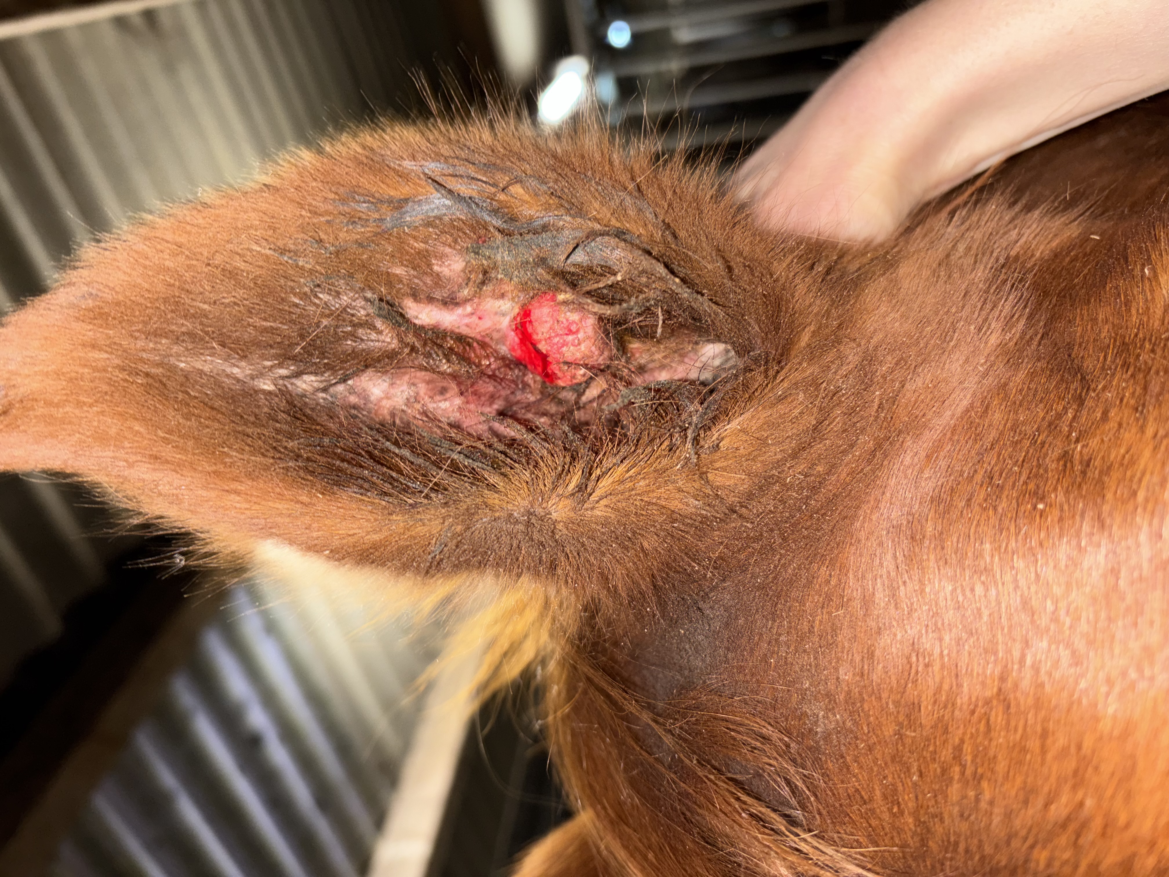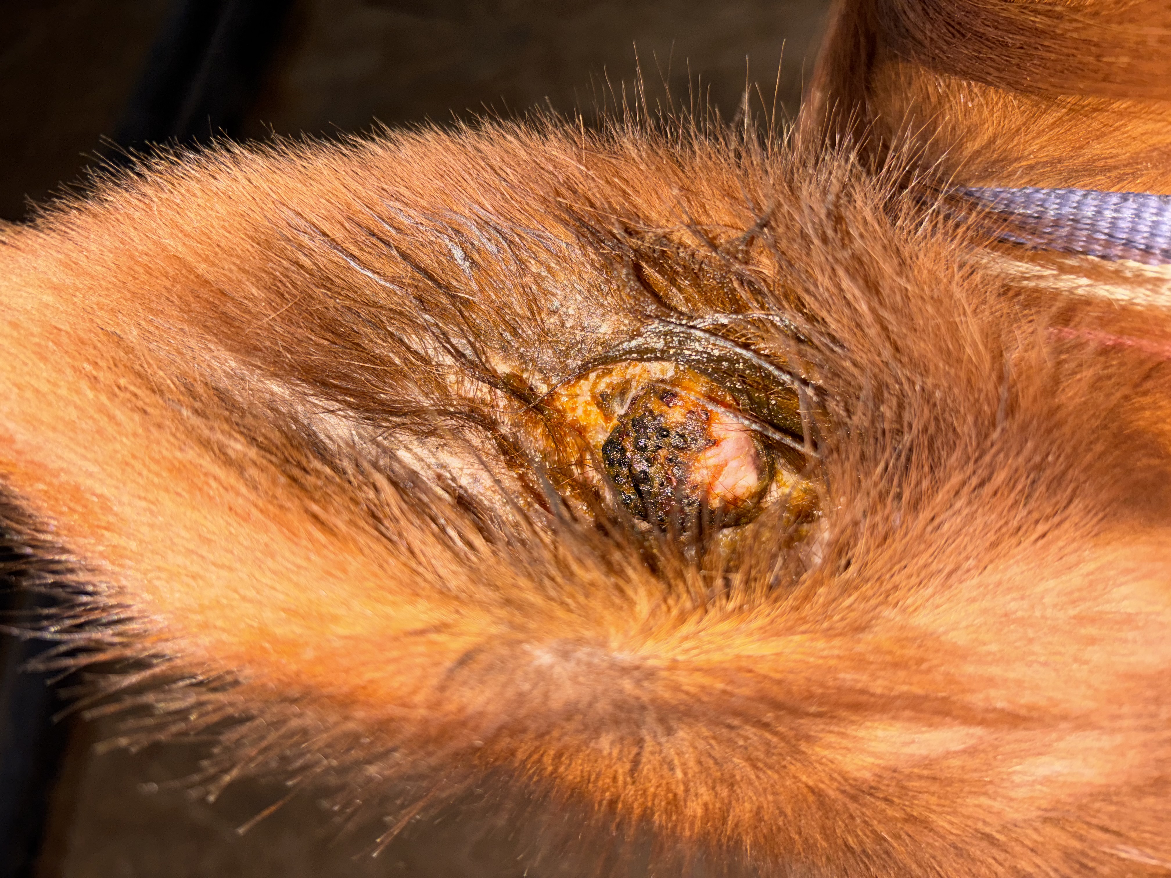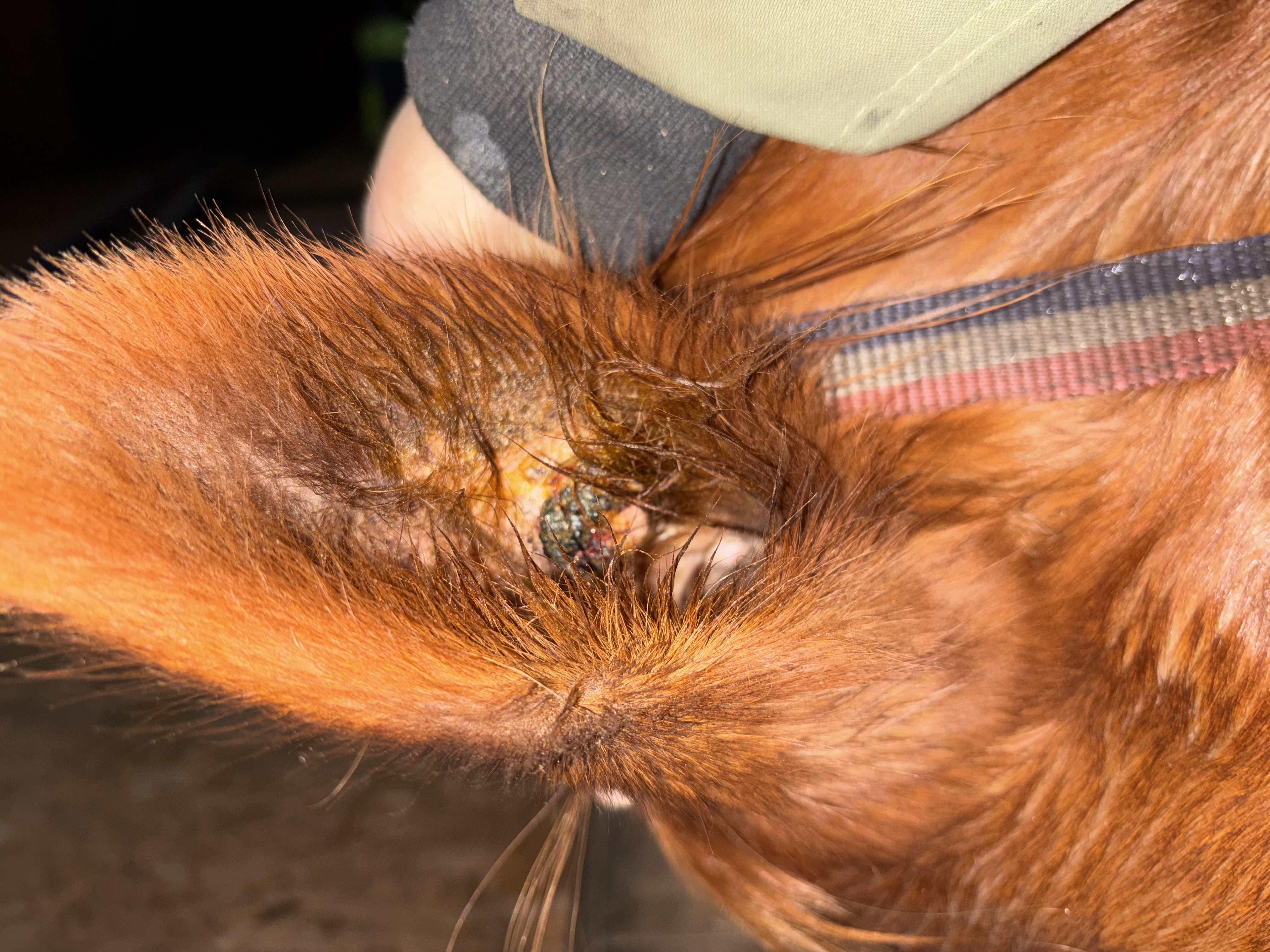 Dieses Bild ist von heute. Beim eincremen des Sarkoids ging ein Teil der Kruste schon ab. Als ich ein paar Minute später nochmal geschaut habe, war die ganze Kruste ab und es hat etwas geblutet ( siehe Bild). mein Pferd hat sich auch ein paar Mal geschüttelt, ich glaube er hatte etwas Juckreiz und sich dann auch etwas gescheuert. Ist das bis jetzt alles ok so?