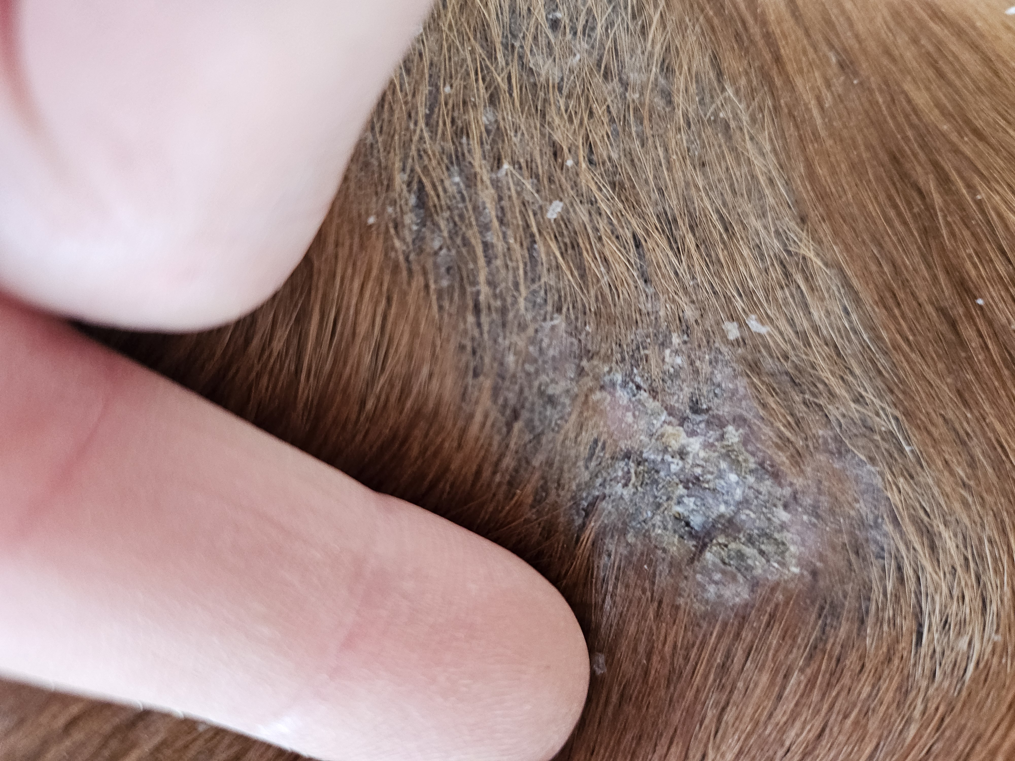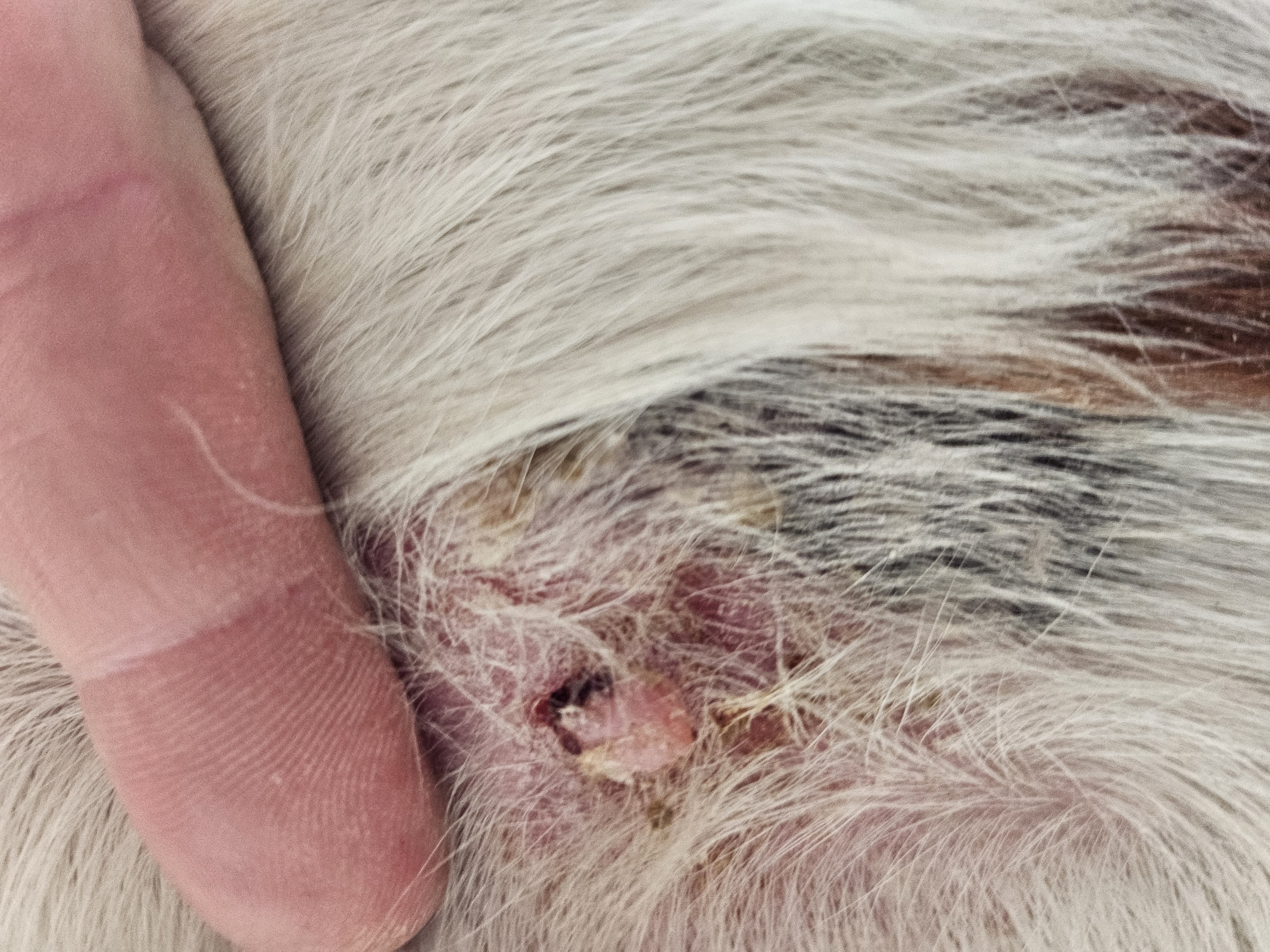 Vielen Dank für Dein Feedback Andrea! Das stimmt mich doch recht hoffnungsvoll. Ich bin nicht ganz sicher ob da wirklich schon alles an Sarkoidzellen raus ist. Am Bauch haben wir noch so einen kleinen rosanen Knopf, bei dem war ich mir nie ganz sicher ob es ein Sarkoid ist, aber es verkleinert sich durch CompX also geh ich davon aus es ist eines, an der Brust haben wir in der Mitte noch eine wie verhornt wirkende Stelle, hoffe man kann es auf den Fotos einigermaßen erkennen. Bei uns steht nächste Woche ein Impftermin an, trotzdem weiter mit der 1:5 Verdünnung? Hier die versprochenen Bilder von heute: