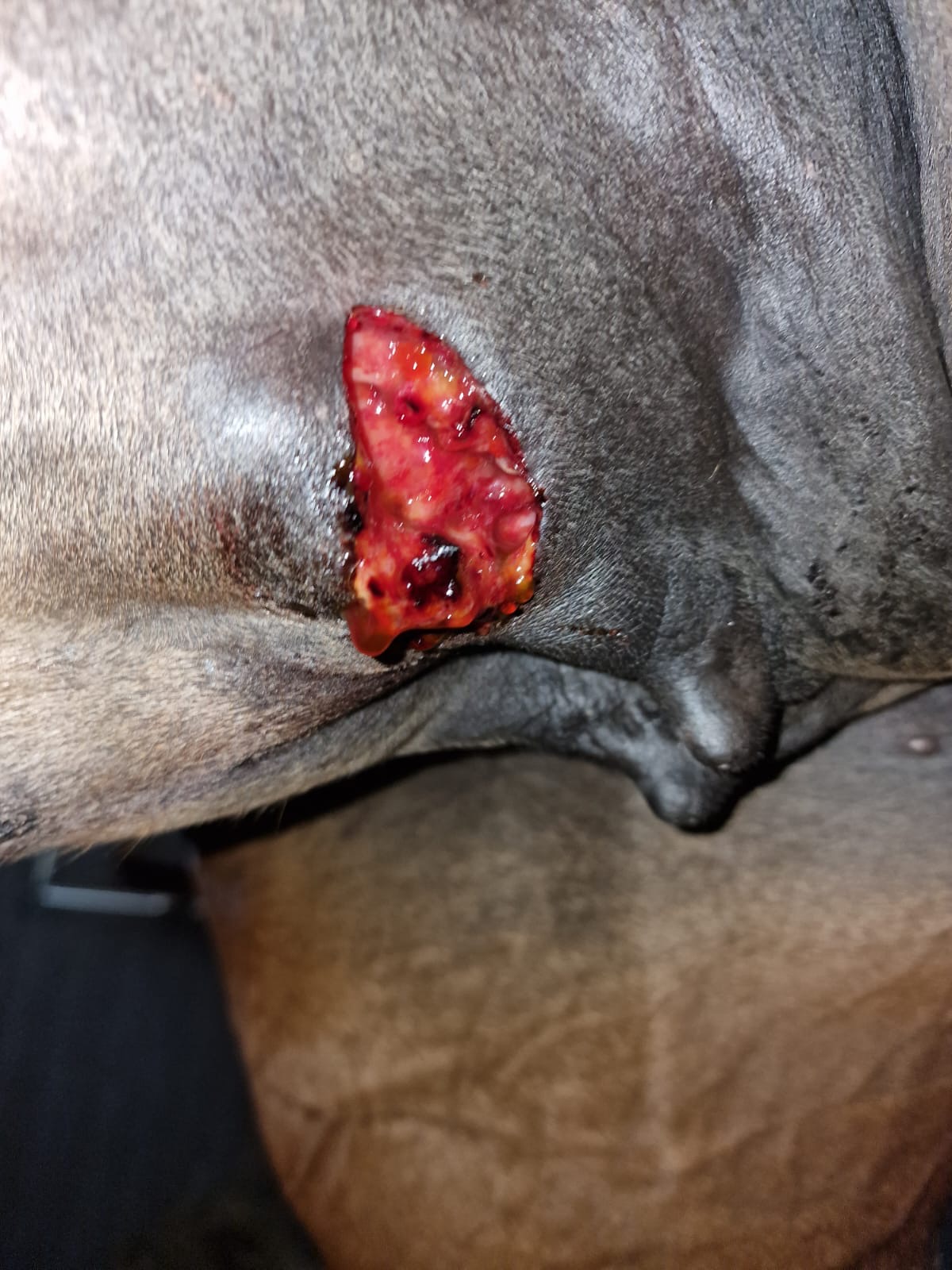 Am 4/5 Tag platzte daraufhin das Gesäuge direkt da auf wo sich dieser harte Strang befand. Nach ca. 4 Wochen täglicher Reinigung mit Wasserstoffperoxid 3% wuchs alles wieder schön zu. Und seither ist in dem Bereich wieder alles schön weich und geschmeidig. Andere gestielten Sarkoide in der Gurtlage fielen zwar für den Moment ab, aber den Knoten unter der Haut hat es nicht geholfen zu beseitigen. Da kommt nun wieder CompX ins Spiel.