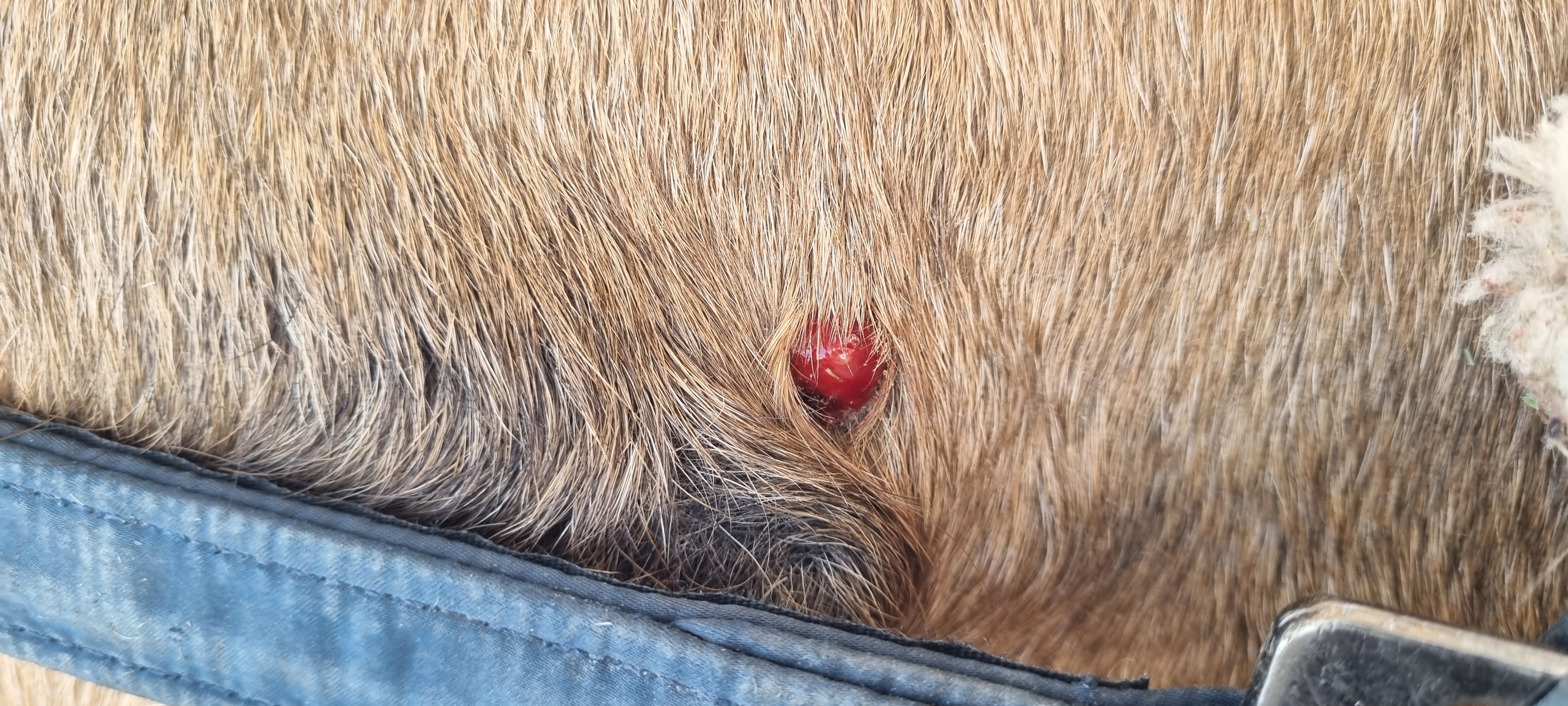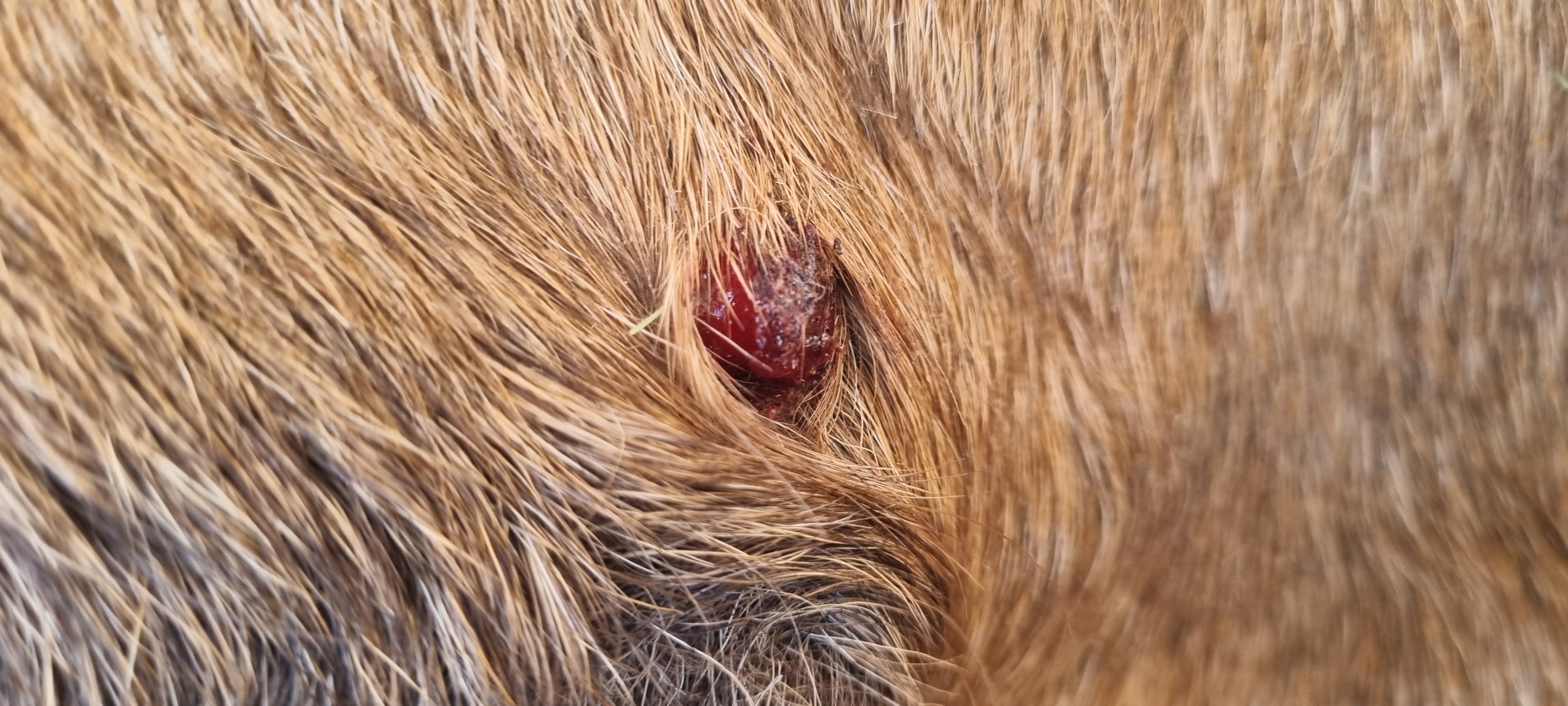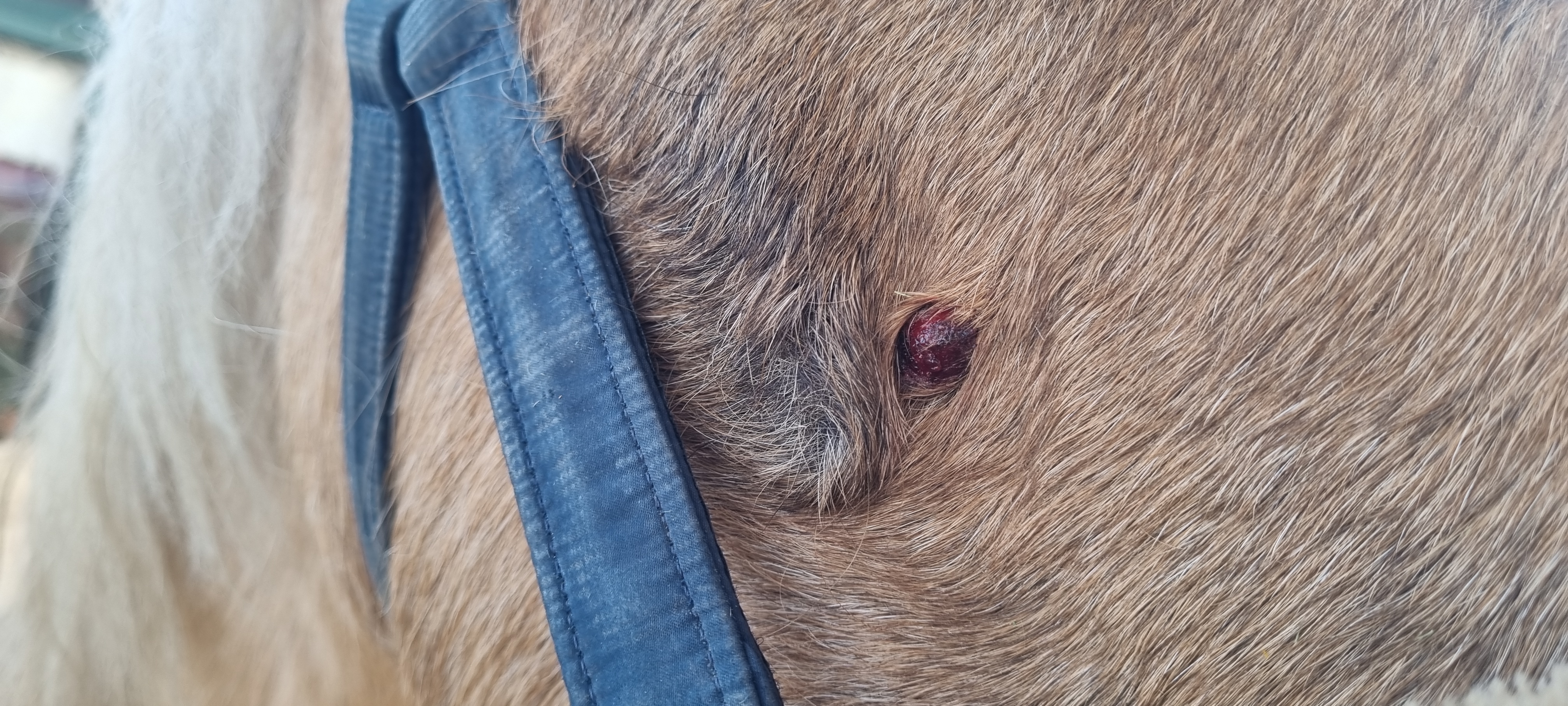 Das Sarkoid ist jetzt in etwa ebsengroß und leider haut er sich das Ding dauernd an der Heuraufe auf.