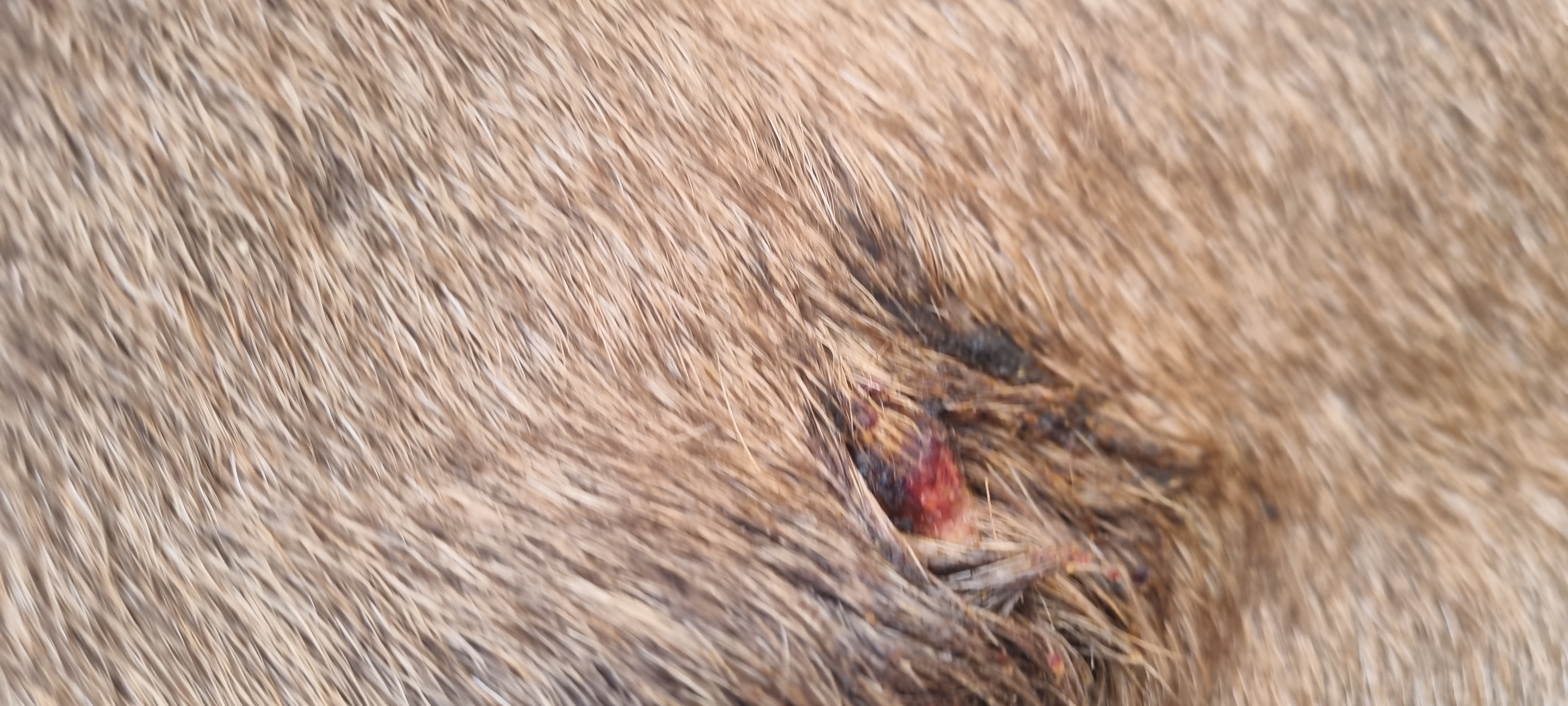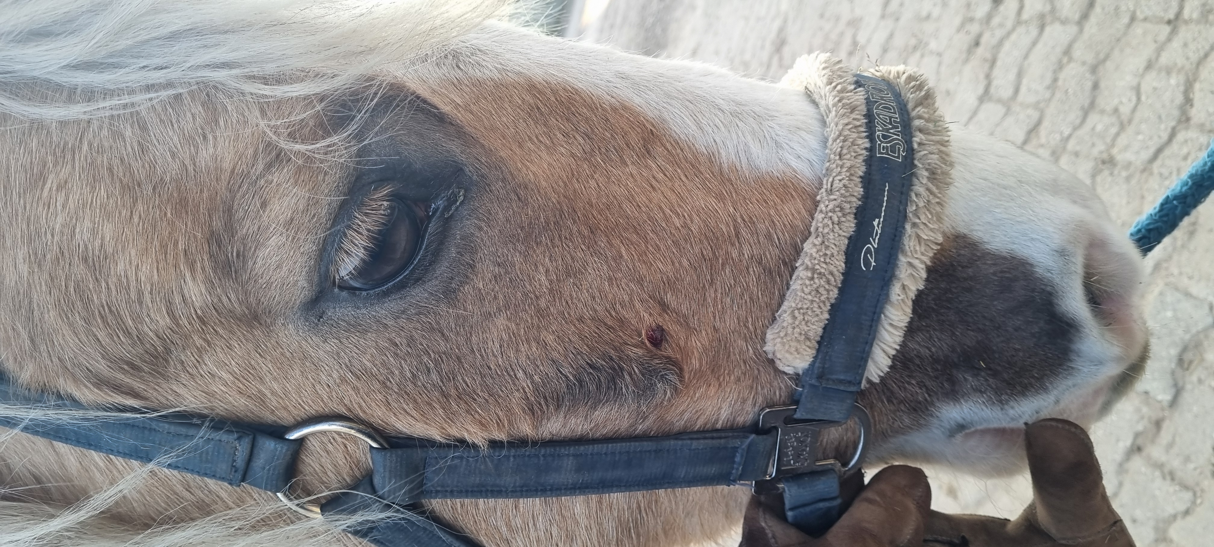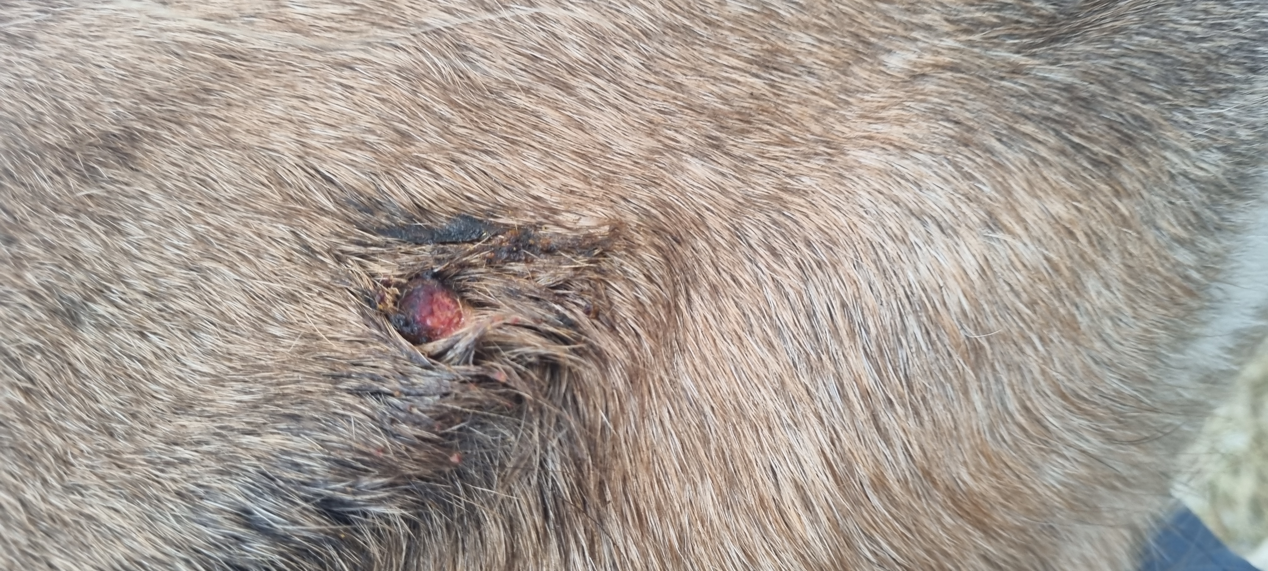 Das Sarkoid ist jetzt in etwa ebsengroß und leider haut er sich das Ding dauernd an der Heuraufe auf.