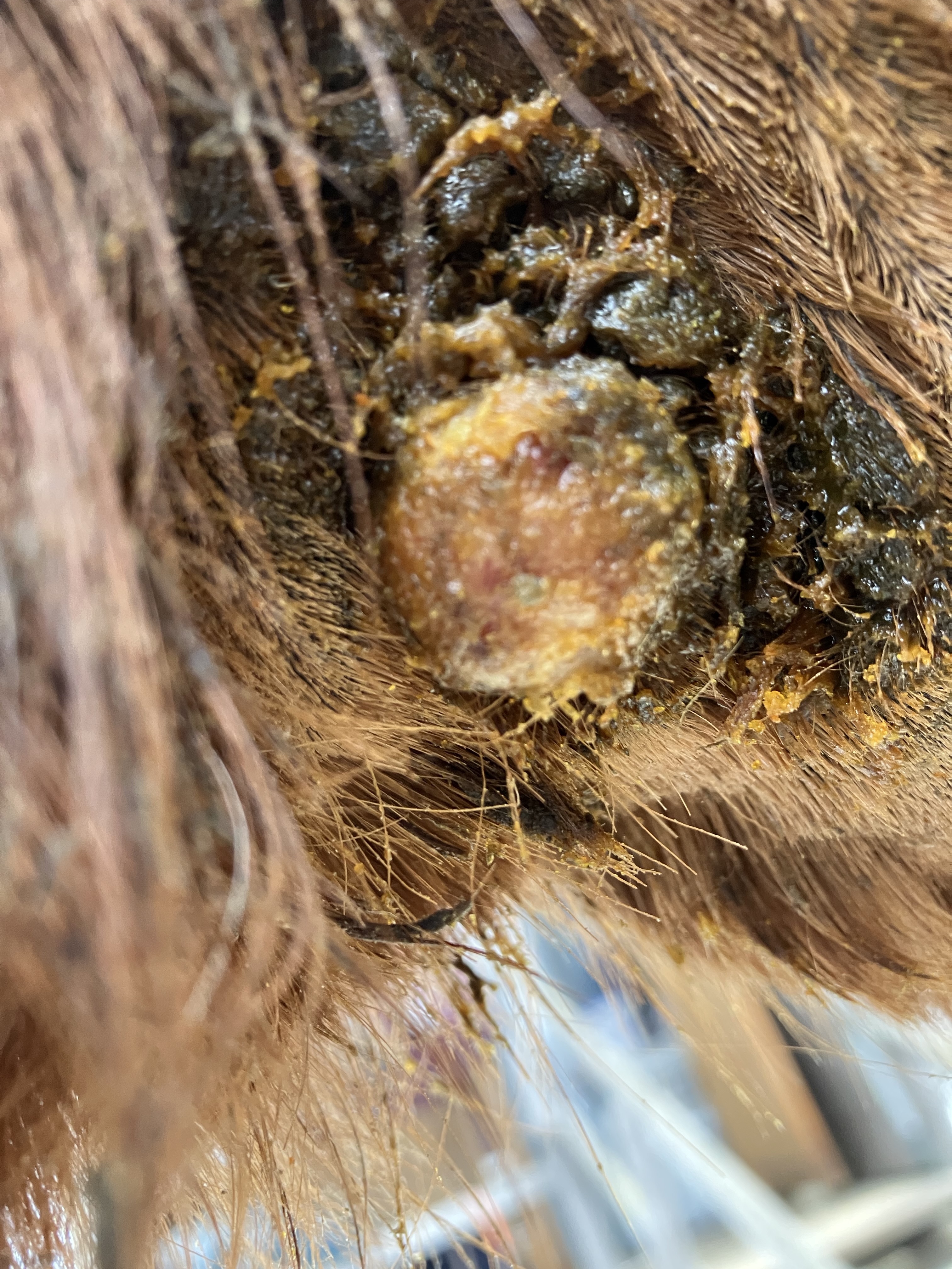 Danach gab es von meiner TÄ die Idee das Tumorvakzin herstellen zu lassen und dafür brauchte sie genügend Material so dass wir den vorderen Boppel ohne Behandlung gelassen haben. In dieser Zeit sollte ich den Rest mit "Virgan" einschmieren. Das hat nichts gebracht.
