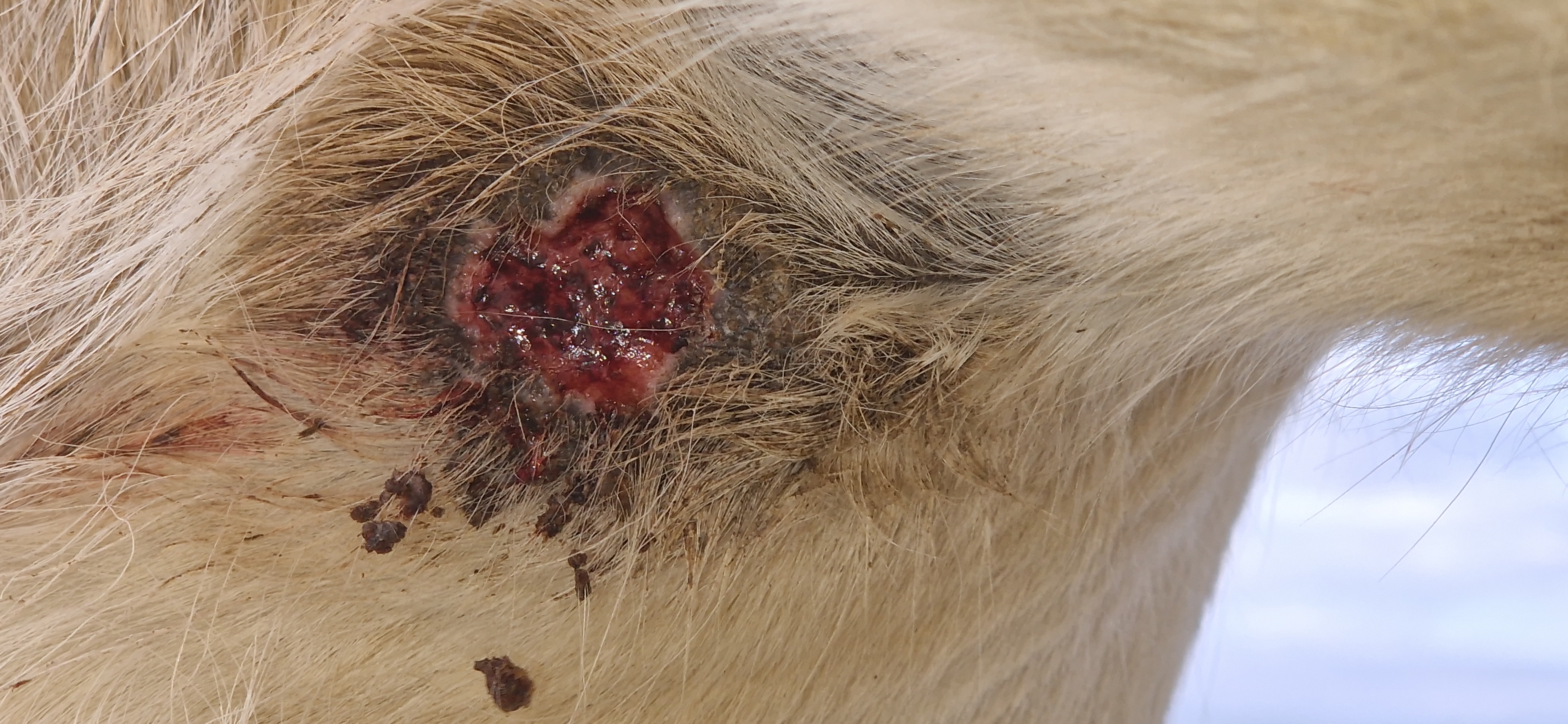 Die Schmierfront sieht aktuell so aus...ich denke, es ist noch Restgewebe vorhanden. Wir machen weiterhin täglich Salbe drauf, allerdings weiss ich nicht mehr welche Zusammensetzung sie hat. Hatte aus Versehen mal falsch gemischt..