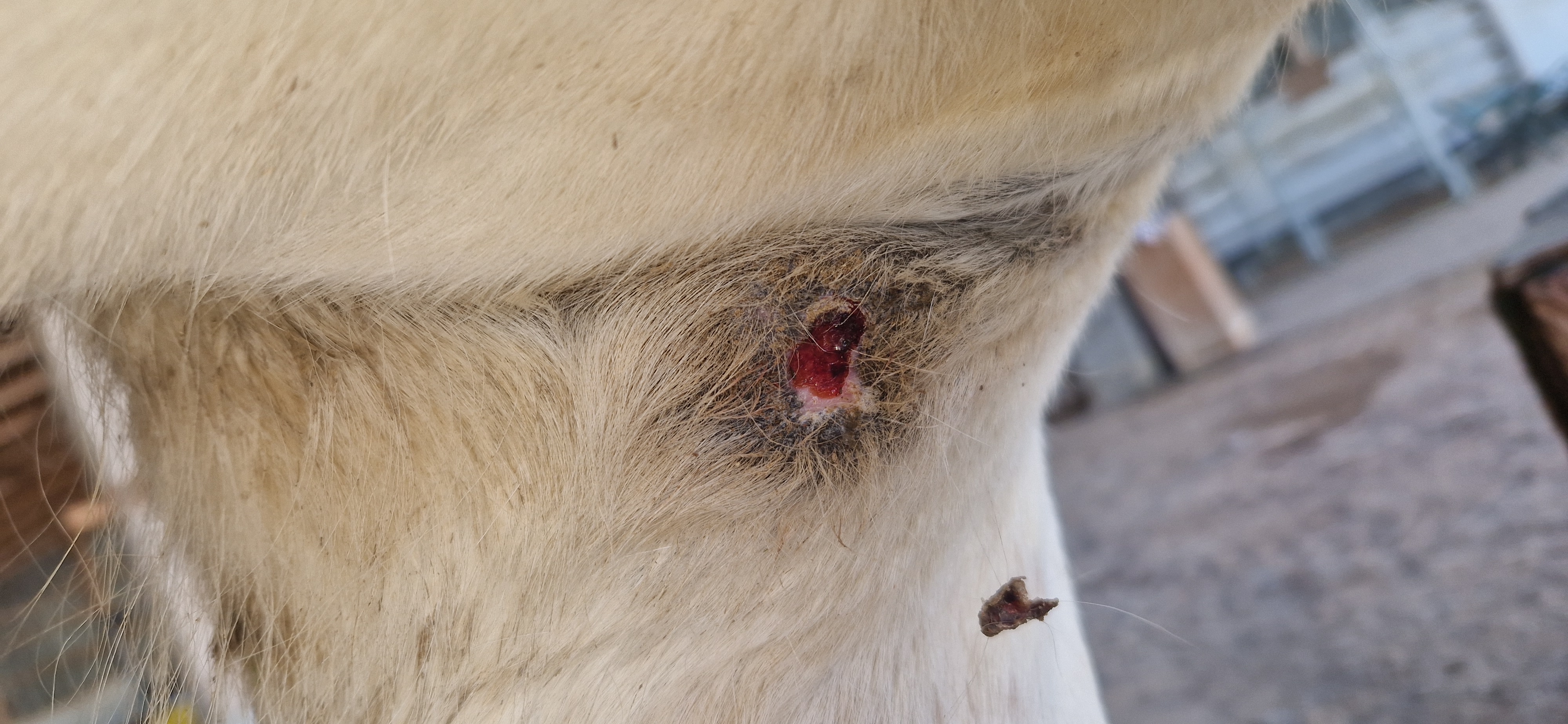 Die Schmierfront sieht aktuell so aus...ich denke, es ist noch Restgewebe vorhanden. Wir machen weiterhin täglich Salbe drauf, allerdings weiss ich nicht mehr welche Zusammensetzung sie hat. Hatte aus Versehen mal falsch gemischt..