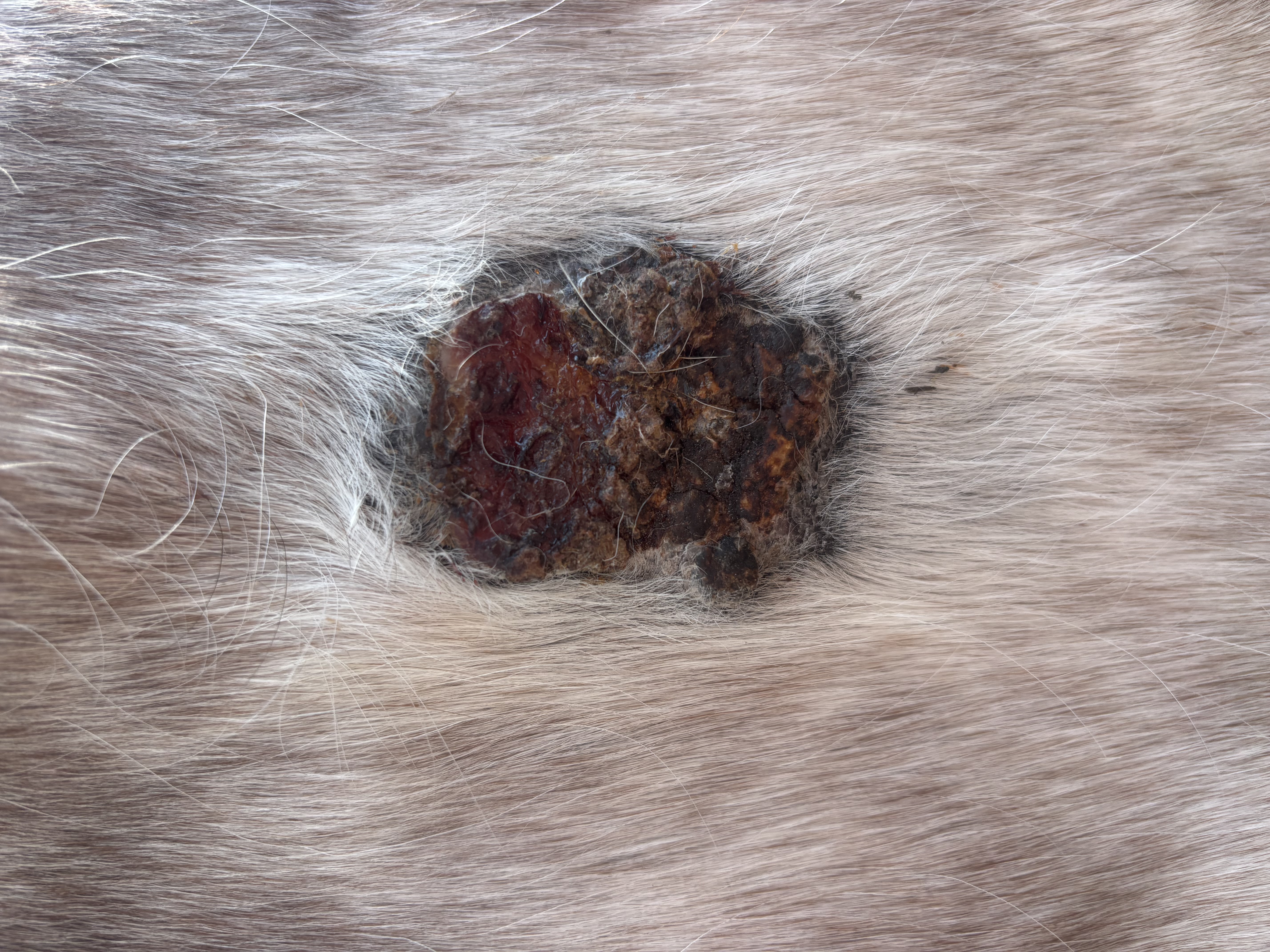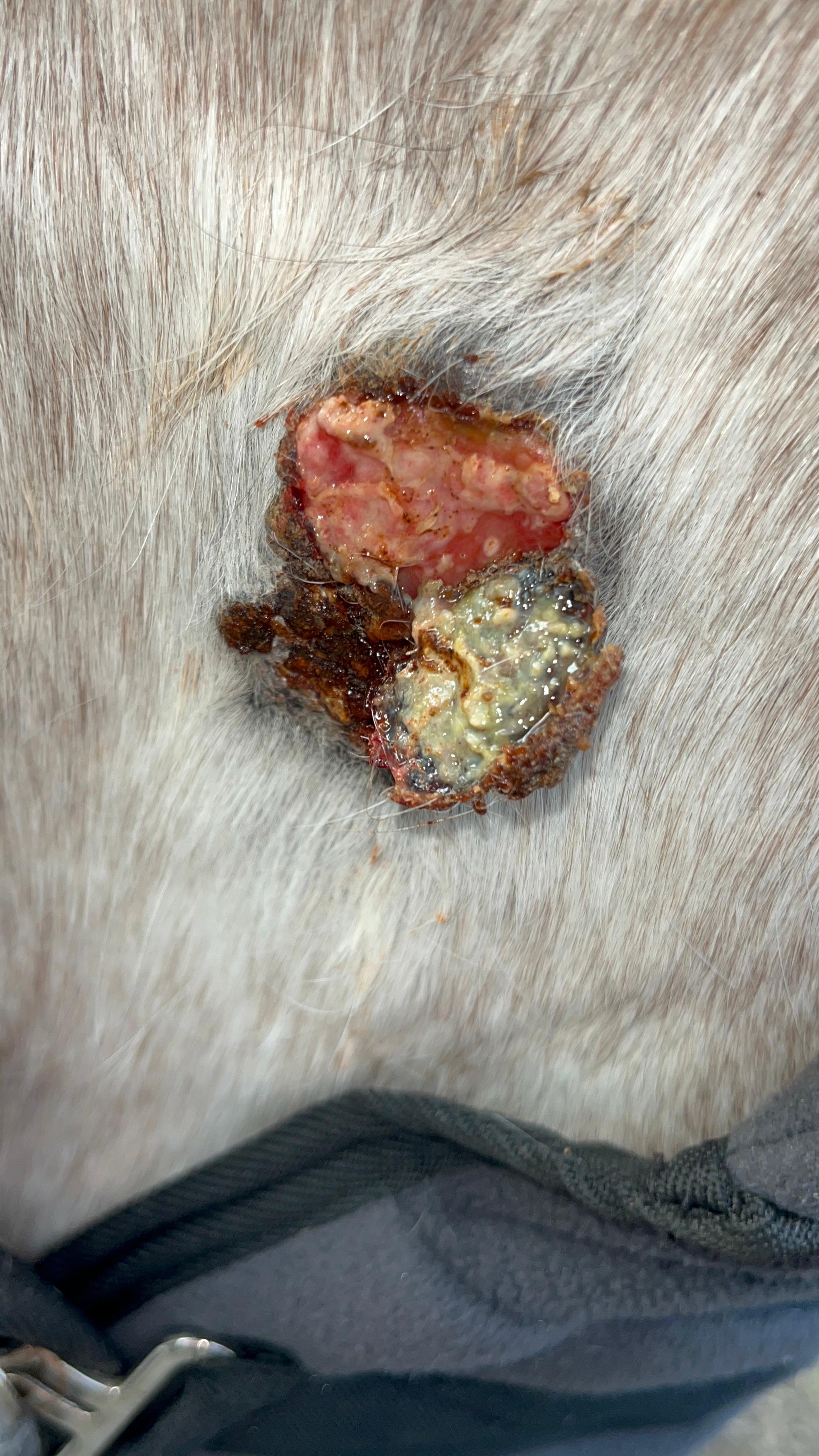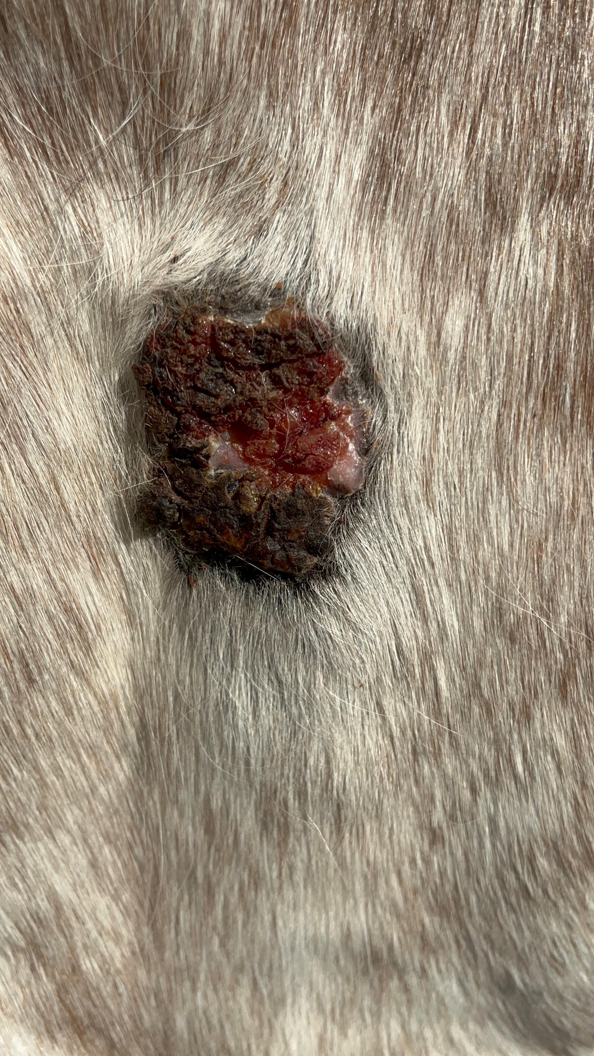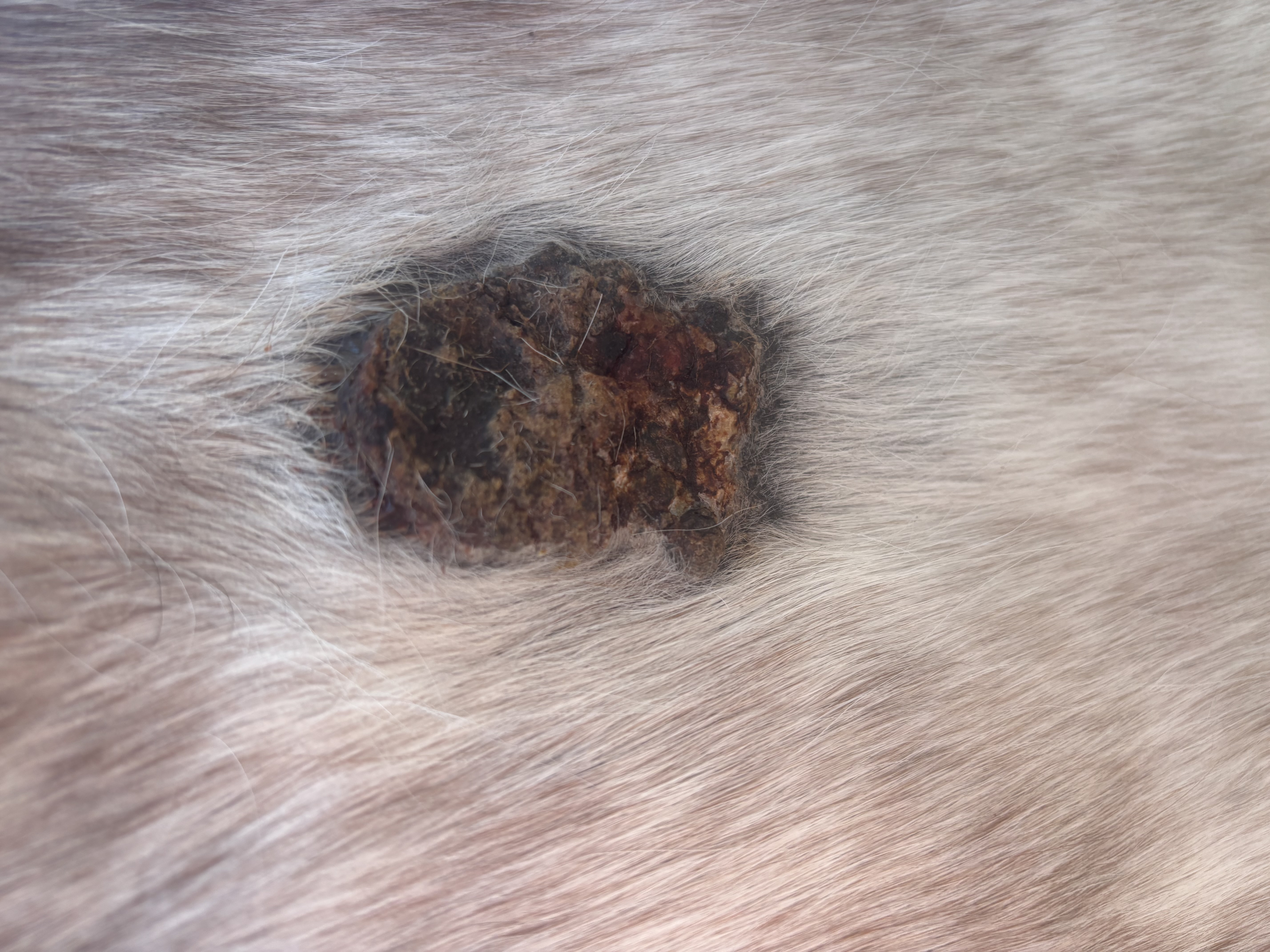 Die Bruste hatte unten noch Sarkoid in der flacheren Zone, oben hats immer wieder nur mal etwas drunter geblutet. Den oberen Bereich hab ich nur behandelt wenns aus ner Ritze raussiffte. Da hab ich dann etwas Salbe reingepackt wenns ging. Live ging dann vorgestern die obere Kruste ab von diesem Sarkoid & man sah drunter. Am Bild hängt die Kruste gerade herunter. Am nächsten Tag wars schon wieder getrocknet, der obere Teil wos offen war. Hab dann nur 1 Runde den unteren flachen Teil geschmiert (verdünnt mit Vaseline). Das ergab eine Kruste. Jetzt sieht man wieder 2 rosa Stellen aber die werden wohl auch Sarkoid noch sein? Mittig fiel was ab & seitlich scheint noch erhaben. Das ist Stand heute, Verlauf auch aufsteigend.
