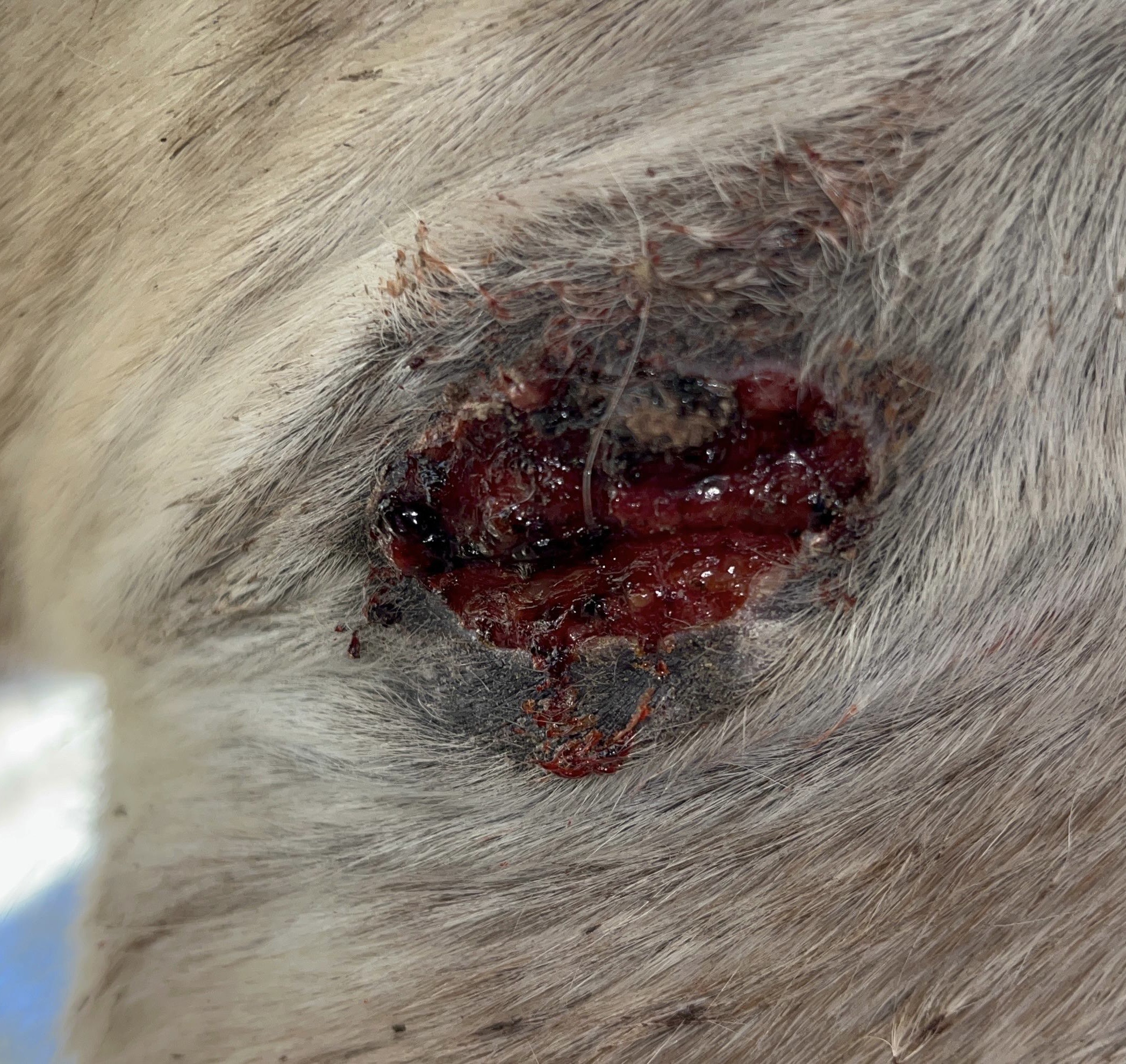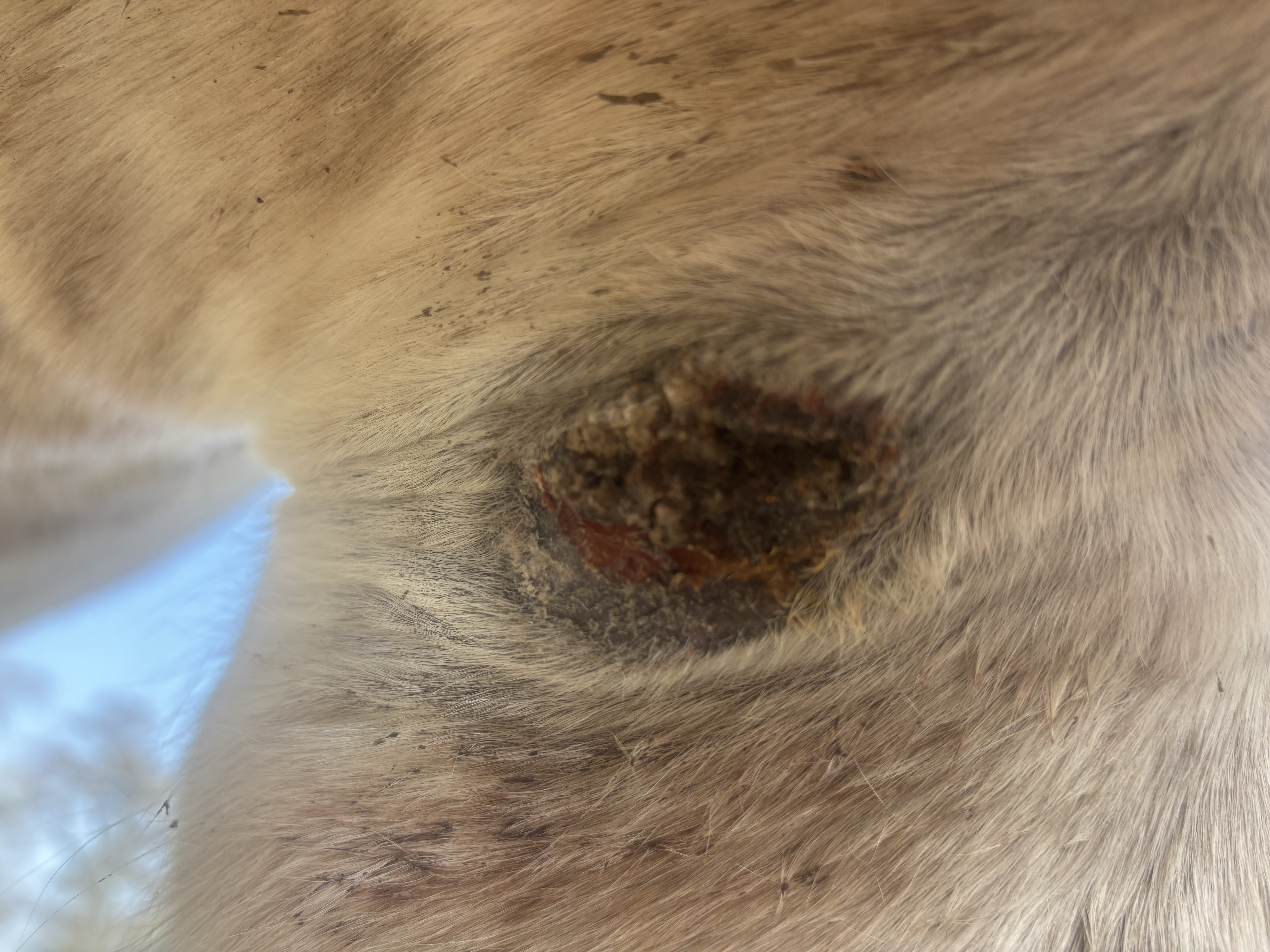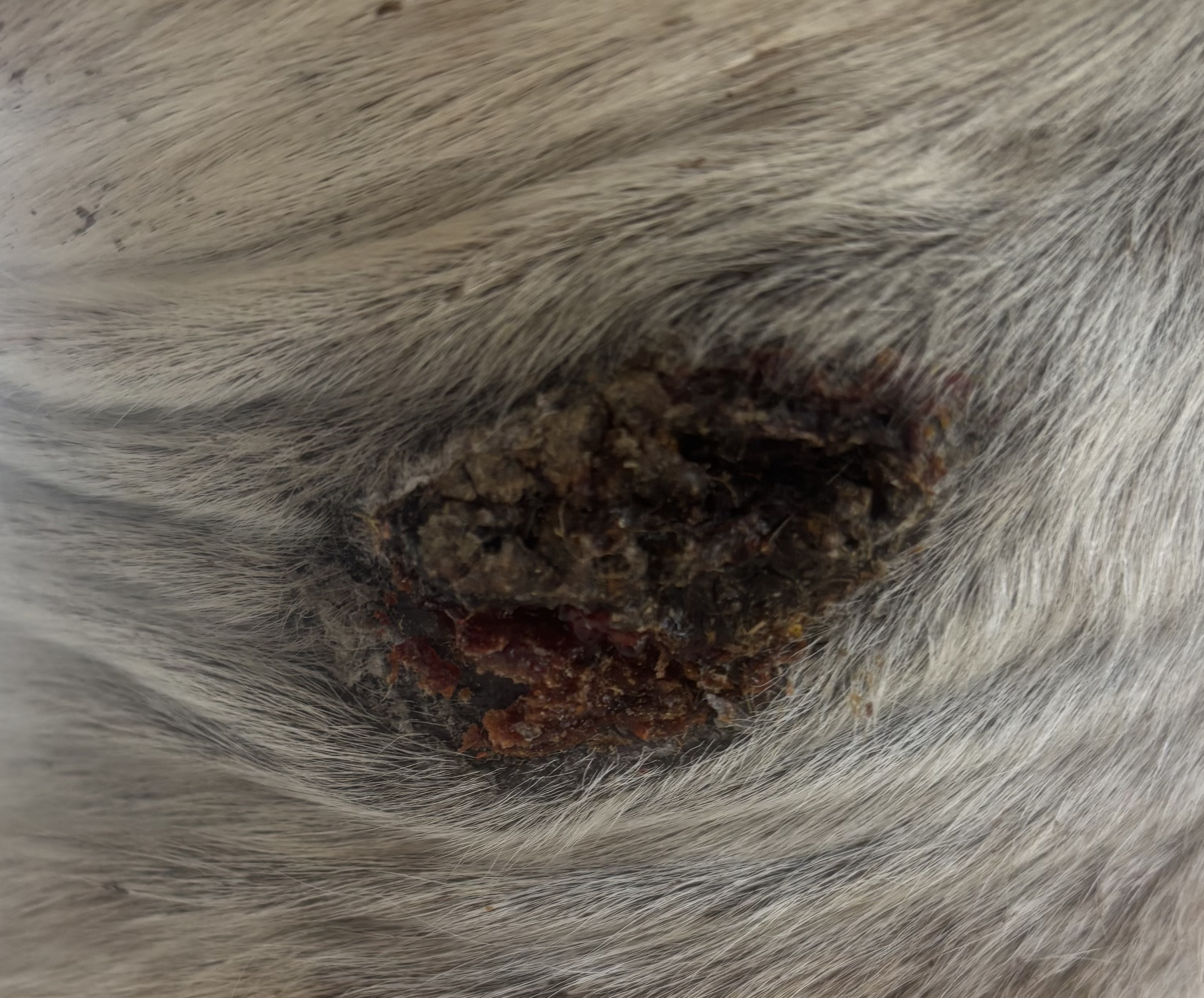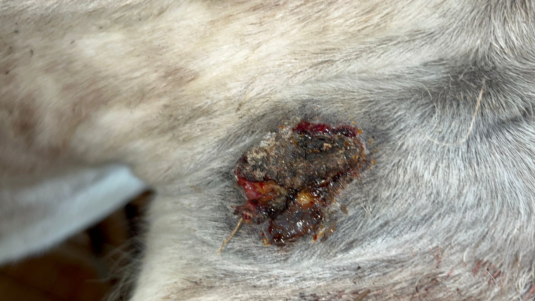 Die Bruste hatte unten noch Sarkoid in der flacheren Zone, oben hats immer wieder nur mal etwas drunter geblutet. Den oberen Bereich hab ich nur behandelt wenns aus ner Ritze raussiffte. Da hab ich dann etwas Salbe reingepackt wenns ging. Live ging dann vorgestern die obere Kruste ab von diesem Sarkoid & man sah drunter. Am Bild hängt die Kruste gerade herunter. Am nächsten Tag wars schon wieder getrocknet, der obere Teil wos offen war. Hab dann nur 1 Runde den unteren flachen Teil geschmiert (verdünnt mit Vaseline). Das ergab eine Kruste. Jetzt sieht man wieder 2 rosa Stellen aber die werden wohl auch Sarkoid noch sein? Mittig fiel was ab & seitlich scheint noch erhaben. Das ist Stand heute, Verlauf auch aufsteigend.
