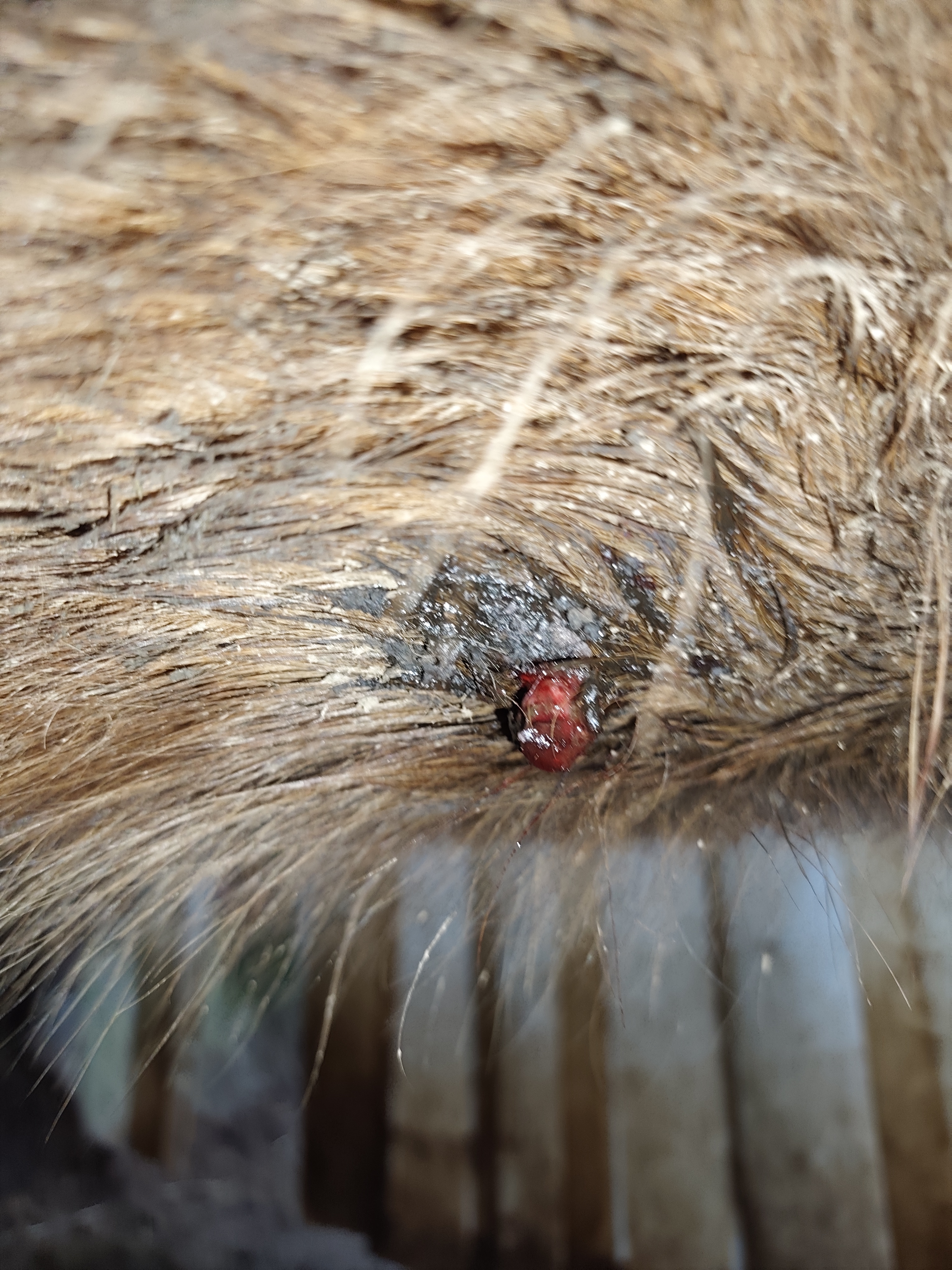 Im Winter 25 ist mir dann ein etwa Daumennagel großes, neues Sarkoid am Bauch aufgefallen. Es blieb lange unverändert, bis es letzte Woche nun plötzlich aufgegangen und nun blutig ist :(