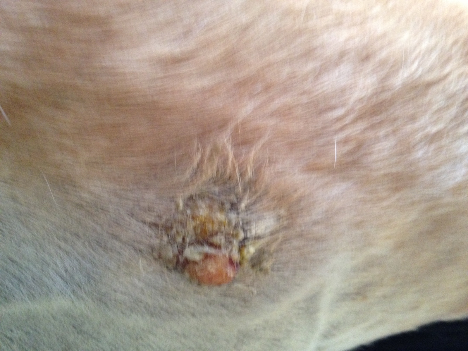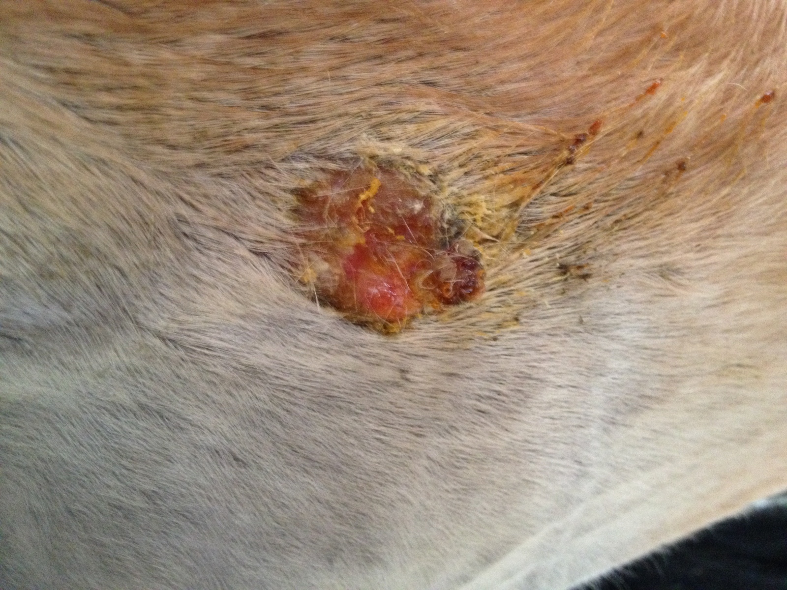 Der Knubbel der ja noch unter der Haut war ist so gut wie weg. Eine leichte Erhebung noch, die Haut ist gereizt und auch dort bildet sich Sekret was dazu geführt hat das oben am Hinterneininnenseite, die Haut gereizt ist und auf geht.