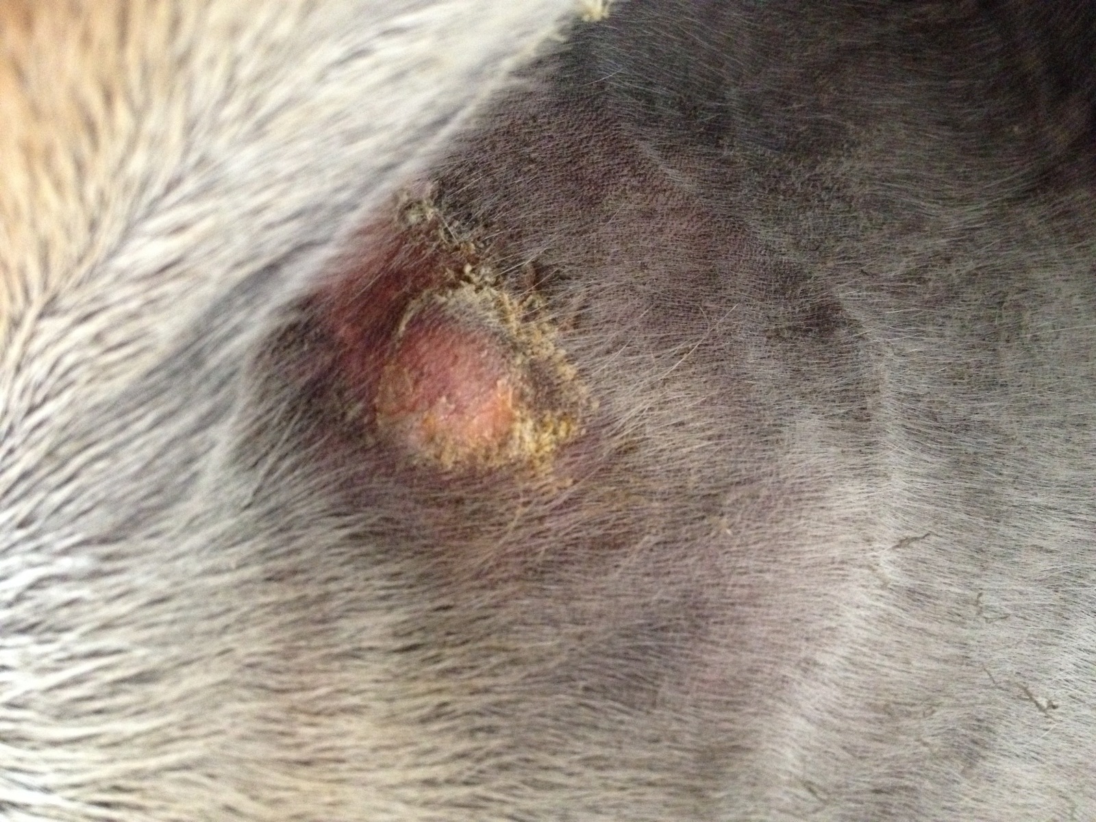 Aktuell hat sich auf dem ersten Sarkoid (Hinterbein) eine Kruste gebildet und es scheint meiner Stute auch unangenehm zu sein wenn ich dort dran gehe.