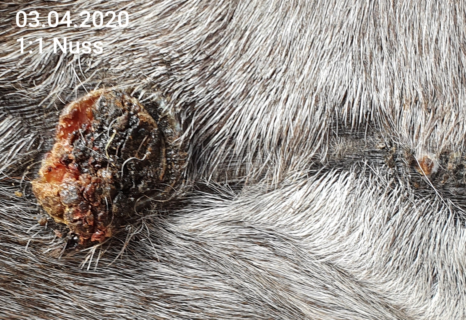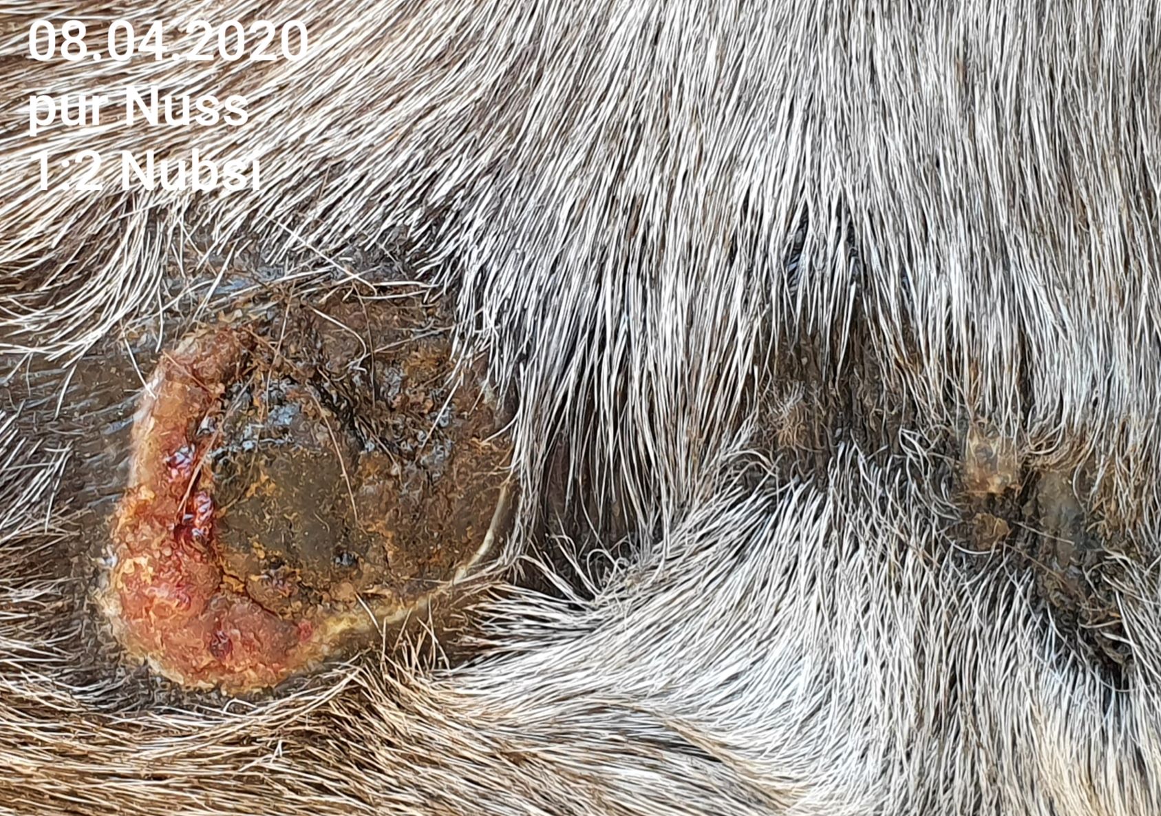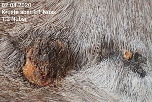 Wir arbeiten uns Tag für Tag weiter durch. Immer wenn ich der Ansicht bin, endlich eine anständige Kruste zu erzeugen, entledigt sich mein Herr Hengst der Kruste. Die eigentliche Nuss ist sehr hartnäckig und immer noch klar abgegrenzt und durchpigmentiert. Die Nuss wird seit heute mit CompX pur geschmiert. Das sogenannte Spiegelei (Fläche aussen um Nuss) sieht ohne Kruste manchmal gar nicht wie Sarkoidgewebe aus, dieses schmiere ich meist verdünnt (1:2 / 1:3). Der kleine Nubsi rechts hat wieder eine kleine Kruste verloren. Bekommt auch immer noch mal verdünnt (Finger anwischen) etwas ab. Die Haut um Nubsi pigmentiert sich immer weiter nach. Ich bin gespannt, wie es sich entwickelt. Ich hoffe, ich mache alles richtig und der Verlauf ist ok?