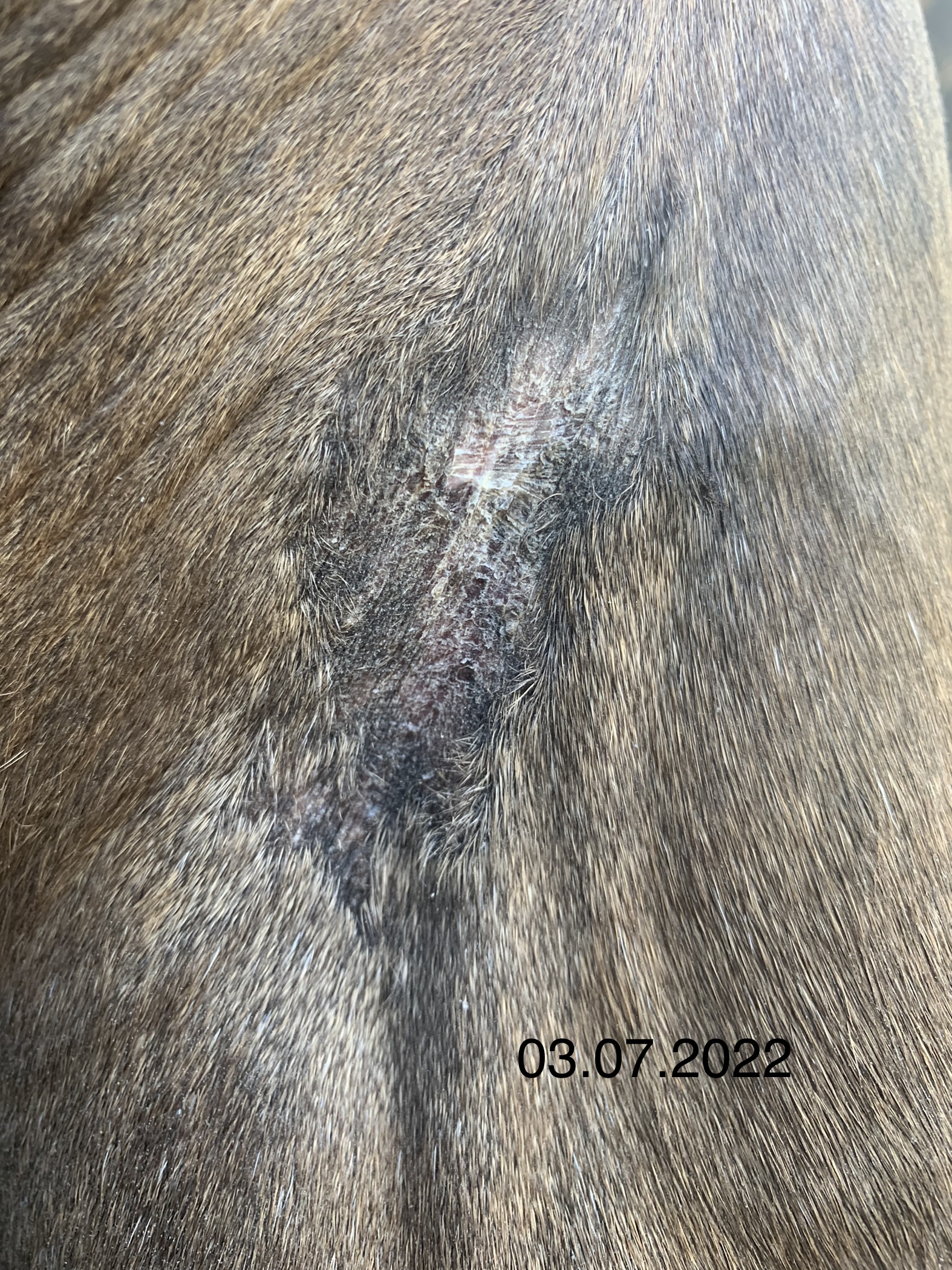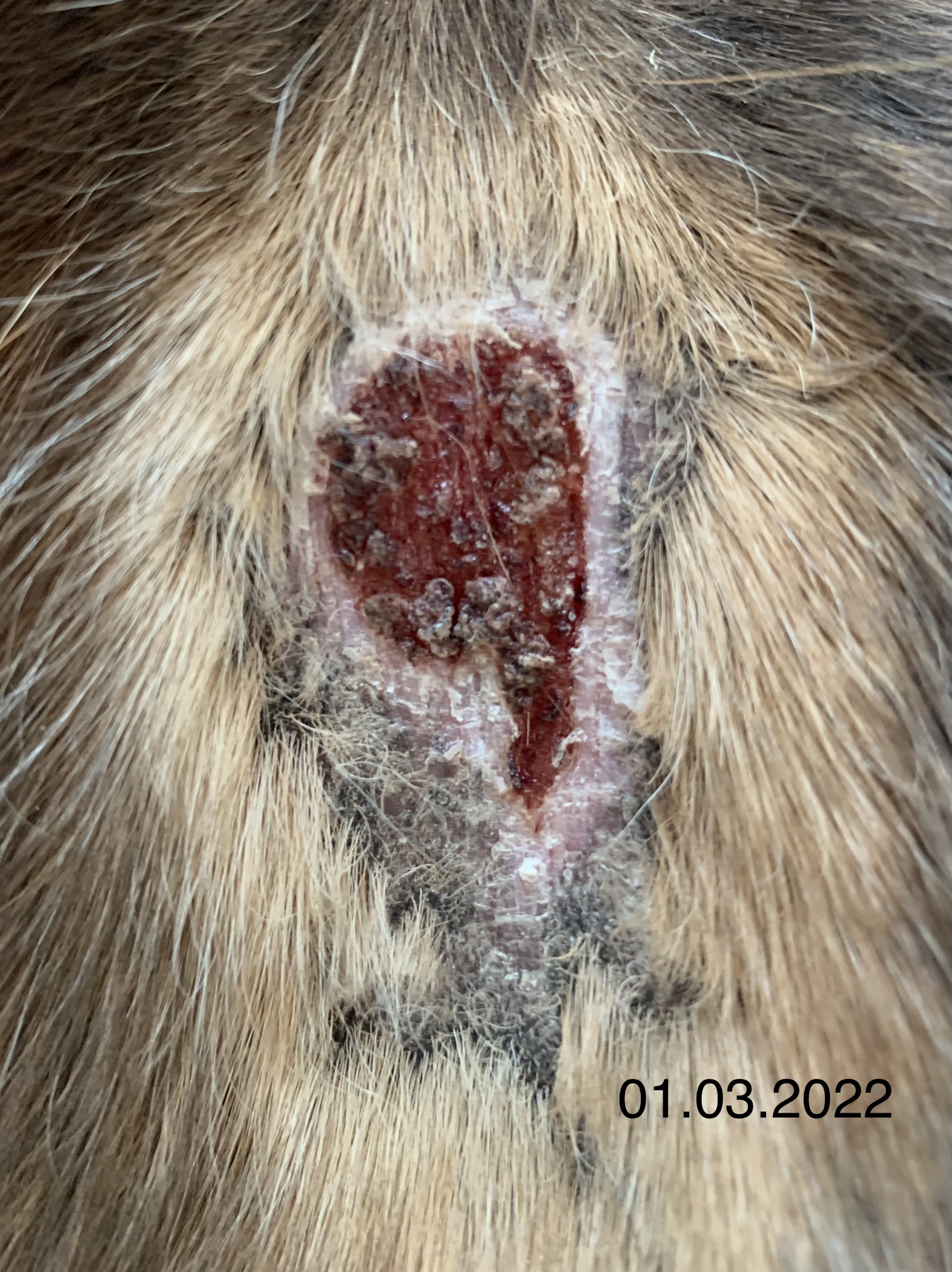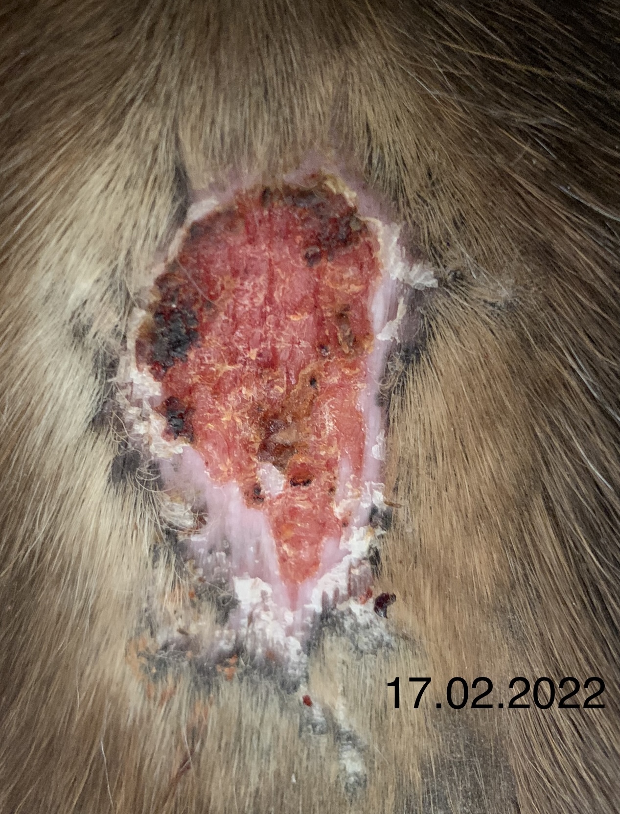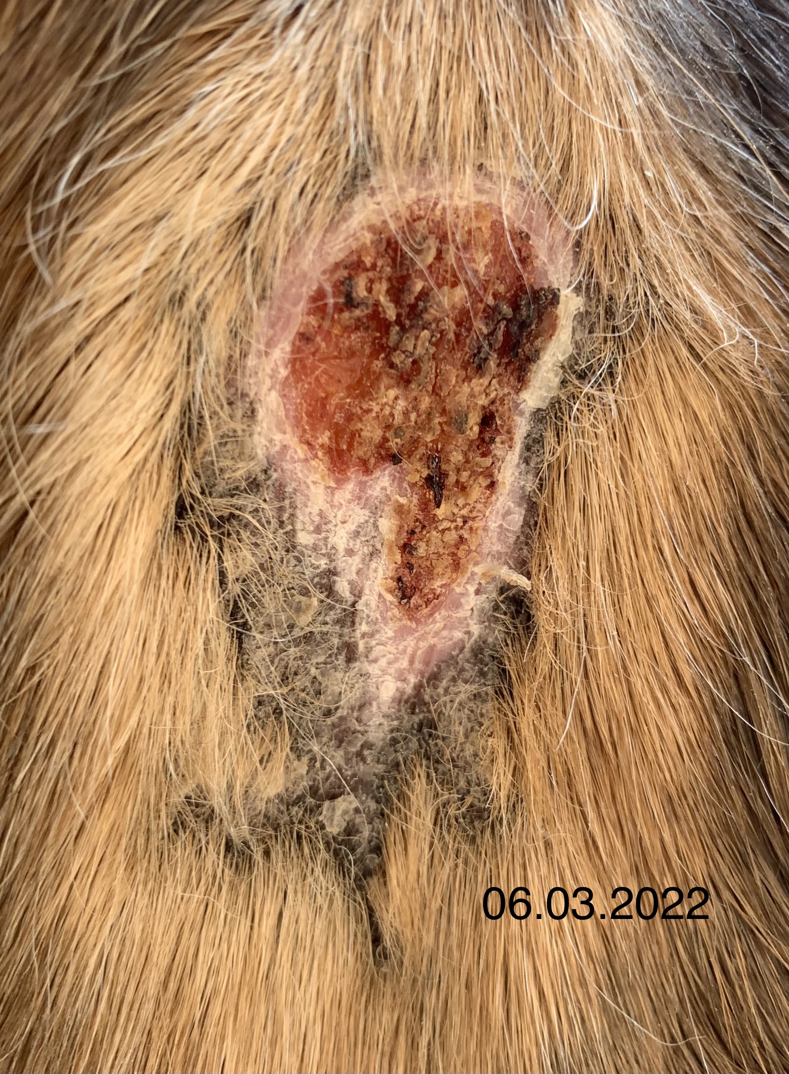 Wie man auf den Fotos hoffentlich gut erkennen kann, habe ich getreu dem Motto „viel hilft viel“ tatsächlich zu viel Produkt auf das Sarkoid gegeben, so dass auch umliegend das Fell ausfiel. Das umliegende Gewebe war allerdings nur einmal etwas angeschwollen, was nach einem Tag Pause sofort wieder weg war. Der schwierigste Step für mich war, nicht mehr täglich zu schmieren sondern Pausen einzulegen und diese dann sogar zu verlängern. Aber letztlich war es genau das, was zum Abheilen beigetragen hat.