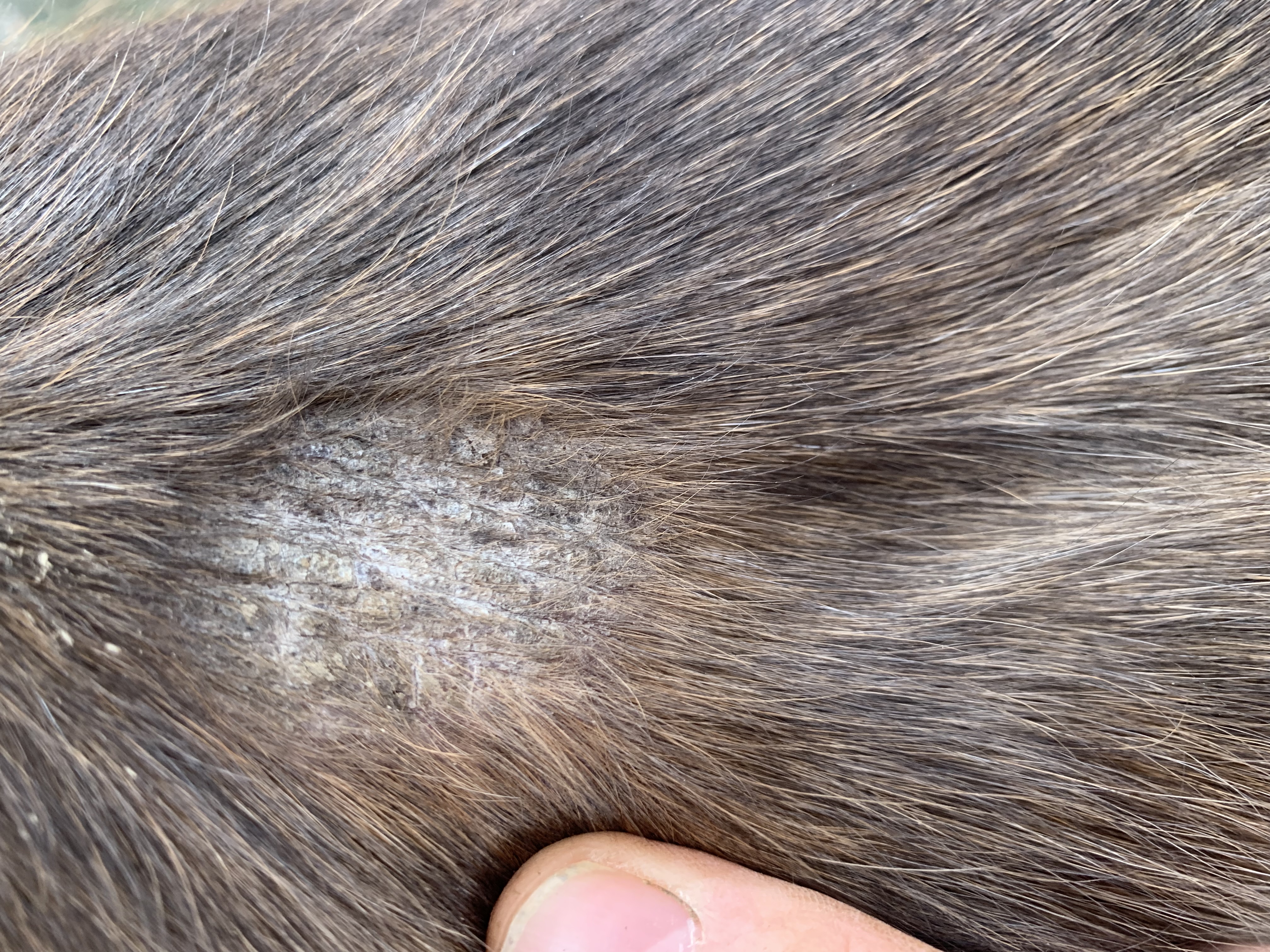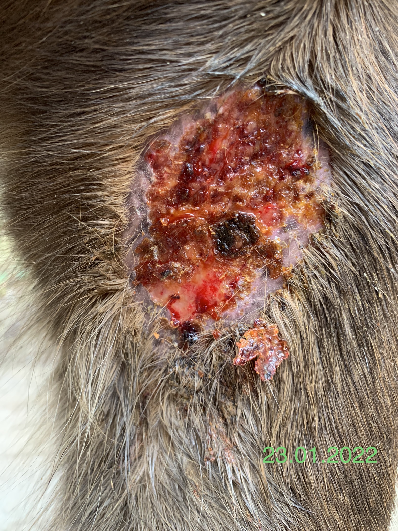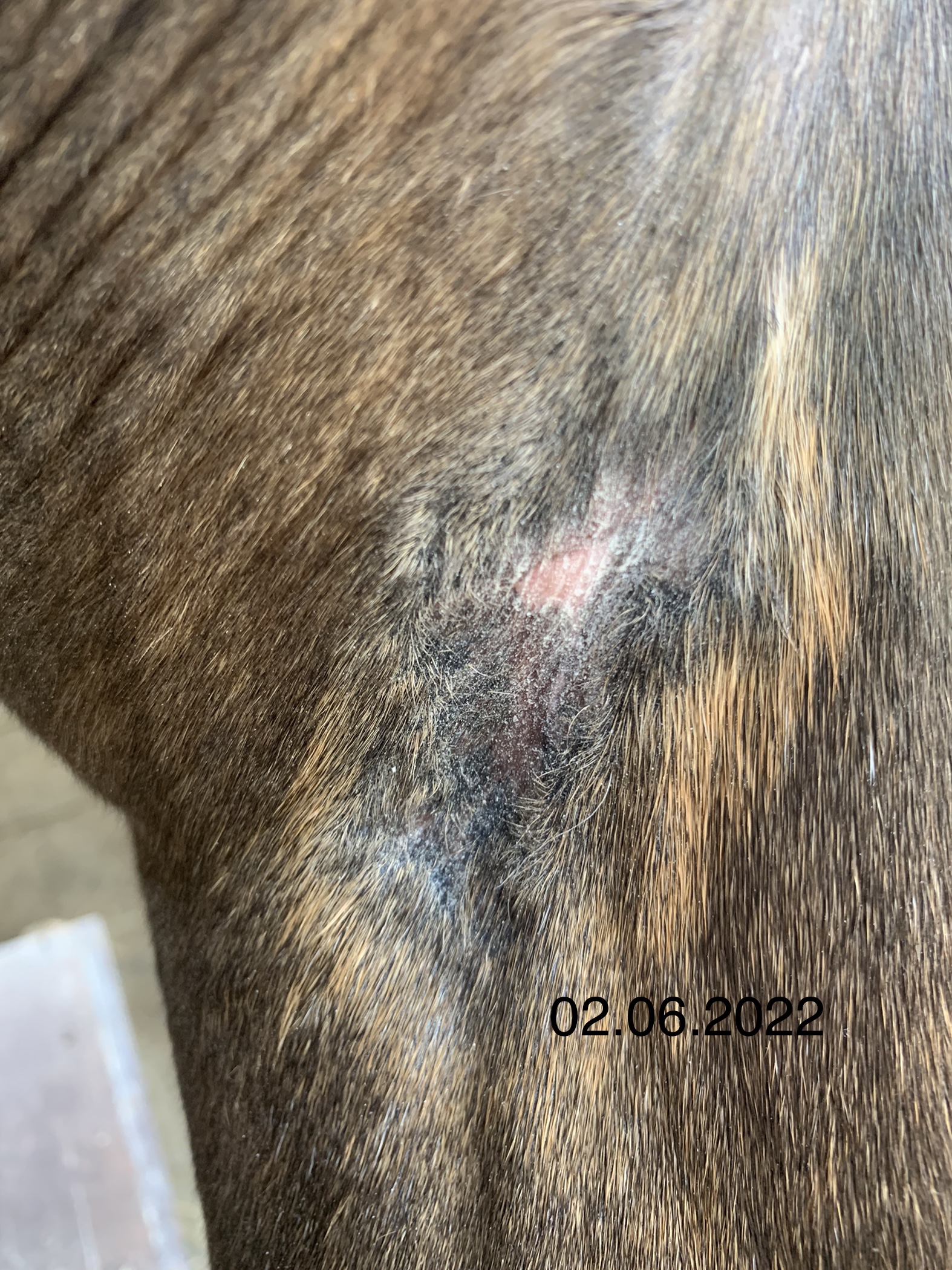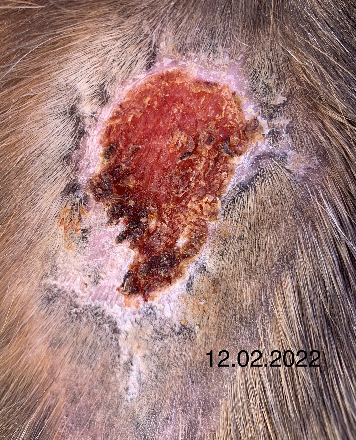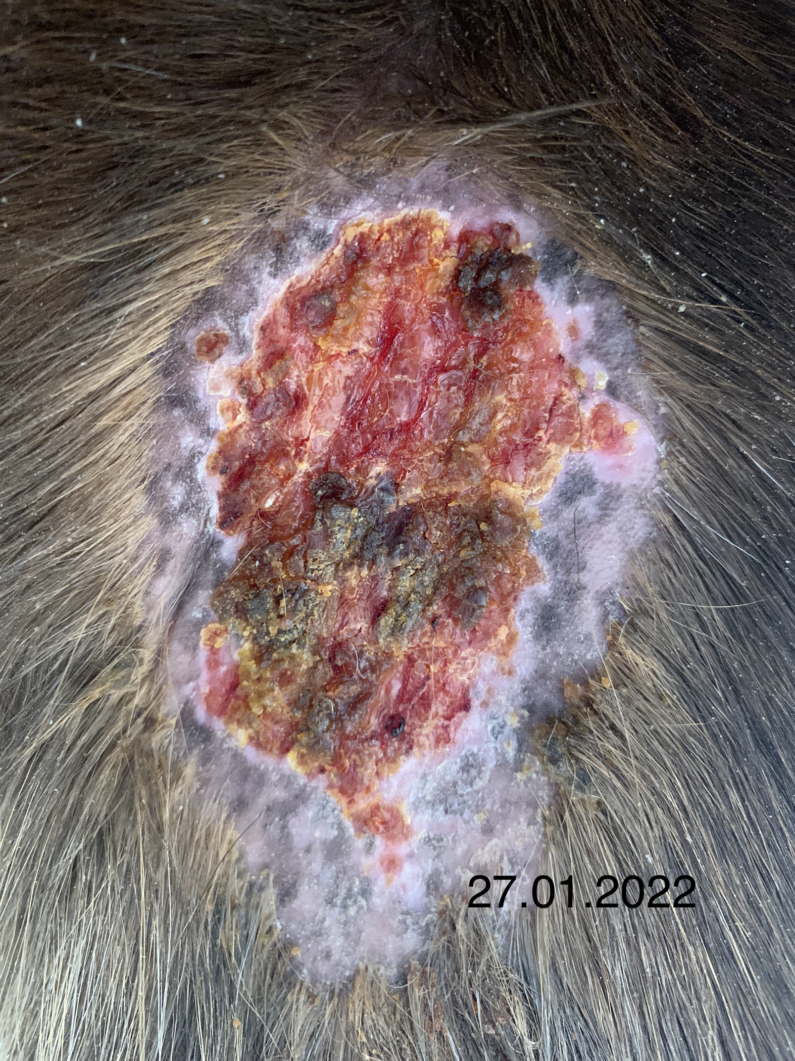 Wie man auf den Fotos hoffentlich gut erkennen kann, habe ich getreu dem Motto „viel hilft viel“ tatsächlich zu viel Produkt auf das Sarkoid gegeben, so dass auch umliegend das Fell ausfiel. Das umliegende Gewebe war allerdings nur einmal etwas angeschwollen, was nach einem Tag Pause sofort wieder weg war. Der schwierigste Step für mich war, nicht mehr täglich zu schmieren sondern Pausen einzulegen und diese dann sogar zu verlängern. Aber letztlich war es genau das, was zum Abheilen beigetragen hat.