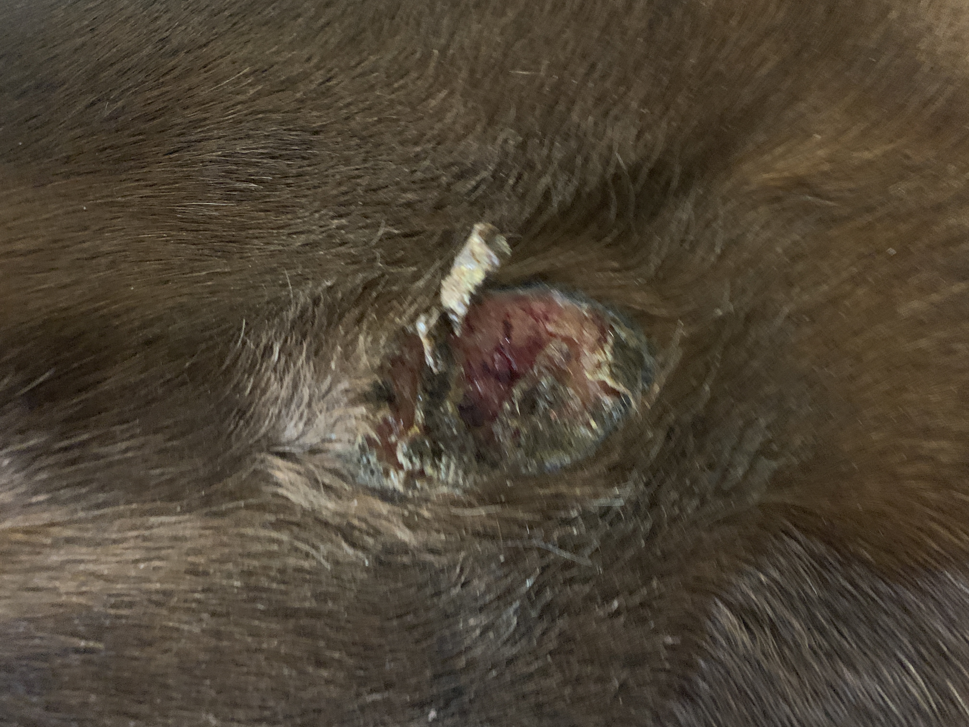 Wir haben das Gefühl es ist weniger dick. Aber immer noch Plattenartig. Es ist definitiv größer und es juckt ihn sehr, denn er kratzt sich daran sobald es geht.