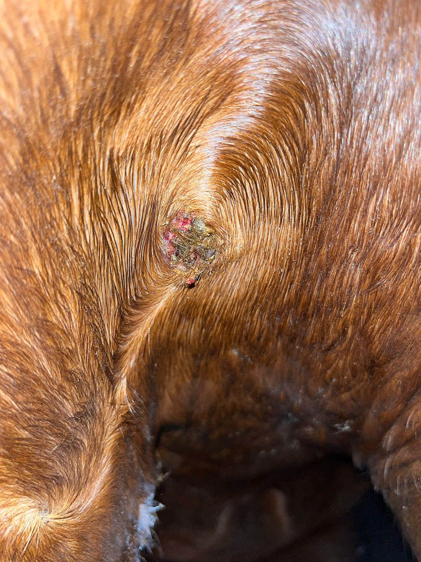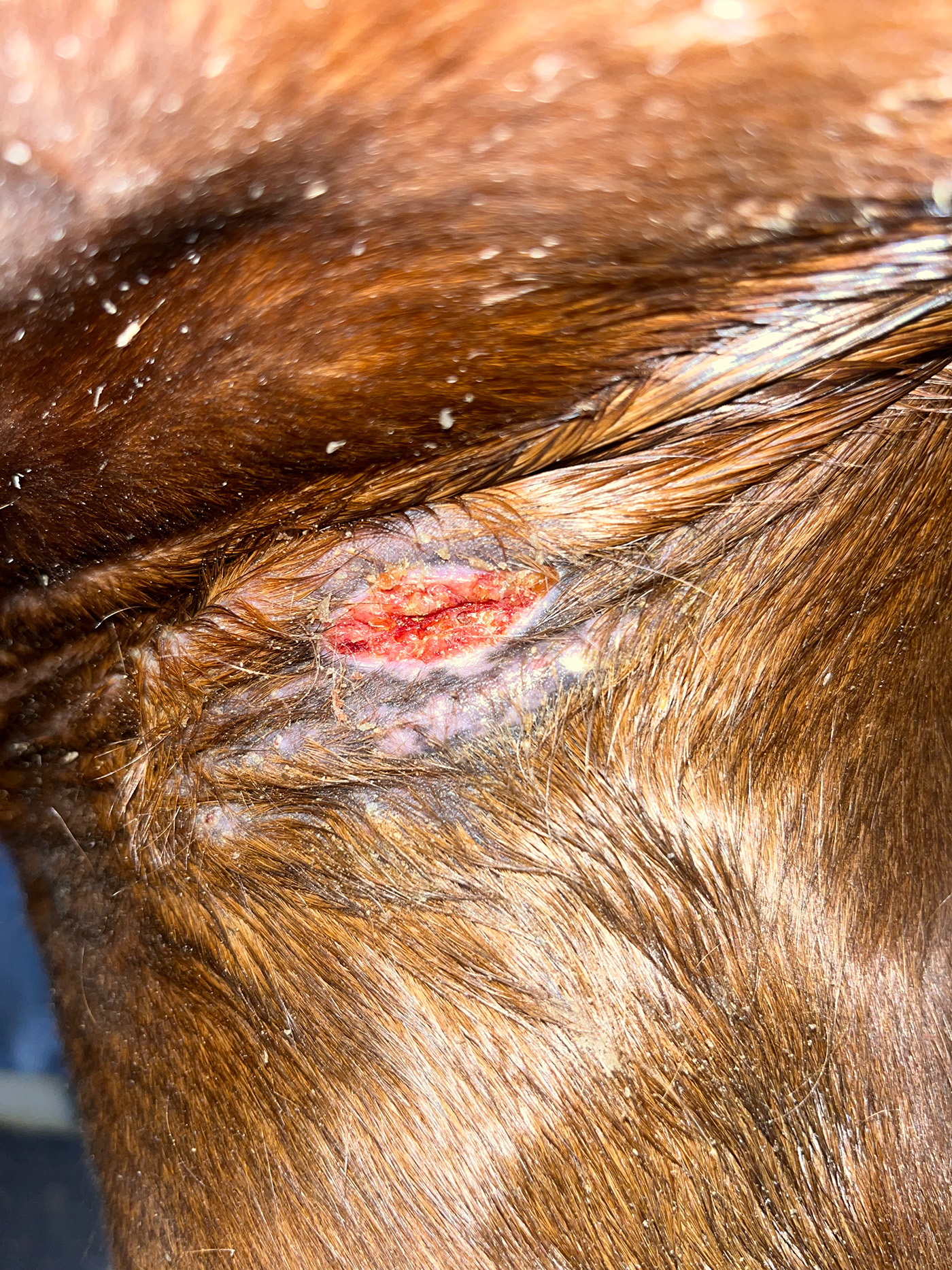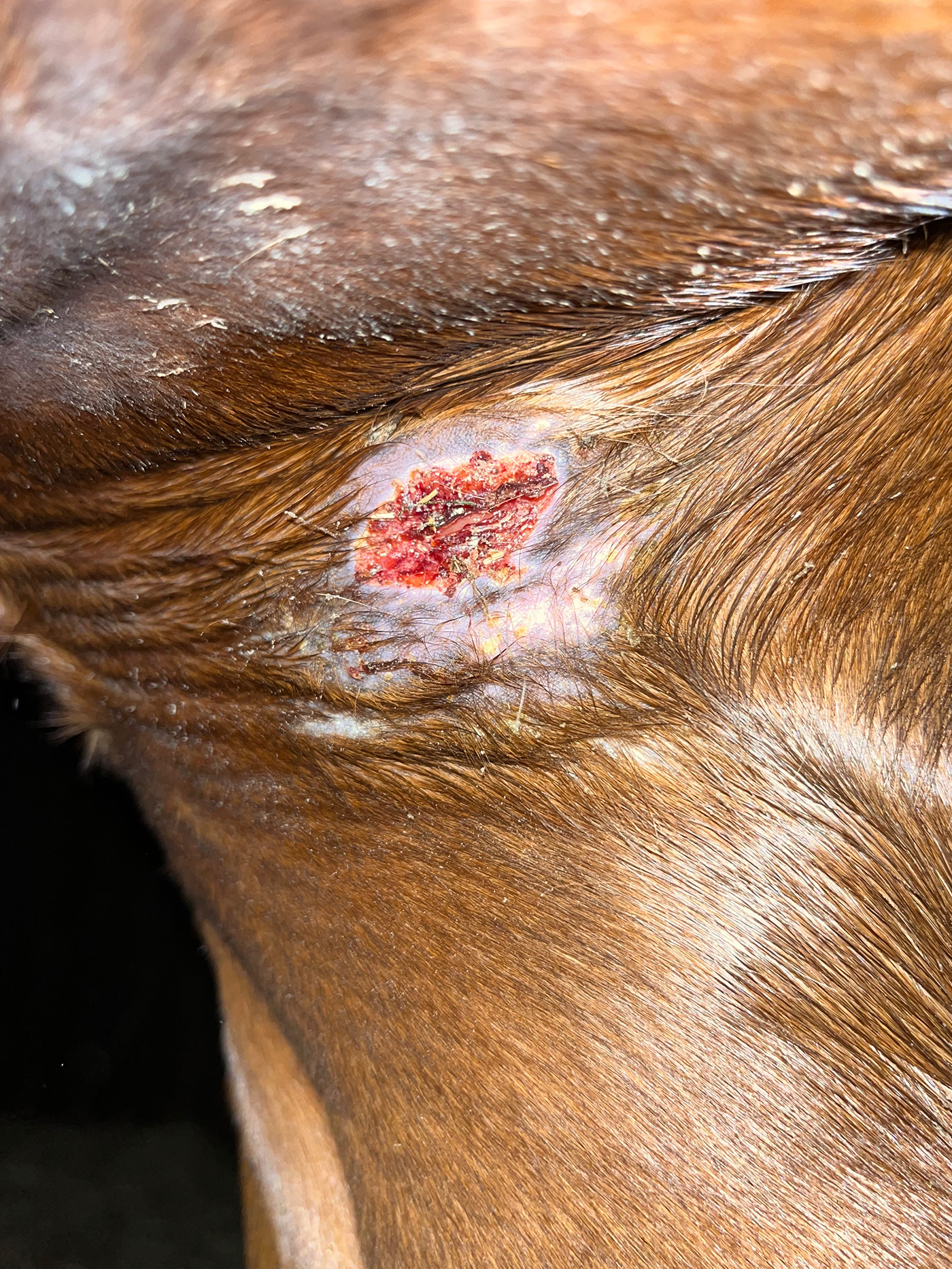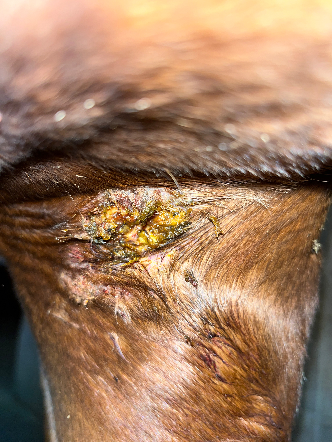 Es ist alles ziemlich verklebt und siffig. Kann/soll ich versuchen, das Bein um das Sarkoid rum etwas sauber zu machen und die Haare. die jetzt mit den Wundrändern verklebt sind, abzuschneiden?