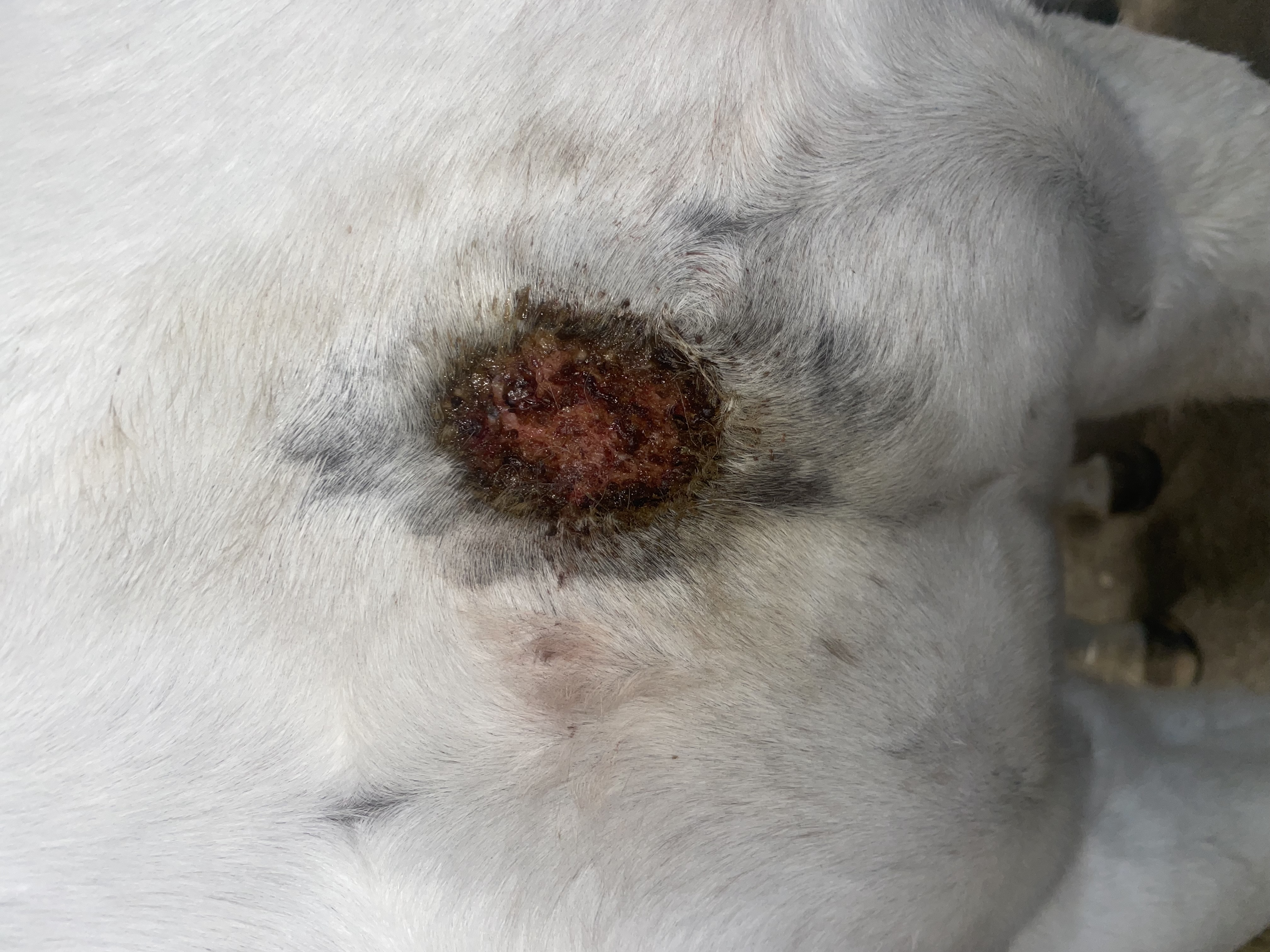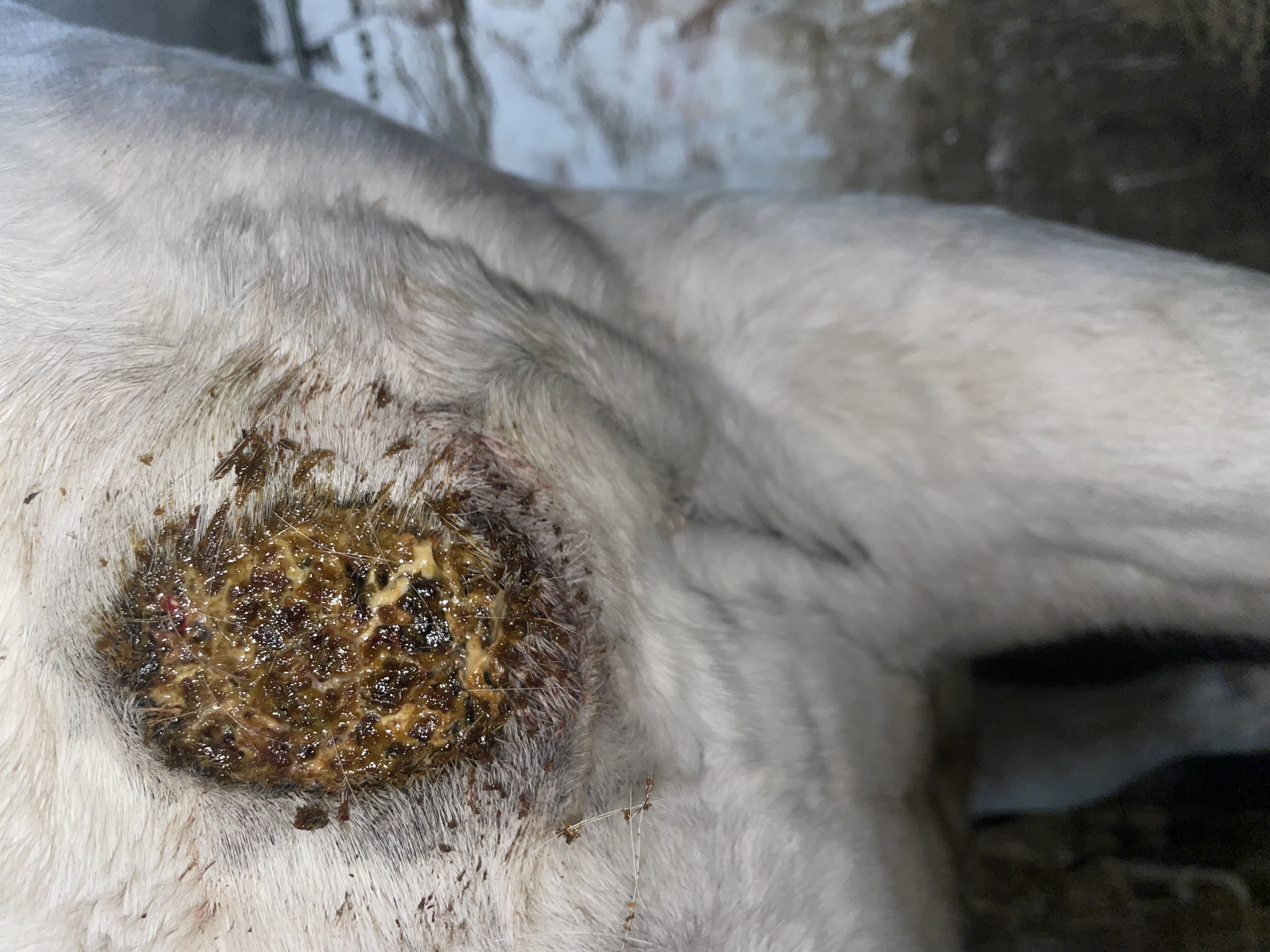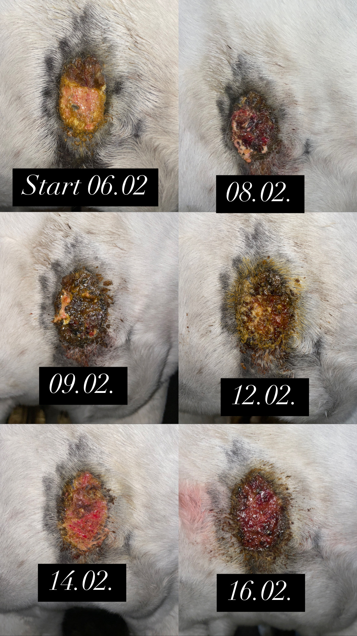 Habe jetzt 1:3 geschmiert die letzten Tage, heute dann ganz dünn 1:1 weil gestern hatte die Kruste schon gekrümelt und heute war die Oberfläche des Sarkoids entsprechend glatt dass ich ganz dünn 1:1 auftragen kann und ich habe auch etwas Zeit am Stall mitgebracht wir haben keine Halle und alles ist glatt. Draußen zu laufen = fast unmöglich. Gut dass die Pferde heil von der Koppel in den Stall gelangen … von daher war jetzt immer meine Devise: Pferd Links und Rechts im Gang anbinden sehr kurz. Sie macht null Anstalten da irgendwie bei zu gehen … Mal sehen wie es unter 1:1 heute sein wird